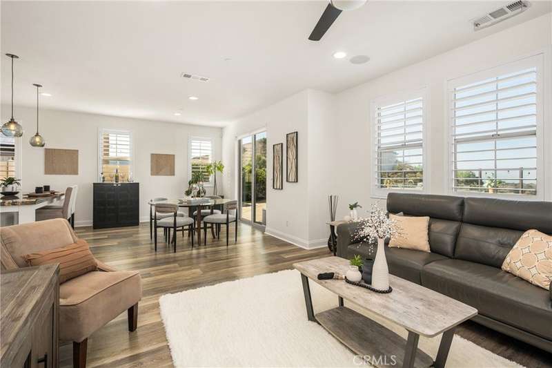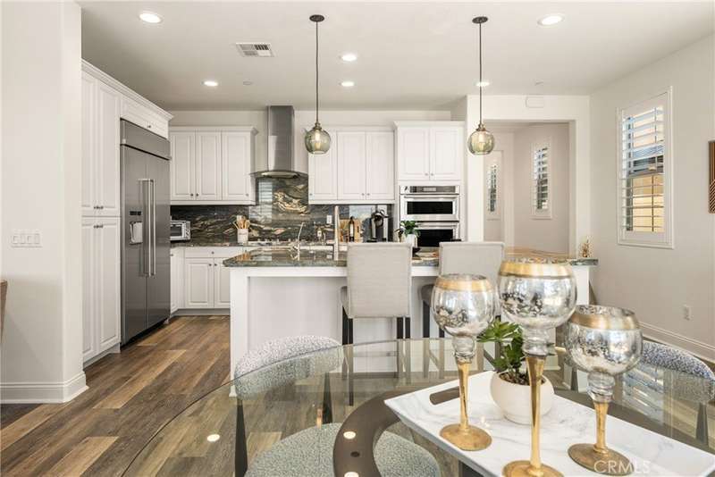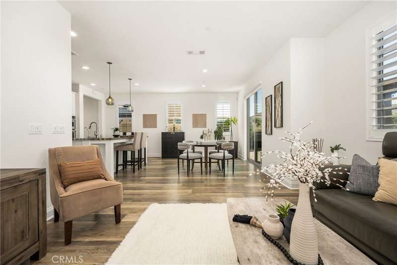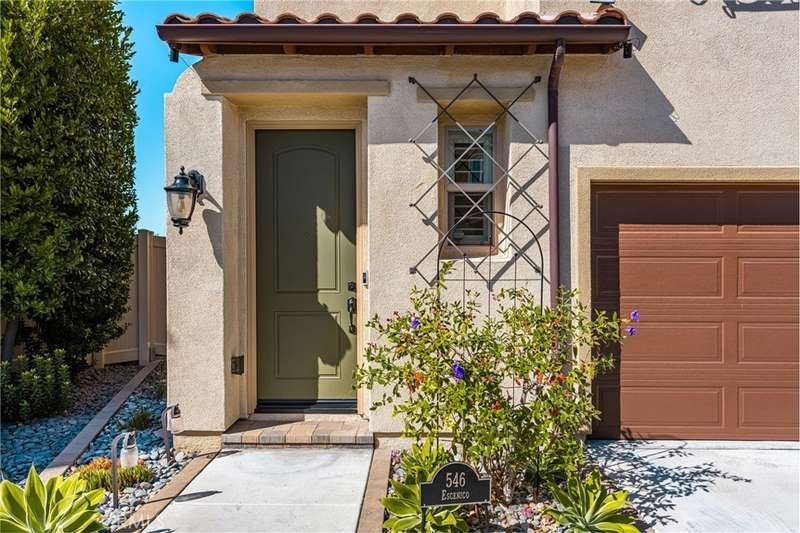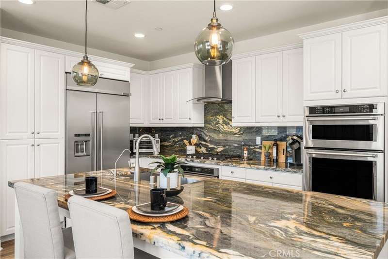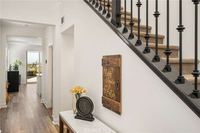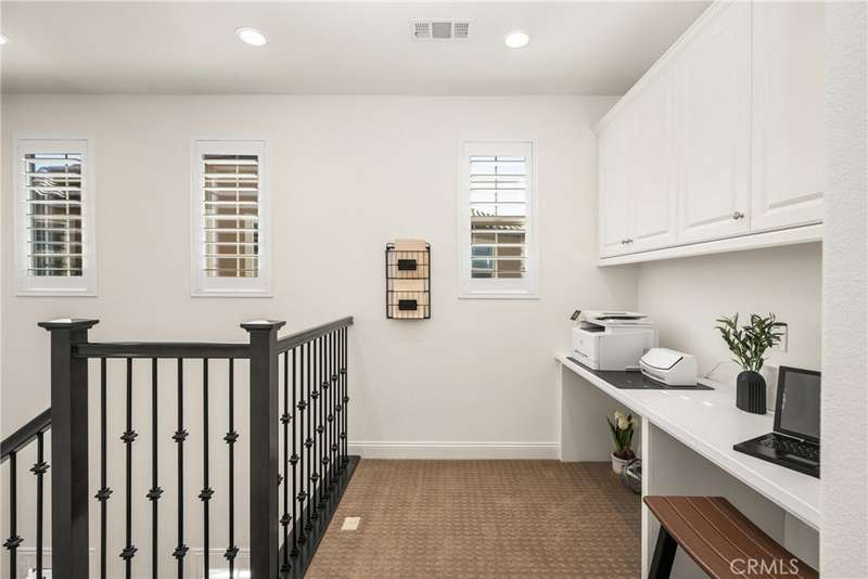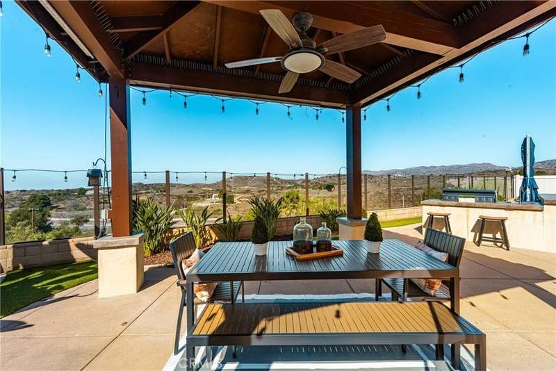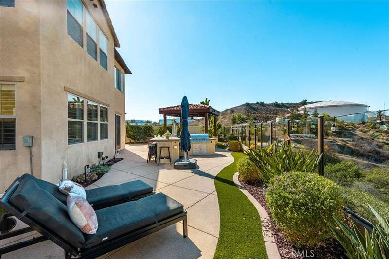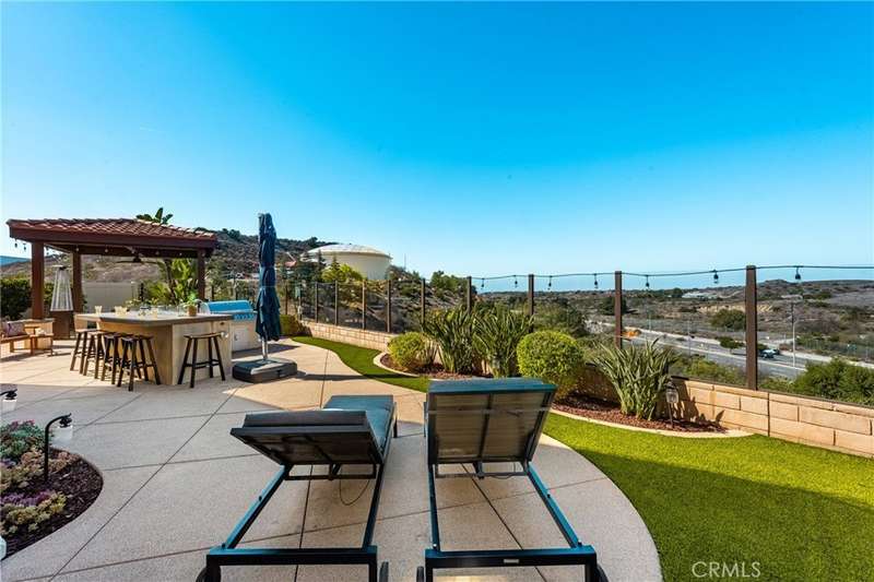 Panoramic canyon and sunset views define this modern Lake Forest residence, where contemporary design and thoughtful upgrades come together to capture the essence of California living. Every detail—from the light-filled entryway and elegant wrought-iron staircase to the open-concept layout—reflects sophisticated comfort and timeless appeal. At the heart of the home, the chef’s kitchen showcases a full backsplash, extended island with seating, custom cabinetry, and chic pendant lights that create a warm evening ambiance. The kitchen opens seamlessly to the dining and living areas with luxury vinyl plank flooring, plantation shutters, and effortless flow to the entertainer’s backyard. Step outside to a resort-style retreat overlooking rolling hills and glowing sunsets, complete with a built-in BBQ with sink, fire table, and covered cabana surrounded by beautiful turf—perfect for relaxing mornings or lively weekend gatherings. On the side of the home, a private dog run with its own shaded gazebo adds charm and function for pet owners. Upstairs, a stylish loft with built-in cabinetry and a custom desk offers the perfect setting for a home office, reading nook, or study space. All three bedrooms are conveniently upstairs, including a serene primary suite that frames hillside views and features a spa-inspired bath with dual sinks, a soaking tub, glass-enclosed shower, and spacious walk-in closet. Additional bedrooms are bright and inviting—one currently used as a fitness office—and share a full bath with dual vanities and modern finishes. A spacious laundry room with added cabinetry completes the upper level. Blending style and efficiency, the home also features a solar energy system, tankless water heater, water softener with reverse osmosis, ceiling fans, a living room surround speaker system, and an epoxy-finished garage. Every detail has been designed for comfort and convenience, from the 32 plantation-shuttered windows to the organized closets and cabinetry throughout. Ideally located near parks, trails, and award-winning schools—and just minutes from shopping, dining, and entertainment—this Encanto view home delivers the perfect balance of luxury, security, and modern California living. Enjoy all the benefits of life inside Encanto, Lake Forest’s premier gate-guarded community with serenity, sophistication, and style.