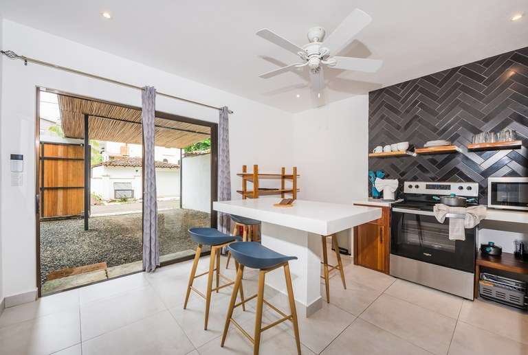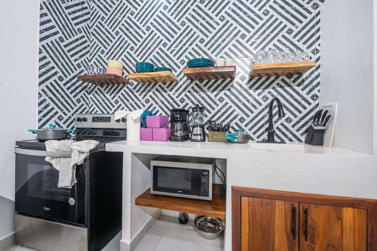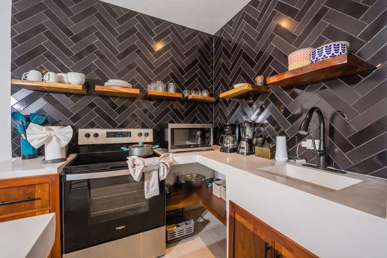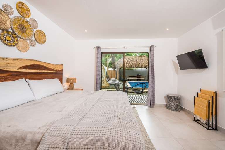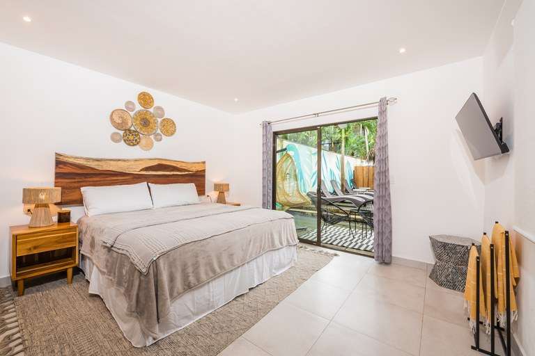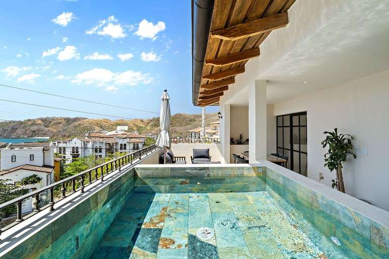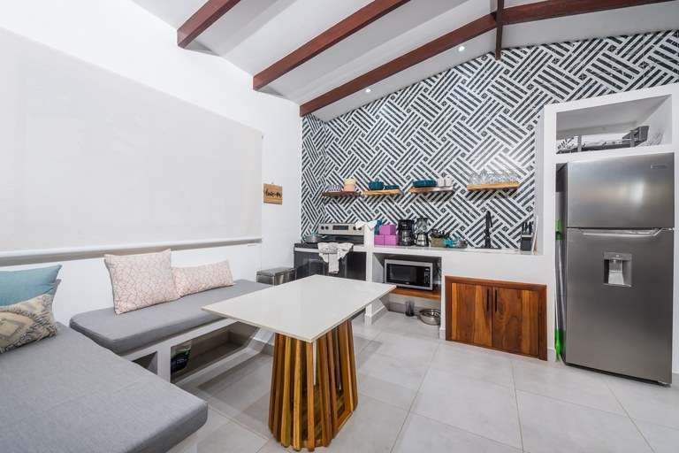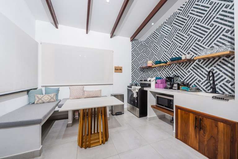 A separate two-story building adds yet more flexibility and income potential. The ground floor unit is a 40 m2 apartment complete with a king bedroom, bathroom, and a combined kitchen and living space. Above it, a stylish 40 m2 studio opens onto a private terrace with partial ocean views, offering the perfect vantage point to enjoy sunsets over Playa Potrero.