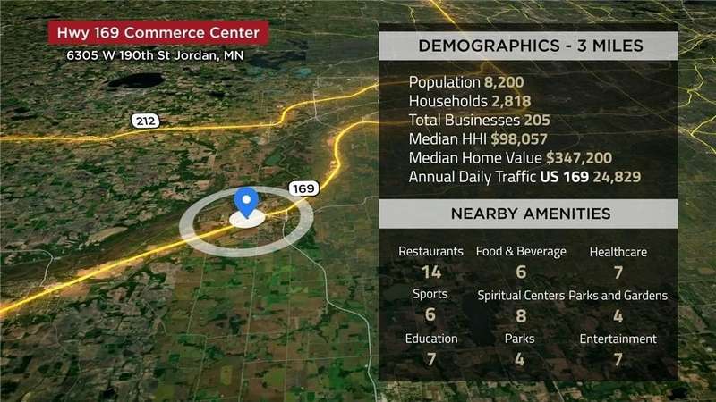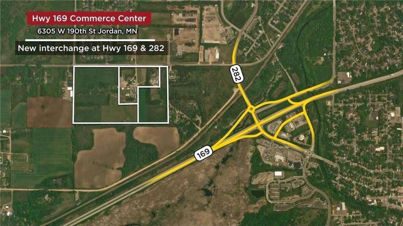 46-108 acres in growing Jordan! Level lot. Sewer and water available. Near Jordan's new planned interchange. Easy access to Hwy. 169, Hwy. 212. Just South of Shakopee. Lots of potential for Business! There are 108 -/+ acres available on Hwy 169. Guided Commercial & light Industrial.