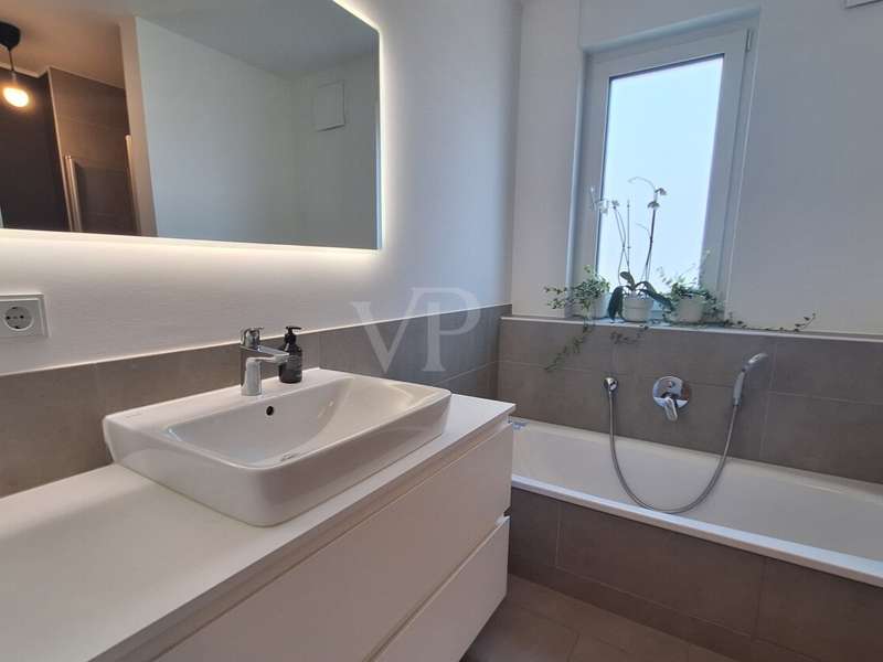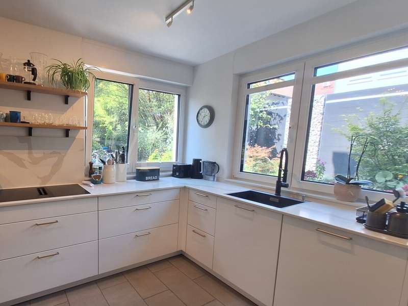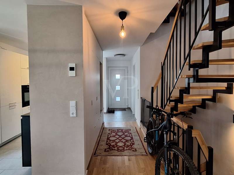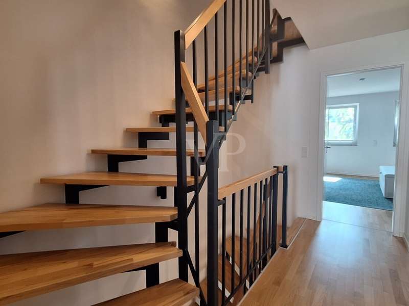This modern semi-detached house from 2022 is located in the popular Ober-Erlenbach district of Bad Homburg and impresses with its high-quality construction, contemporary architecture and numerous individual details. A total of five light-flooded rooms are available on a living space of around 146 m², supplemented by approx. 46 m² of usable space. The plot covers around 205 m² and offers a lovingly landscaped garden - some with exotic plants - as well as two parking spaces. Upon entering, residents and guests are greeted by a spacious hallway with a custom-made built-in wardrobe. On the first floor, the open-plan living and dining area with a modern high-gloss fitted kitchen including Bosch electrical appliances forms the heart of the house. From here, you have direct access to the sunny south-facing terrace and the garden. Both invite you to relax and linger. A stylish guest WC completes this floor. On the second floor there are two bright, spacious rooms and a comfortable daylight bathroom with bathtub and separate shower. The top floor offers two further sunny rooms and an additional shower room, which opens up flexible usage options - for example as a children's room, study or guest room. The basement extends the living concept with a spacious hobby room, which is currently used as a sports room, a Finnish sauna, a cellar room and a utility room with modern heating technology. The property is equipped with an efficient fossil cogeneration system. All living spaces have parquet flooring, underfloor heating and high-quality non-woven walls, creating a stylish yet comfortable living atmosphere. The house is currently let. A viewing is worthwhile to experience the potential of this property in a sought-after location in Bad Homburg.