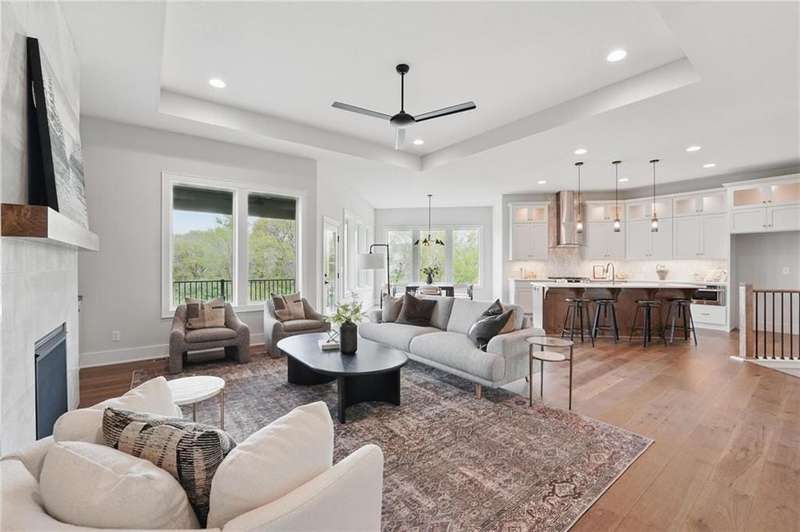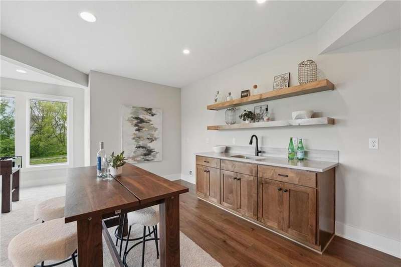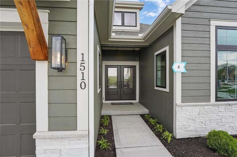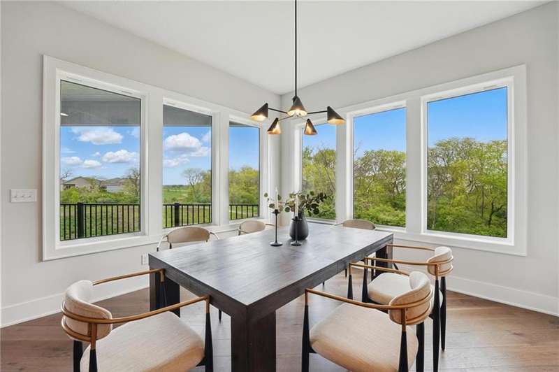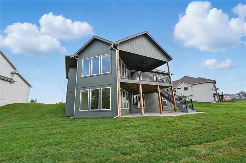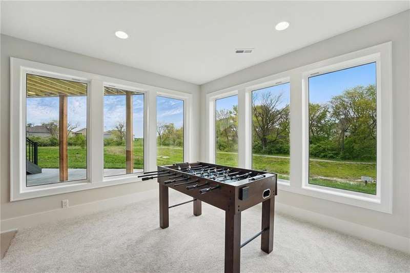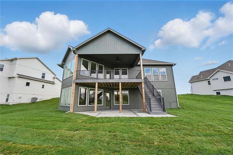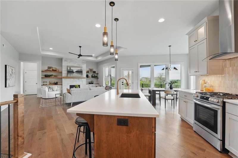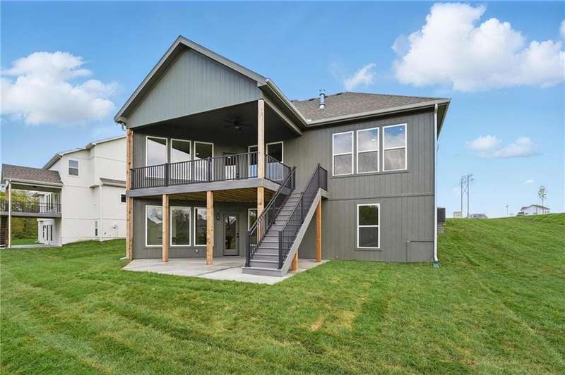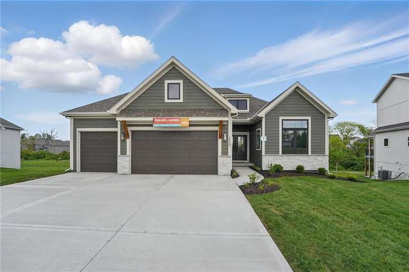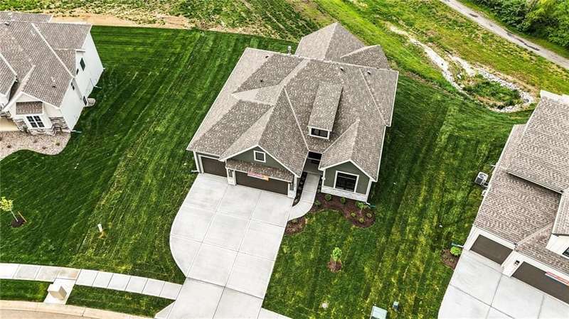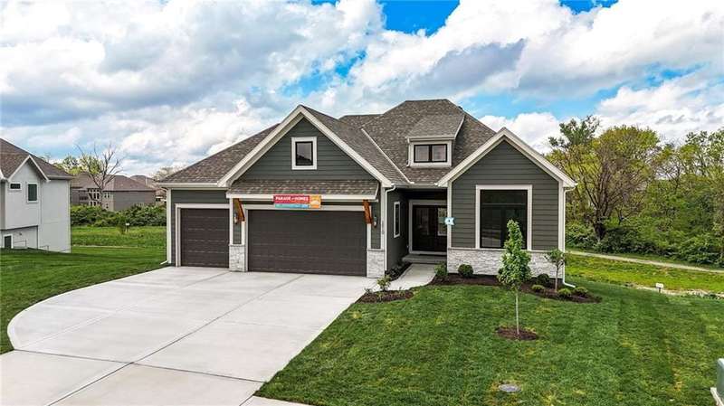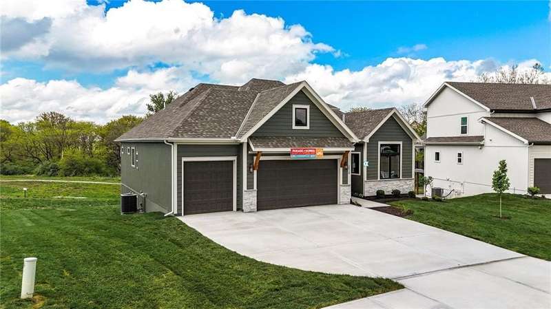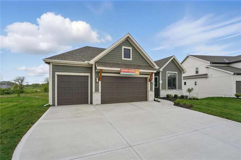 Model Home For Sale! Stunning Aspen Homes Cypress Reverse 1.5 Story, beautifully positioned on a walkout lot that backs to serene trees, offering both privacy and nature-filled views. This meticulously crafted home is nearing completion and promises a blend of modern design & luxurious finishes throughout. The kitchen is a chefs dream, featuring sleek quartz countertops, custom-built cabinetry with glass uppers, a generous walk-in pantry, & a gas stove perfect for both everyday meals & entertaining. The open floor plan flows effortlessly into the great room, where you'll find built-ins surrounding a striking floor-to-ceiling tile fireplace, creating a warm and inviting focal point. The primary suite is a true retreat, offering an elegant accent wall, walk in closet, spacious double vanity & quartz counters. Relax in the freestanding soaker tub, surrounded by trendy tile, or enjoy the zero-entry shower with rain showerhead. On the main level, you'll find a secondary bedroom with hardwood floors that can also be used as a stylish office space. The angled breakfast room offers beautiful views of the treed lot, providing the perfect spot to enjoy a meal or your morning coffee. The finished lower level extends the living space with two additional bedrooms, a wet bar, and an abundance of windows that bring in natural light, creating a bright and airy atmosphere. Designed with energy efficiency in mind, this home boasts a Certified Energy Rating of 46. Enjoy the benefits of Energy Star windows and appliances, blown-in insulation, a tankless water heater, and an energy-efficient HVAC system with a self-balancing ERV energy recovery ventilator and Aeroseal duct sealing to maximize comfort and reduce energy costs. Located within the award-winning North Kansas City School District in the Staley High attendance area. The Hunt Midwest Community offers a completed swimming pool and walking trails. Furniture not included. Taxes & SqFt estimated