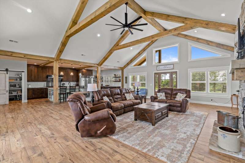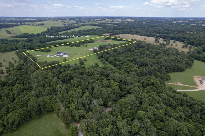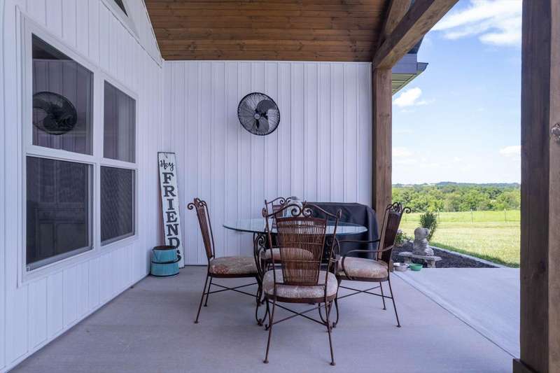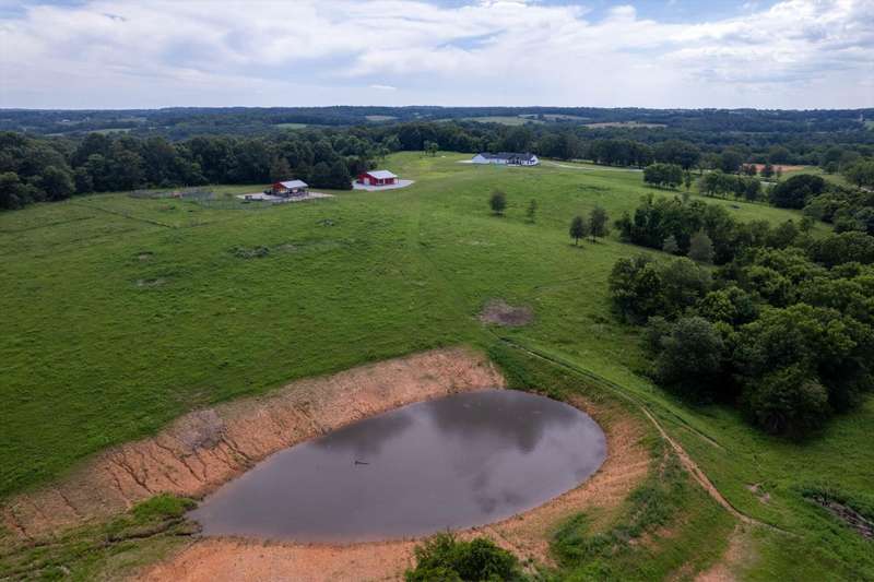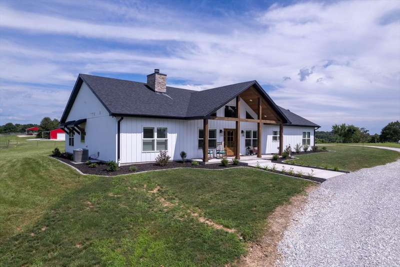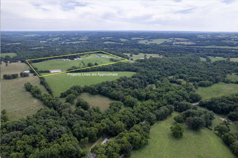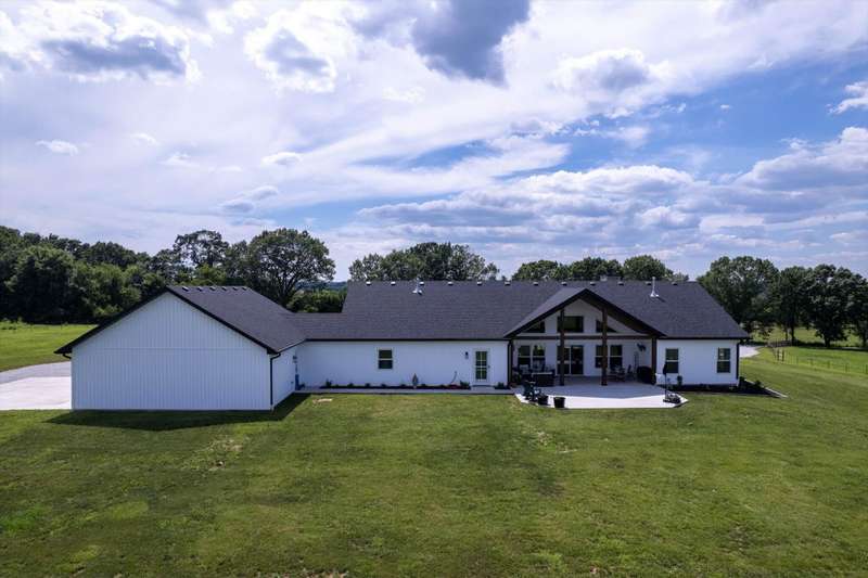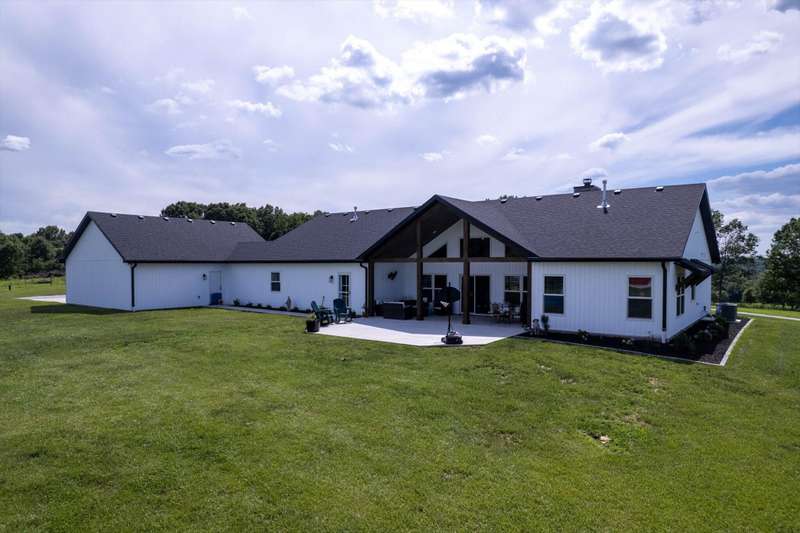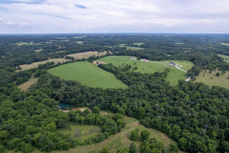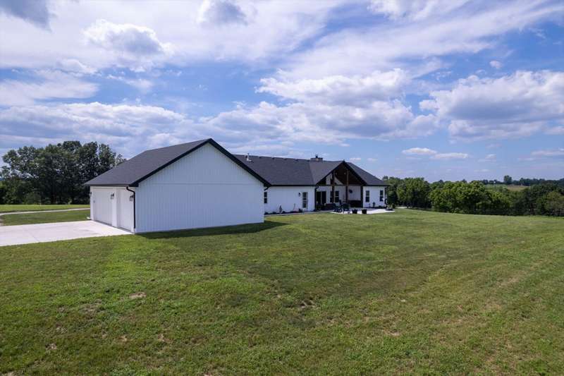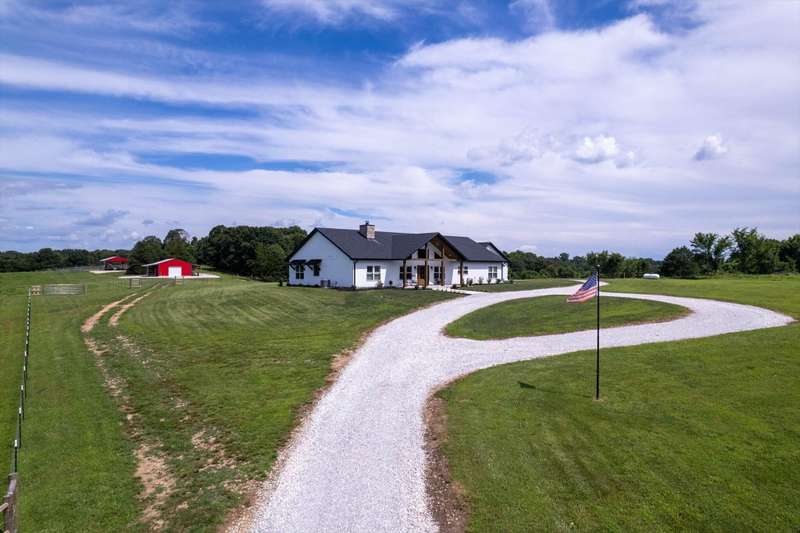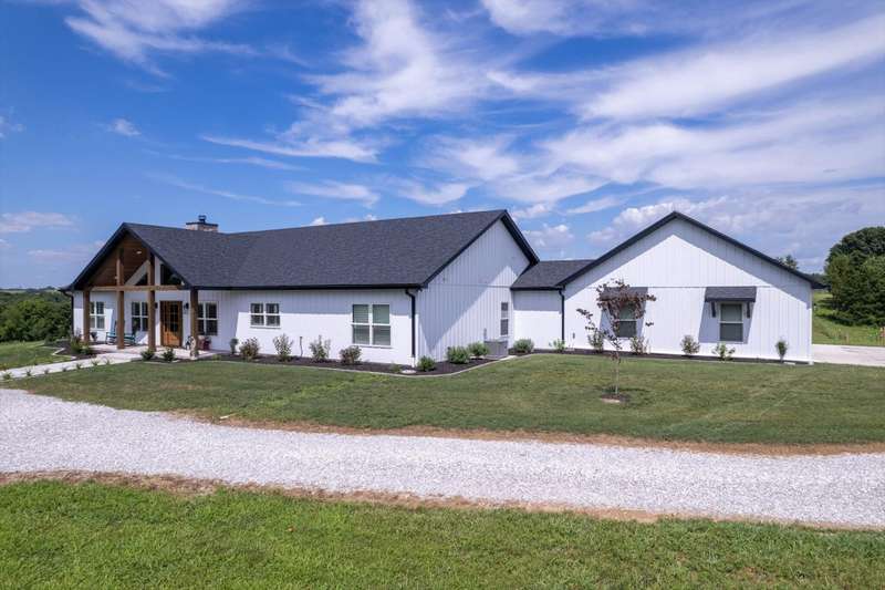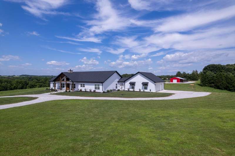 Welcome to your own private piece of paradise! This nearly new modern farmhouse is nestled on 24 gently rolling acres surrounded by breathtaking panoramic views. Can be combined with two 15 acre parcels for 54 acres total! Just a quick 30 minute drive from Springfield, this property offers the perfect mix of seclusion, space, and convenience. Immediately upon pulling into the circle drive you will fall in love! The pristine white exterior and fresh landscaping provide incredible curb appeal. The covered front porch allows you to enjoy the tranquil scenery all year long. Inside, an open floor plan showcases vaulted ceilings, exposed wooden beams, and a gorgeous floor-to-ceiling stone fireplace. Large windows flood the space with natural light. The gourmet kitchen is sure to impress with a large walk-in pantry, custom cabinetry, and top of the line appliances including a double oven with an 8 burner stovetop and oversized refrigerator. Entertaining will be a breeze with the spacious center island, stunning marble countertops, coffee/wine bar, and plenty of room for a formal dining area. Enjoy the privacy of a split floor plan with the additional bedrooms adjoined by a Jack and Jill bathroom. One bedroom's closet doubles as a safe room/storm shelter, ensuring peace of mind. The master suite boasts some of the best views in the whole house, not to mention the closet of your dreams with built-in shelving. The luxurious master bathroom has a double vanity, soaking tub and walk-in shower. Easily control your comfort level with dual HVAC units. The covered back patio overlooks the Ozark foothills and provides ample space for outdoor living and dining areas. Within walking distance of the house, you'll find a 30'x40' shop with garage bays on the front and back as well as a 30'x30' machine shed. The property features a pond as well as for your livestock or equestrian needs.