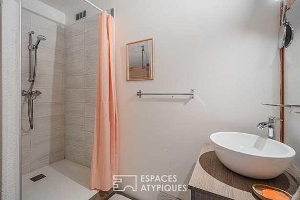 The entrance leads directly to the bright living room lit by large openings. It serves a bathroom and offers numerous storage spaces. The living room, with its charming exposed beams, is organized around a fitted kitchen and gives access to two bedrooms.
