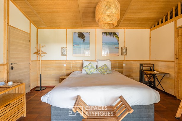 Completely independent, the private family wing, spanning 155 sq m, offers absolute privacy and comfort. It features a spacious 50 sq m living room opening onto a fully equipped kitchen. On the ground floor, a master suite with a dressing room and bathroom awaits, while upstairs, opening onto expansive terraces, are three additional bedrooms and a shower room. This family wing boasts its own private swimming pool and large, secluded terraces offering unobstructed and tranquil views of Lake Moutchic - a true haven of peace.