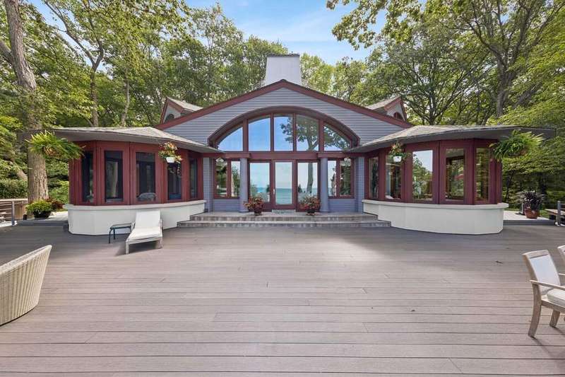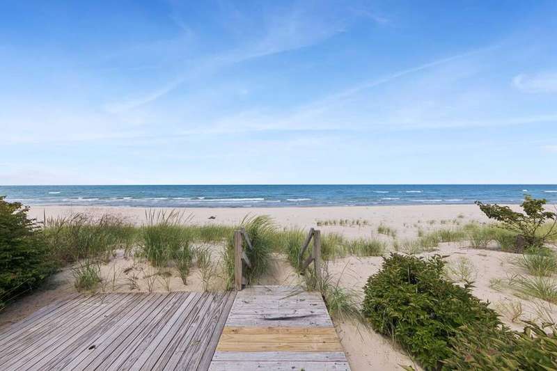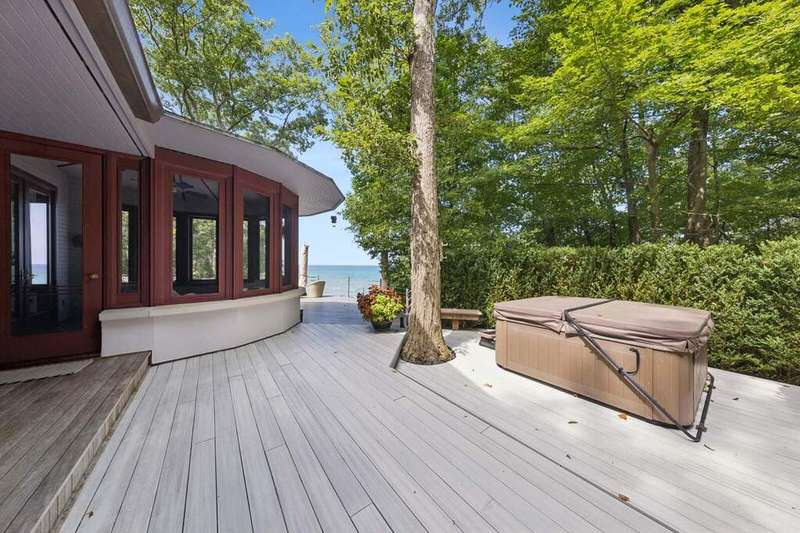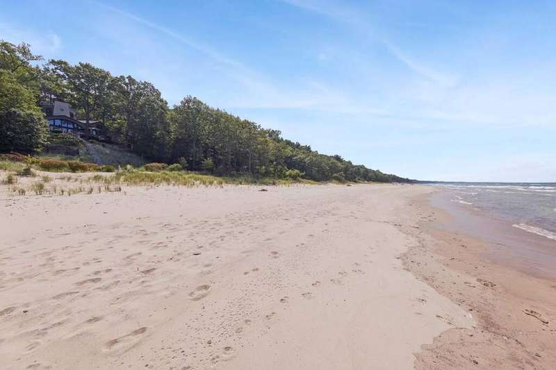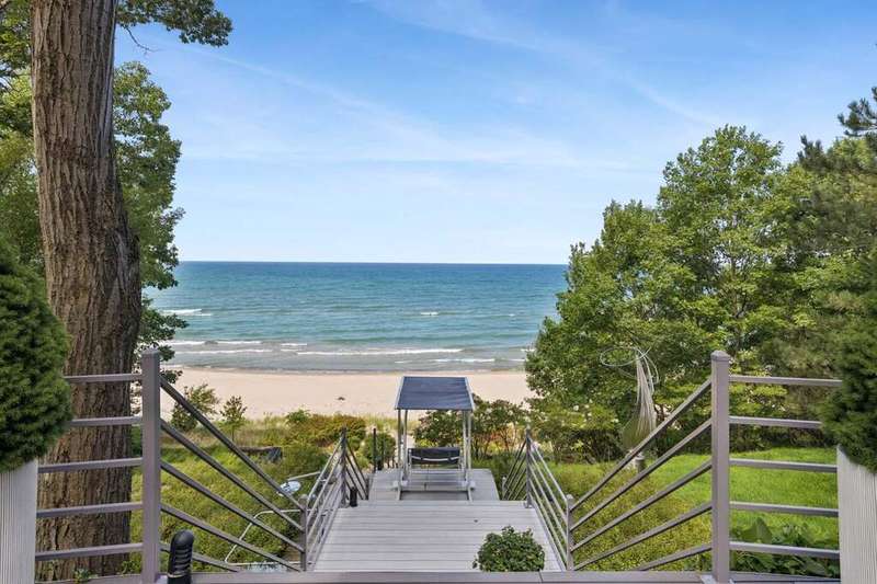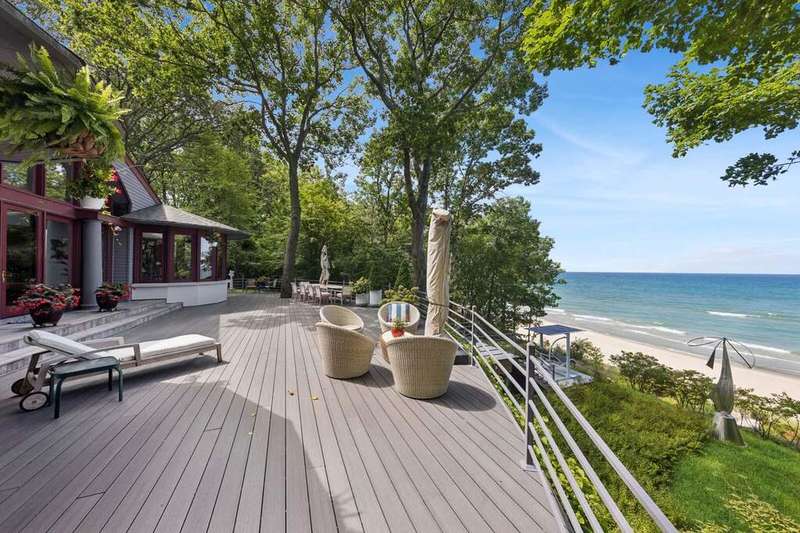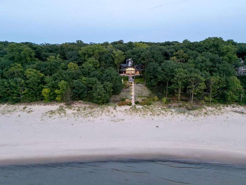 This exquisite lakefront estate will take your breath away. Three acres, and 350 feet of Lake Michigan frontage in the exclusive Wildwood development, offer an unparalleled setting. Enjoy lovely lake views, stunning sunsets and lush landscape, along with a most unique, custom home. At the center of the home is a soaring great room, with 23-foot ceilings, a massive fireplace, and a wall of windows and glass doors, overlooking expansive decks and magical Lake Michigan. The many outdoor spaces can accommodate groups small and large, for sunning, gathering, or breezy al fresco dining. Prefer meals indoors? Choose the unique, round, window-filled dining room. A clubby pool table space and an airy screen porch add to the main floor appeal. Climb a unique spiral staircase to a third-floor, tree-top haven, perfect for an office or gym. And there is a rooftop getaway, if you seek a lofty perch. At day's end, relax in the perfectly private, outdoor hot tub. And finally, take your rest in one of four tranquil bedrooms and luxurious baths. Even the heated garage is special, with room for every tool and toy a lake home deserves. This one owner, custom designed, and impeccably maintained property, is being sold turnkey, with all indoor and outdoor furnishings, tools, and lake equipment.