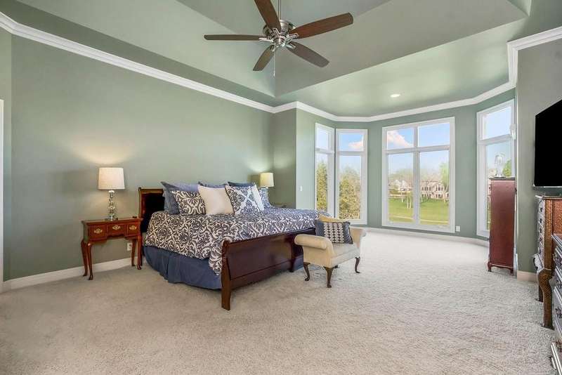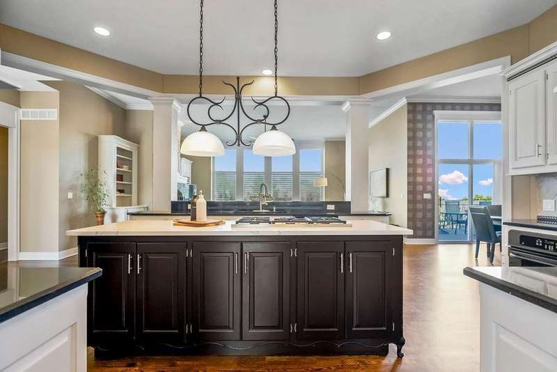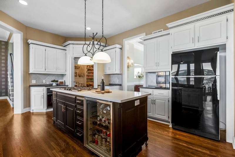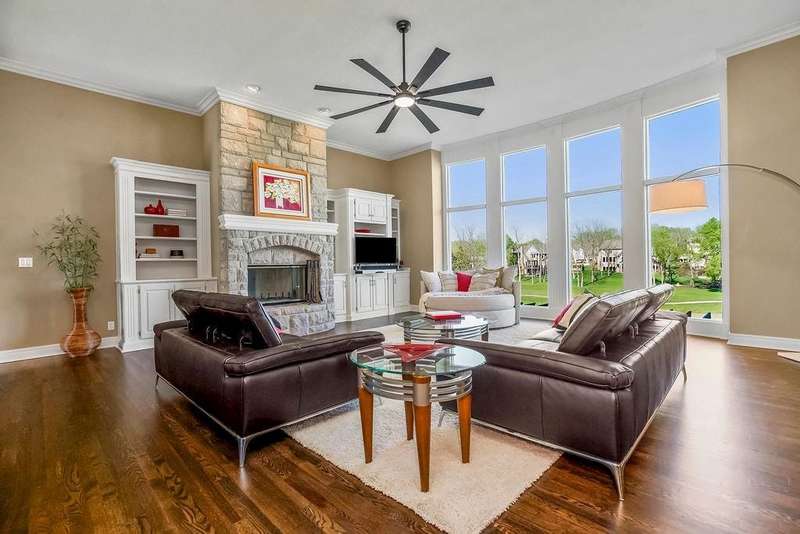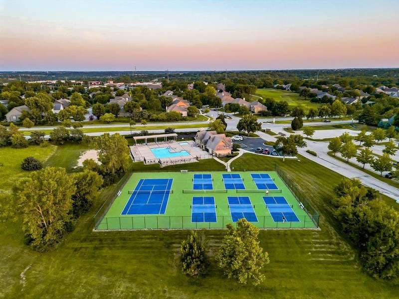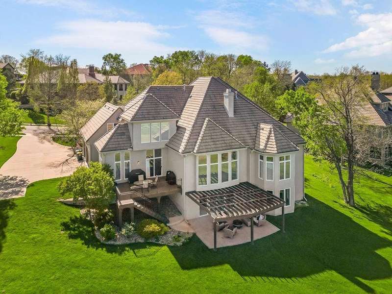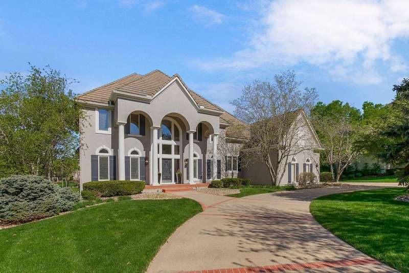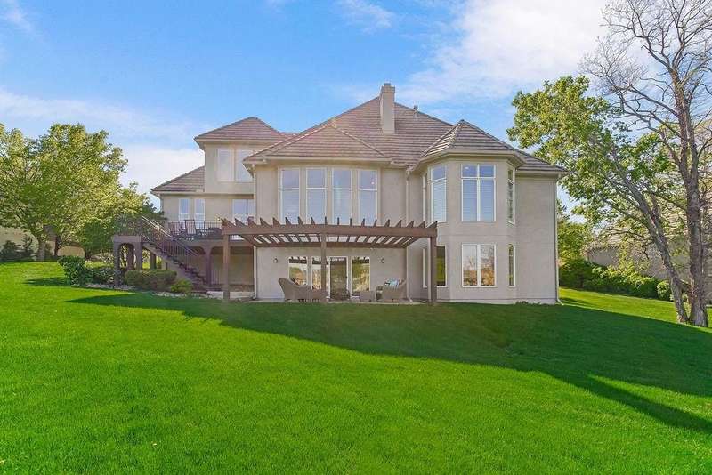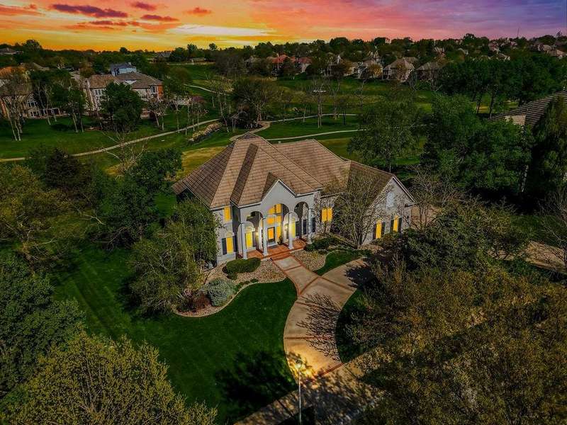 Spacious 1.5 story 5 bedroom home on a walkout golf course lot with east facing backyard with great golf course views and priced under county appraisal! Circle driveway & hard to find side entry garage! Walk into the grand 2 story entrywaywith a beautiful curved staircase, iron spindles, new stair carpet & gorgeous modern chandelier. Fantastic main floor primary suite has a sitting area & see thrugas fireplace. The primary bathroom feels like a spa oasis with jacuzzi tub and fireplace, double vanities with new quartzcountertops, lots of cabinet space, separate shower & piazza de resistance is 2 WALK-IN CLOSETS. Main floor also boasts aden with pocket doors & formal dining room and plantation shutters that adorn the front of the home. The large kitchen has 2 ovens, a 6 burner gas cooktop with a retractable downdraft vent, beverage refrigerator, lots of counter space, & walk-in pantry are sure to delight. Newly refinished hardwoods & open floor plan to thegreat room & breakfast nook. Great room has spectacular golf course views via floor to ceiling windows plus stonefireplace w/built-in cabinets. Also on the main floor are deck access, office area w/built-in desk spaces/shelvingw/French doors, laundry room & back staircase. Upstairs are 3 large bedrooms all w/private baths,new Quartz counters & LG walk-in closets + large loft area & built-in desks. Oversized open finished basement is ready to entertain! Bar has kitchenette w/mini-fridge, dishwasher, microwave & sink. Billiards & recreation area. Walk out to the EAST facing pergola covered patio to enjoy the golf course views! 5thbedroom that is 15'x15'-perfect as a 2nd Primary Suite! 5th full bath, tons of storage (perfect to add your home gym). Tankless hot water heater & tile roof!Amenities include putting green, 2 pools, pickleball & tennis courts, party room, sand volleyball. Lake Lenexa, trails, parks, Lenexa Rec Center & Public Market close by!Golf optional with GreatLifeKC