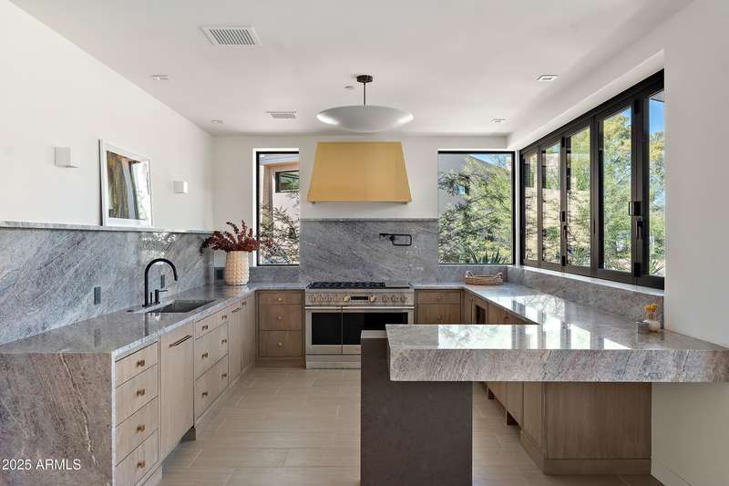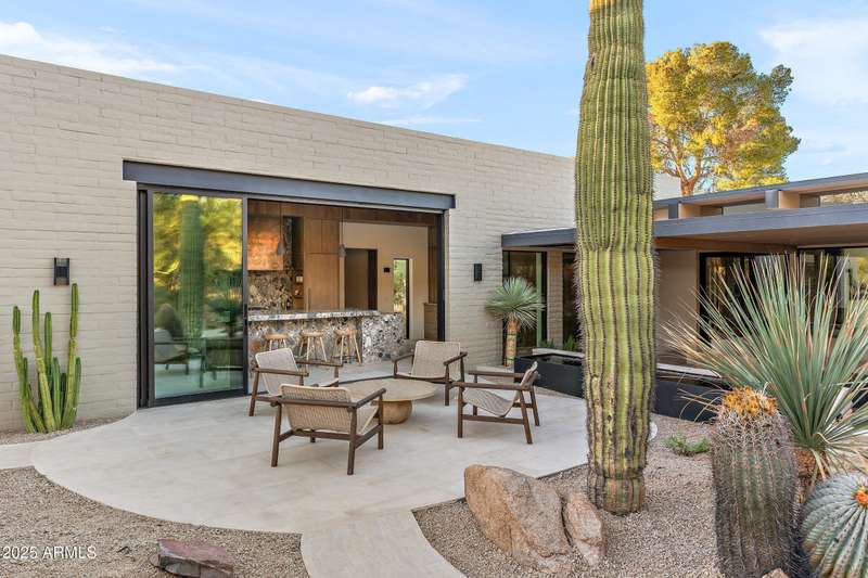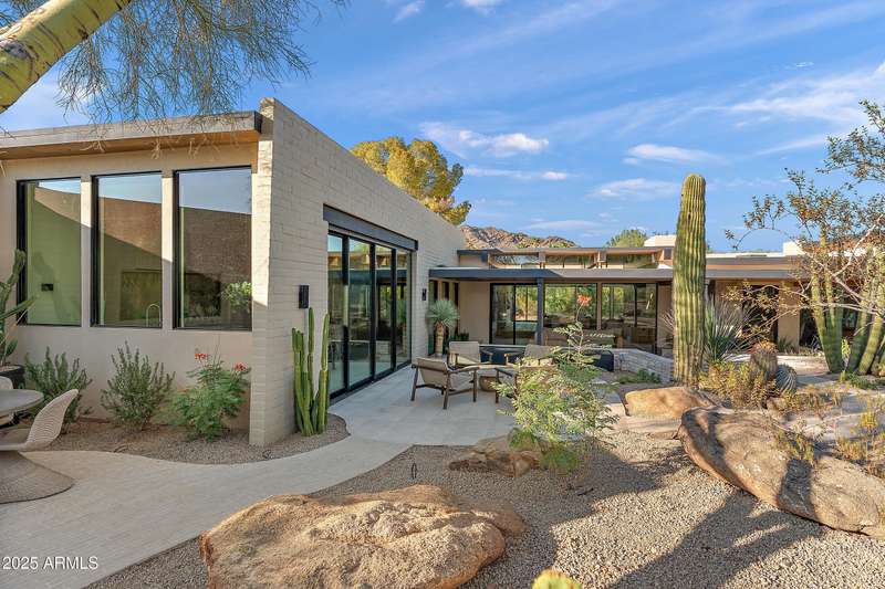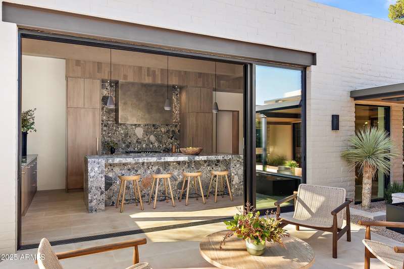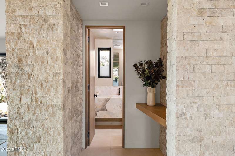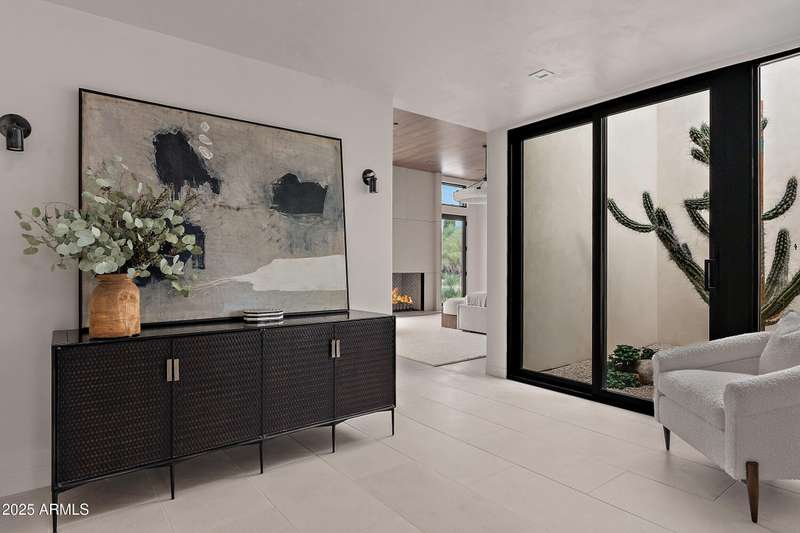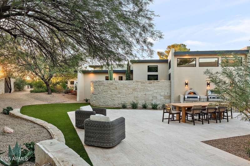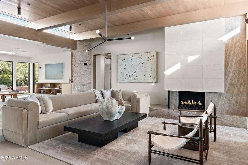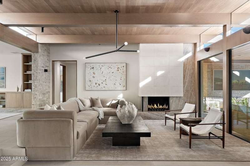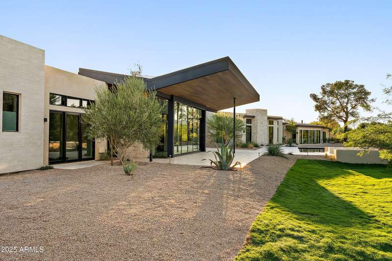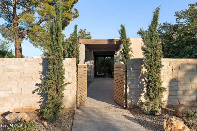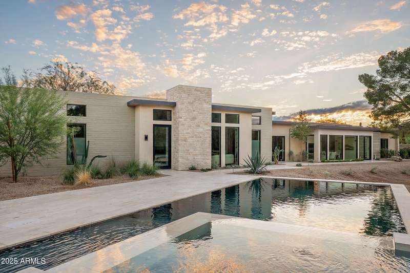Just completed is a unique, sophisticated new-build by world renowned interior designer Erinn V, in collaboration with Erik Peterson/PHX Architecture. The estate represents a rare fusion of Arizona mid-century architecture, design heritage, & contemporary luxury in Paradise Valley's most desired location, with majestic views of Camelback, Mummy & Phoenix Mountain Preserve. The 1-acre estate includes 6985 sq ft of living space across the main & guest house with walls of glass capturing majestic mountain views & skylights flooding the interiors with natural light. Exceptional workmanship & top-quality materials include honed, oversized limestone flooring, bleached white oak ceilings, custom walnut millwork, Roman clay finishes, custom stonework & natural imported stone countertops. Enjoy the outdoors with lush landscaping, water fountains, and abundant seating areas that create a resort-like setting, while the 40' x 18' zero-edge pool and spa provide a centerpiece for leisure and entertaining. The main house features an impressive Chef's kitchen with walls of glass showcasing up-close views of iconic Camelback Mountain. Designed for both beauty and functionality, the kitchen is equipped with Monogram appliances, custom hand-finished walnut cabinets with white bronze pulls, butler's pantry and stone island clad in Ceppo Breccia slabs from Italy. Oversized sliding doors open the kitchen to a patio with fire features, a water feature and outdoor TV surrounded by beautiful lush desert landscaping. For outdoor cooking and entertaining, the estate offers two BBQ areas (one off the kitchen and another by the guest house), outfitted with professional-grade FireMagic grills and a pizza oven. The owner's suite exudes a tranquil ambiance, highlighted by two private Zen gardens and a striking limestone fireplace. Blending elegance with functionality, it offers dual walk-in closets with custom Walnut floor to ceiling cabinetry and stone countertops, along with the convenience of a full-size washer and dryer. A secondary junior owner's suite adds versatility to the floorplan, easily accommodating use as a guest retreat, game room, fitness space, or den with mountain views. The private office makes a bold statement with bleached walnut millwork, built-in shelving, and expansive windows that frame breathtaking views of Camelback Mountain. The impressive 2,000-square-foot guest house is a private retreat of its own, complete with a full Monogram kitchen, spacious great room, 3 bedrooms, 3.5 baths and dedicated laundry room. Perfect for entertaining or hosting extended family and guests. The large paver circular driveway with plenty of parking space leads to an oversized four-car garage with matte-finish epoxy flooring, clerestory windows to Camelback and tall ceilings to accommodate lifts for a total of 8 vehicles.