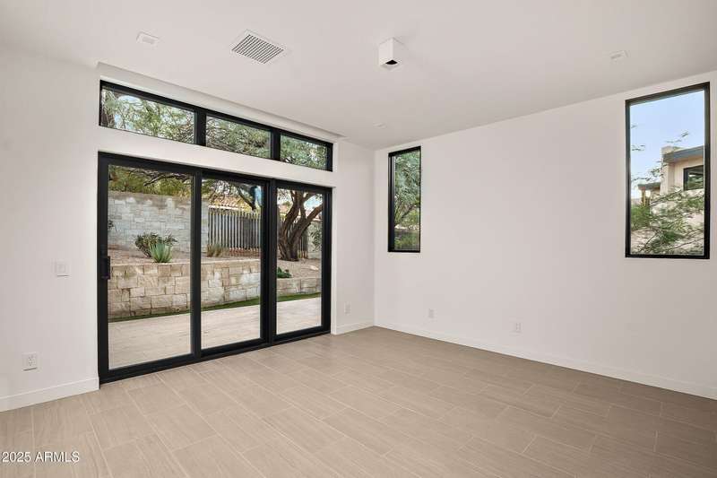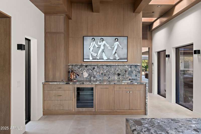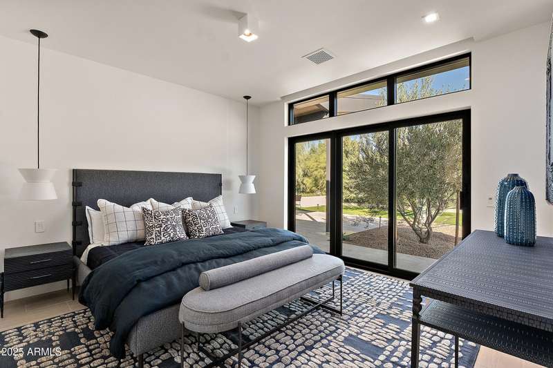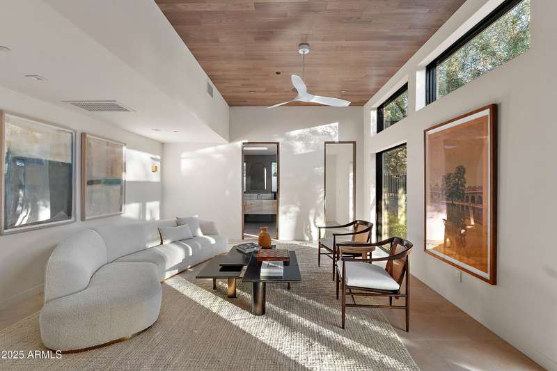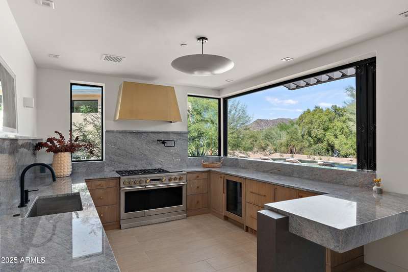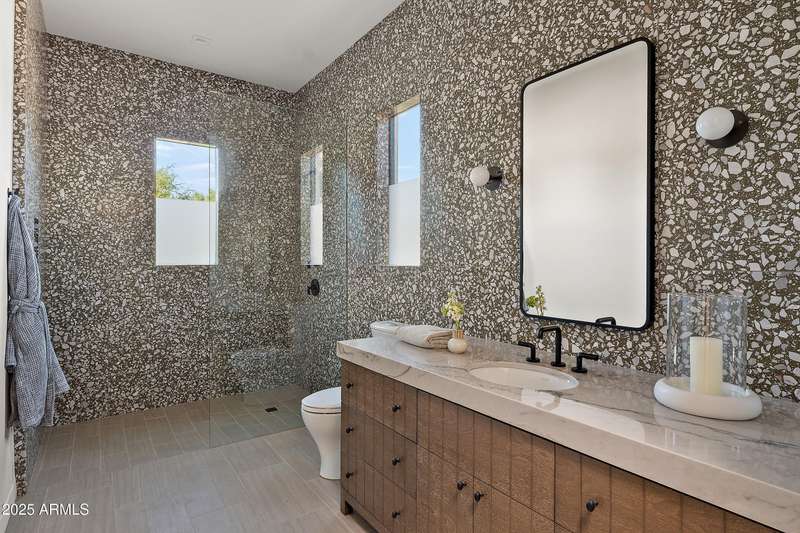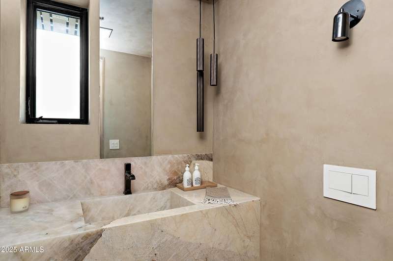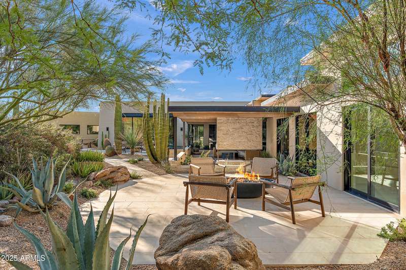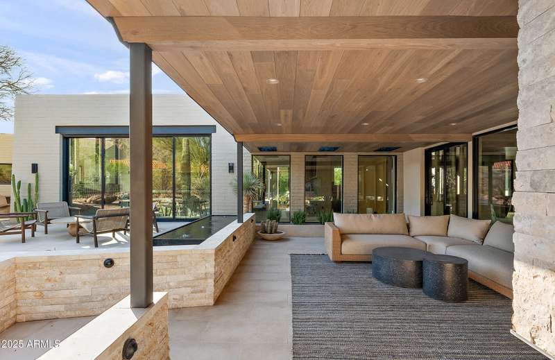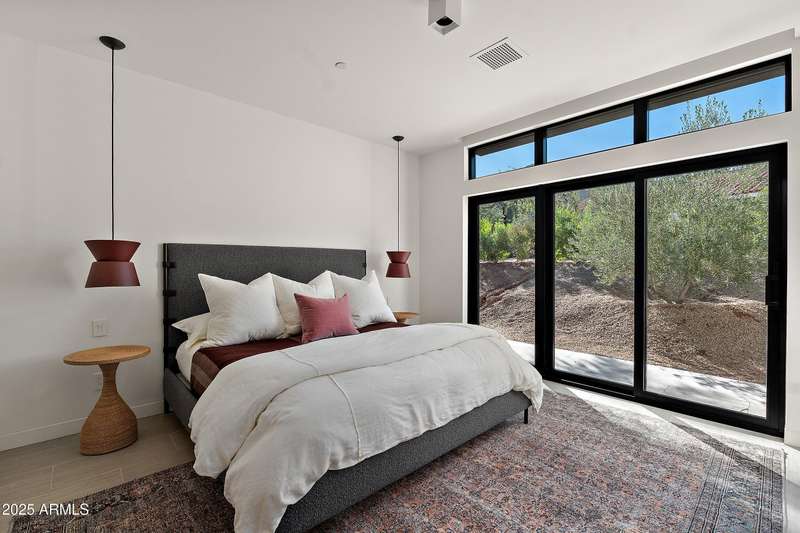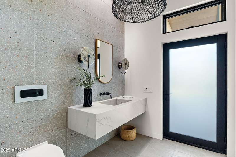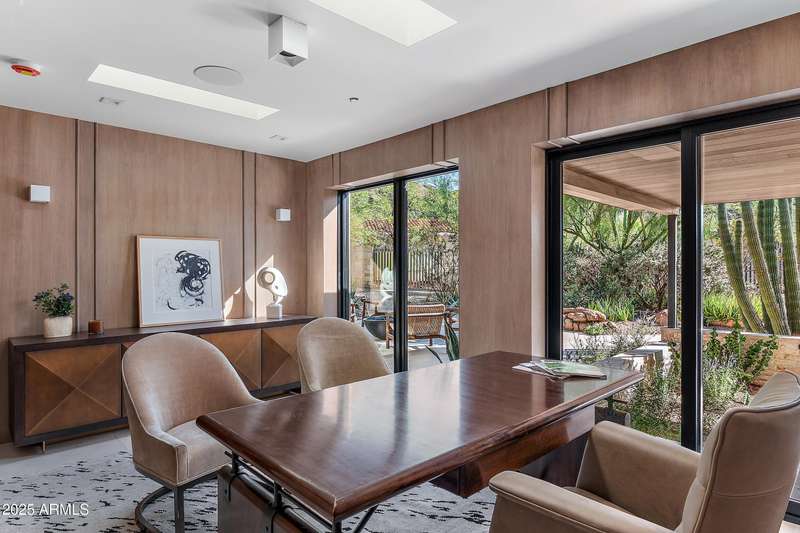 Just completed is a unique, sophisticated new-build by world renowned interior designer Erinn V, in collaboration with Erik Peterson/PHX Architecture. The estate represents a rare fusion of Arizona mid-century architecture, design heritage, & contemporary luxury in Paradise Valley's most desired location, with majestic views of Camelback, Mummy & Phoenix Mountain Preserve. The 1-acre estate includes 6985 sq ft of living space across the main & guest house with walls of glass capturing majestic mountain views & skylights flooding the interiors with natural light. Exceptional workmanship & top-quality materials include honed, oversized limestone flooring, bleached white oak ceilings, custom walnut millwork, Roman clay finishes, custom stonework & natural imported stone countertops. Enjoy the outdoors with lush landscaping, water fountains, and abundant seating areas that create a resort-like setting, while the 40' x 18' zero-edge pool and spa provide a centerpiece for leisure and entertaining. The main house features an impressive Chef's kitchen with walls of glass showcasing up-close views of iconic Camelback Mountain. Designed for both beauty and functionality, the kitchen is equipped with Monogram appliances, custom hand-finished walnut cabinets with white bronze pulls, butler's pantry and stone island clad in Ceppo Breccia slabs from Italy. Oversized sliding doors open the kitchen to a patio with fire features, a water feature and outdoor TV surrounded by beautiful lush desert landscaping. For outdoor cooking and entertaining, the estate offers two BBQ areas (one off the kitchen and another by the guest house), outfitted with professional-grade FireMagic grills and a pizza oven. The owner's suite exudes a tranquil ambiance, highlighted by two private Zen gardens and a striking limestone fireplace. Blending elegance with functionality, it offers dual walk-in closets with custom Walnut floor to ceiling cabinetry and stone countertops, along with the convenience of a full-size washer and dryer. A secondary junior owner's suite adds versatility to the floorplan, easily accommodating use as a guest retreat, game room, fitness space, or den with mountain views. The private office makes a bold statement with bleached walnut millwork, built-in shelving, and expansive windows that frame breathtaking views of Camelback Mountain. The impressive 2,000-square-foot guest house is a private retreat of its own, complete with a full Monogram kitchen, spacious great room, 3 bedrooms, 3.5 baths and dedicated laundry room. Perfect for entertaining or hosting extended family and guests. The large paver circular driveway with plenty of parking space leads to an oversized four-car garage with matte-finish epoxy flooring, clerestory windows to Camelback and tall ceilings to accommodate lifts for a total of 8 vehicles.