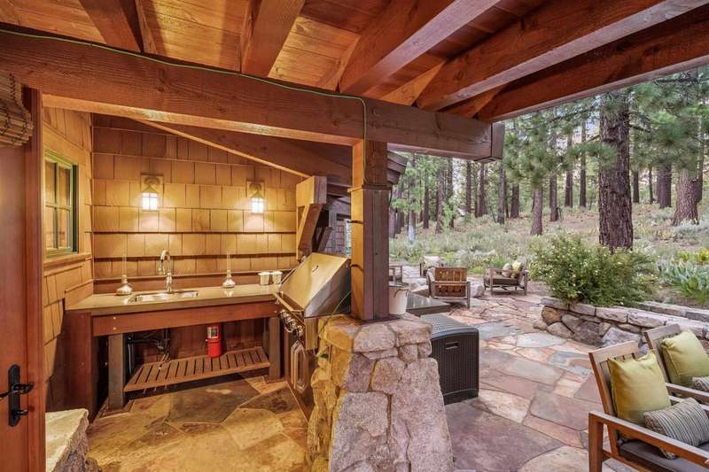 Welcome to The Overlook Lodge: A Tahoe Estate Masterpiece in the Heart of the Private & Gated Lahontan Community & Golf Club in Truckee, California. Located in a sun-drenched cul-de-sac within Truckee's prestigious private Lahontan Golf Community. Offering sweeping views of Lookout Mountain and the 17th fairway, this mountain retreat was designed to elevate everyday living with enduring craftsmanship and thoughtful luxury. From the moment you arrive, the home's presence is undeniable. Architectural stone pillars rise both inside and out, blending seamlessly with native landscaping and an alpine backdrop. Soaring timber beams and custom ironwork hint at the meticulous detail within. Built in 2002 and spanning 5,936 square feet, this 5 bedroom, 6.5 bathroom estate was crafted for connection, celebration, and comfort. Inside, walnut hardwood floors stretch across the main level, softened by Sierra antique stone inlays and warmed by hydroponic radiant floor heating. The great room is anchored by a dramatic four-sided stone fireplace and a wall of picture windows that frame the surrounding mountain landscape, filling the home with natural light and a grounded sense of place. A chef's kitchen offers commercial-grade Kitchenaid appliances, a Viking range, solid granite counters, a dedicated ice maker, and two dishwashers. Solid Alder cabinetry and an oversized island provide warmth and workspace, while a custom buffet and bar with beverage fridge offer the perfect extension for effortless entertaining. A sunny breakfast nook adds comfort for everyday meals and morning coffee. Two large front-facing viewing decks offer sweeping views of Northstar and the high Sierra, while the rear patio and lanai invite four-season outdoor living. A built-in outdoor kitchen, firepit, and private hot tub with mountain views complete the experience. Thoughtfully designed for flexibility, the home features two private primary suites, one with dual his and her bathrooms. A spacious family/media room on the lower level features a full refrigerator and theater-style setup powered by a 26-speaker Sonos system, perfect for game-day gatherings and movie nights. Practical luxury continues with a giant laundry room, a separate pantry, and a heated two-car garage with built-in cabinetry, hanging racks for ski and boating equipment, and a finished attic space above for storage or future conversion. A smart lighting system with an easy all-on/all-off functionality simplifies daily living on the upper levels. The landscaping is f