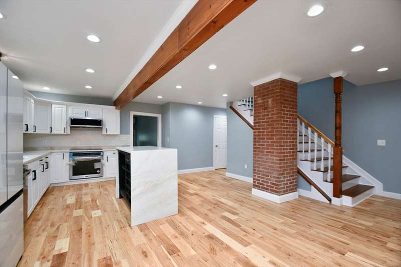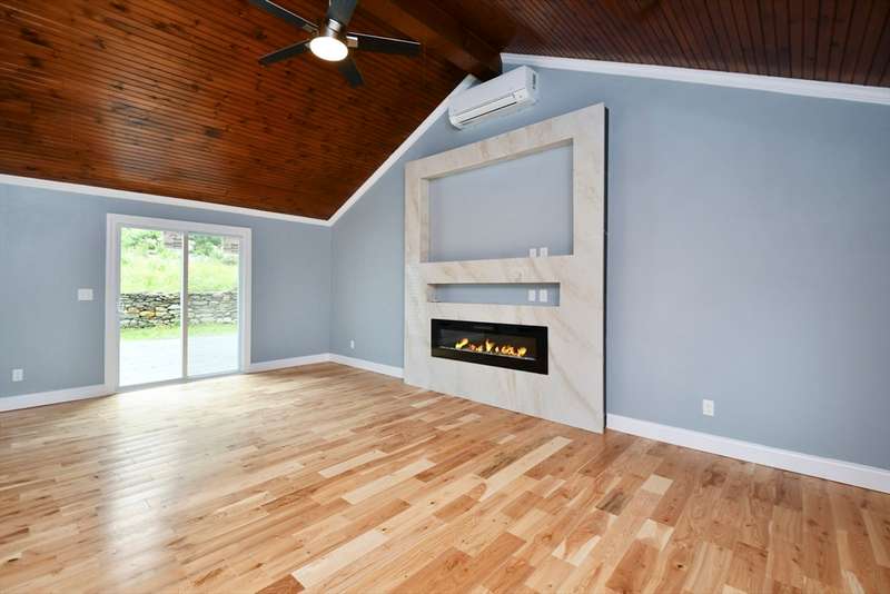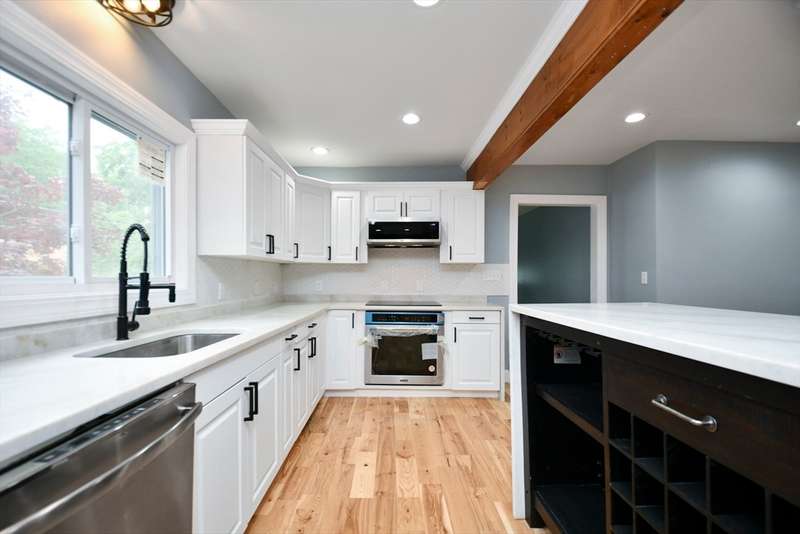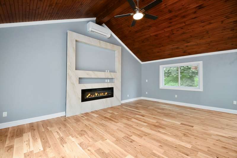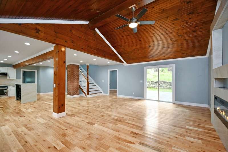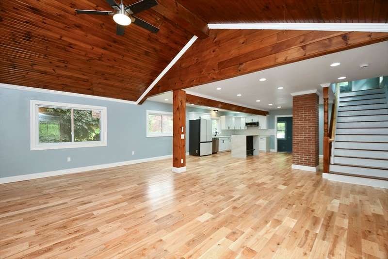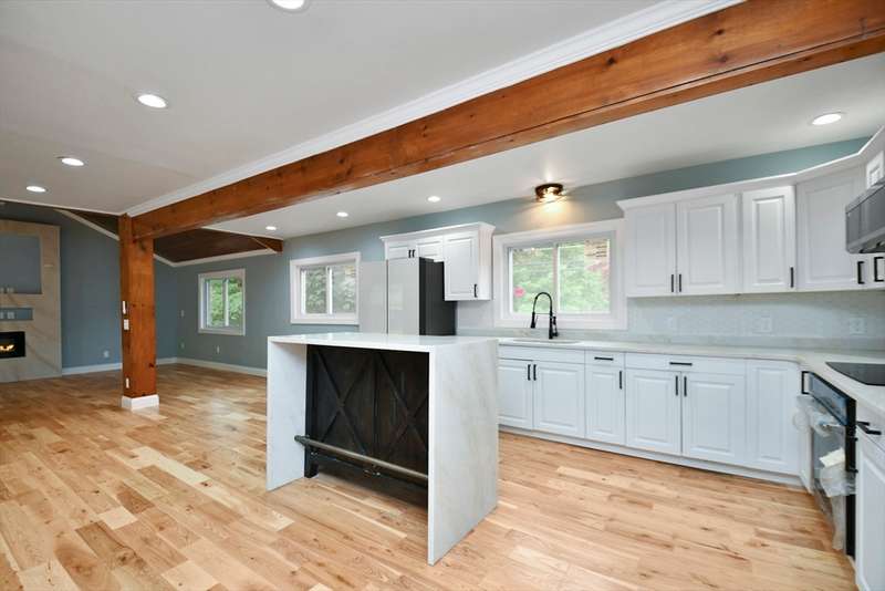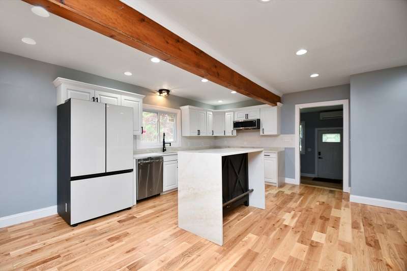 Step into this beautifully remodeled 4-bedroom, 2.5-bath home featuring a thoughtful blend of style and functionality. Recent updates include upgraded plumbing and electrical with a brand-new electrical panel. Enjoy the warmth of elegant wood flooring and energy-efficient LED lighting throughout. The open-concept layout seamlessly connects the kitchen, dining area, and living room, which boasts a striking cathedral wood ceiling. The kitchen is a true showstopper, complete with new cabinetry, quartz countertops, stainless steel appliances, and a double waterfall island. A quartz fireplace adds a touch of luxury to the living space. The first-floor primary suite offers a spa-like experience with a tiled bathroom, oversized shower, dual-sink vanity with color-changing faucets, an illuminated Bluetooth mirror, and modern finishes throughout. Additional upgrades include: New Roof (2022), New Windows (2022), New Siding (2022), Paved Driveway (2024), Passed Title V Inspection.