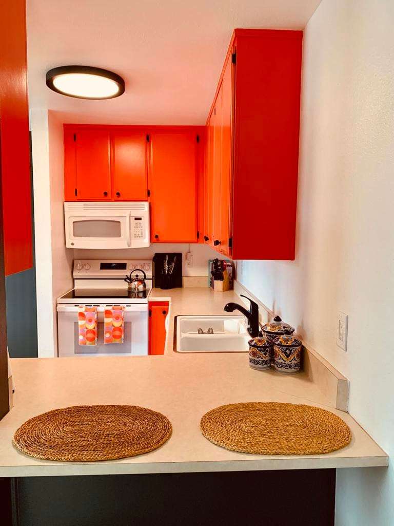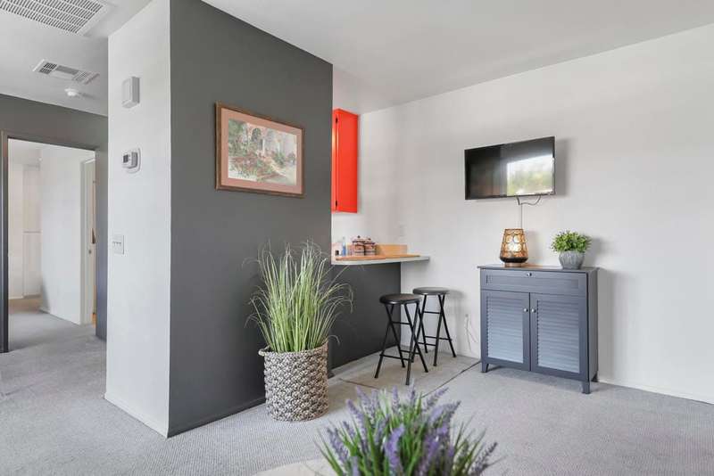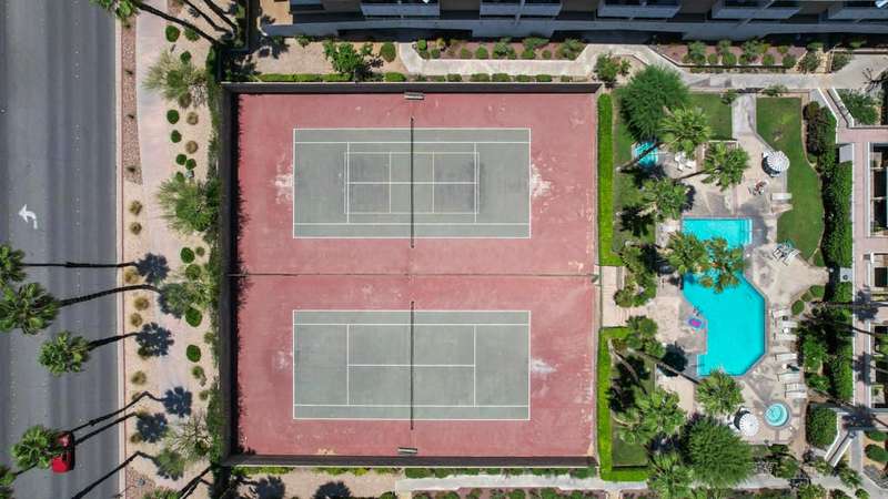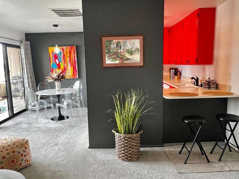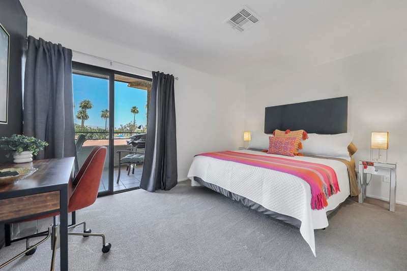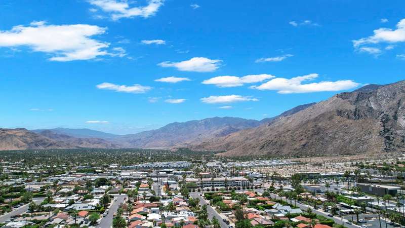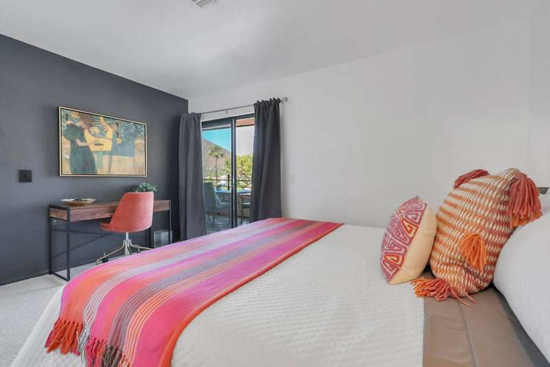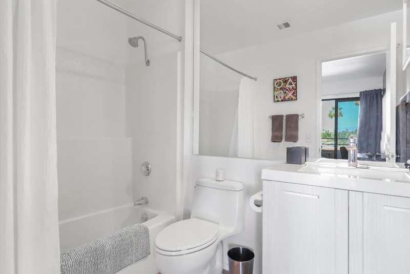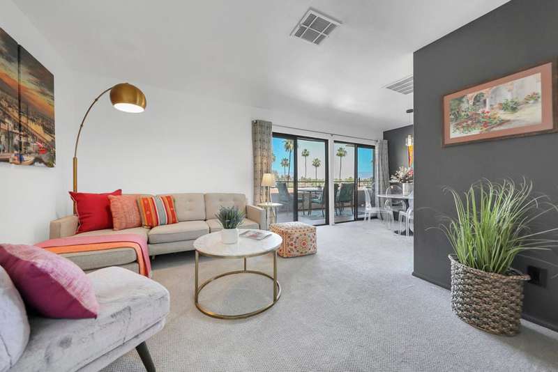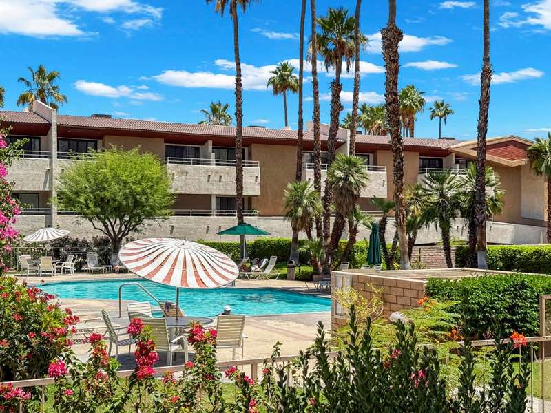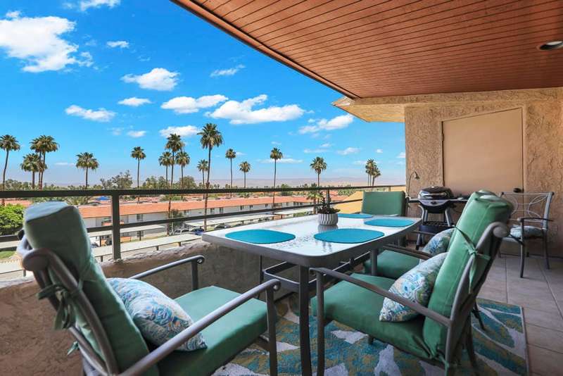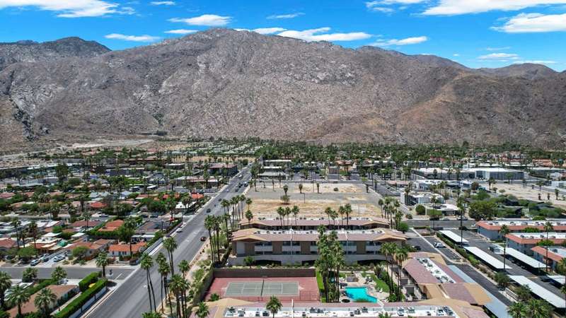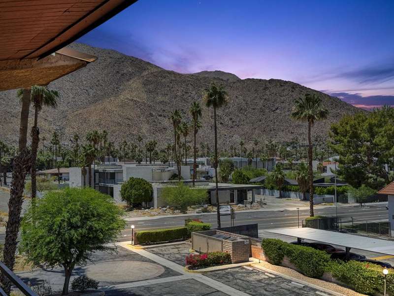 ''Biarritz' top floor view 1 bed/1 bath end unit is sold turnkey furnished, including new linens and new appliances with a 3-year warranty. With cheerful and bright decor and artwork, it can easily serve as a weekend destination, short term or longer rental investment, or full-time residence. The unit has a large and spacious deck, accessible from both the family room and bedroom, with a 180 degree view of mountains by day and city lights by night. The deck includes both dining and lounge furnishings, as well as 2 large storage closets and barbecue. Biarritz amenities include a large swimming pool, 2 spas, 2 tennis courts, secured bike storage, laundry rooms, and assigned covered parking spaces. Just moments from Palm Springs central downtown vibe, offering retail shopping, culinary diversity, local and international art, and weekly Street Fair fun!You can enjoy it all!!