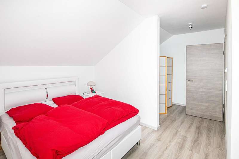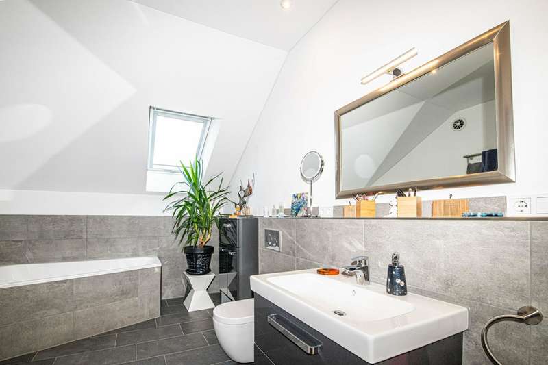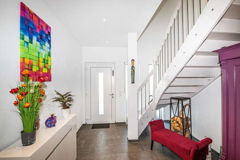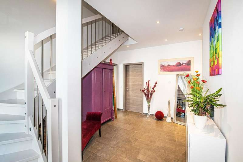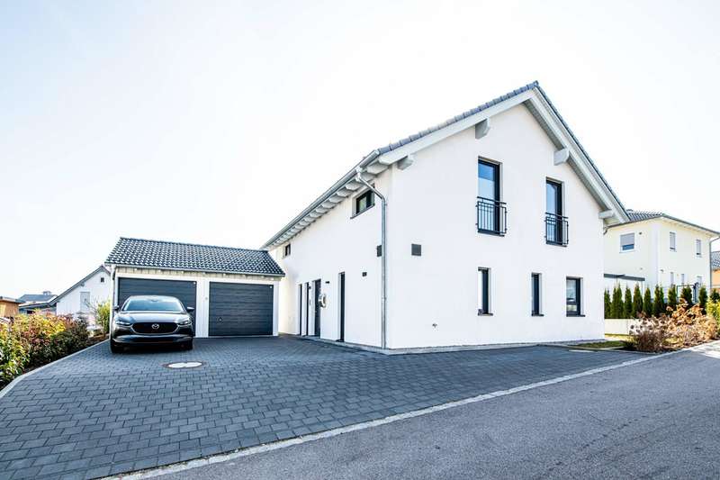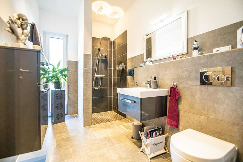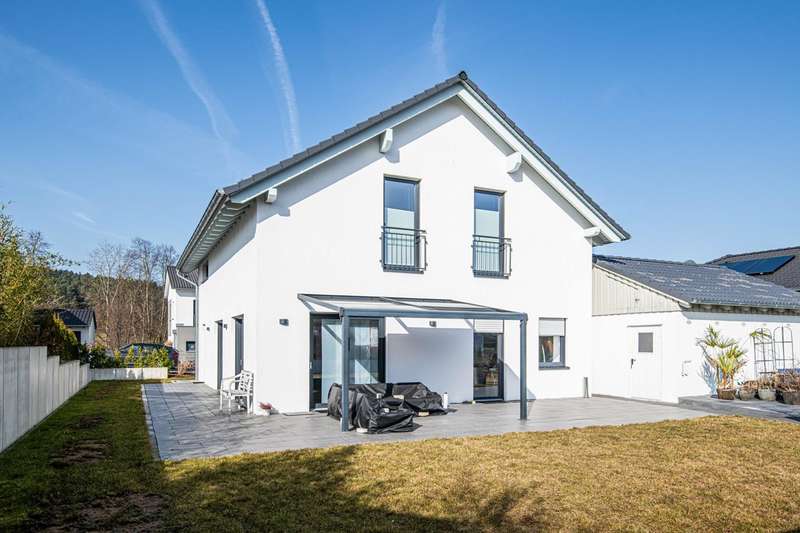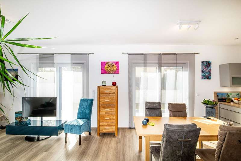 A well-maintained detached house is for sale, which was built in 2019 and is characterized by its modern furnishings and room layout. The property has a living space of approx. 180 m² and is situated on a generous plot of around 690 m². Thanks to its energy-efficient construction to KfW 55 standard, the house not only offers a high level of living comfort, but also significantly reduces energy costs. There are six rooms in total, four of which are bedrooms that can be used individually. The heart of the house is the open-plan cooking, dining and living area. This spacious room impresses with its brightness and offers direct access to an adjoining terrace. Here you can harmoniously combine the indoor and outdoor areas and spend cozy hours with family and friends. The entrance area of the house is also generously designed and welcomes residents and guests alike. Particularly noteworthy is the modern equipment in the kitchen, which is ideal for culinary activities and convivial evenings. A level-access shower on the first floor provides barrier-free access. The main bathroom on the upper floor is equipped with a bathtub and a walk-in shower. Additional comfort is provided by the underfloor heating, which ensures cozy warmth in all rooms and guarantees efficient energy use. The double garage offers enough space for two vehicles. Outside, a well-kept garden with tool shed awaits you, which can be individually designed and offers a wide range of possibilities for use. The property was built on a leasehold plot and has been let since September last year. If you have any questions or would like to arrange a viewing appointment, please do not hesitate to contact us. Don't miss the opportunity to get to know this impressive home and see for yourself how comfortable it is to live in. On request, you can view this property in advance in a 360-degree panoramic tour - from the comfort of your own home!