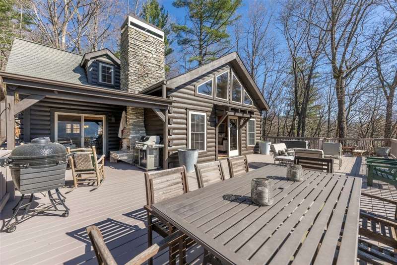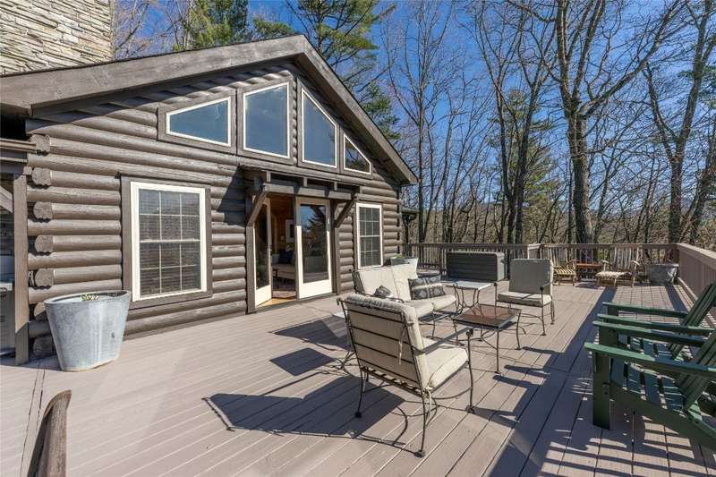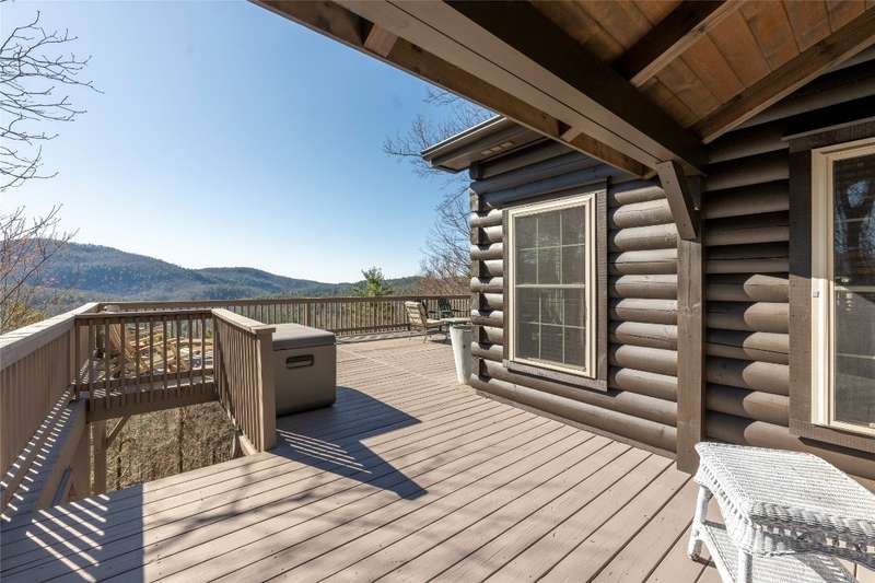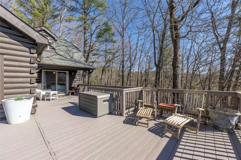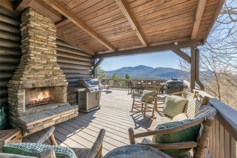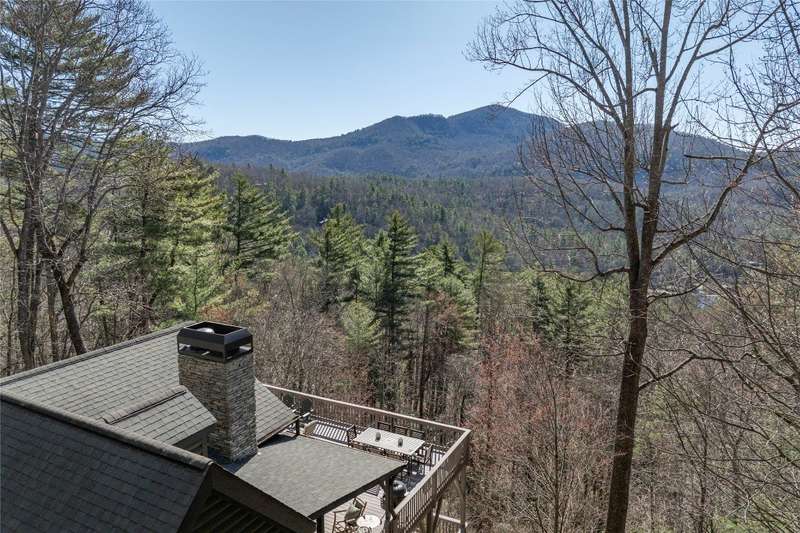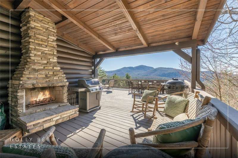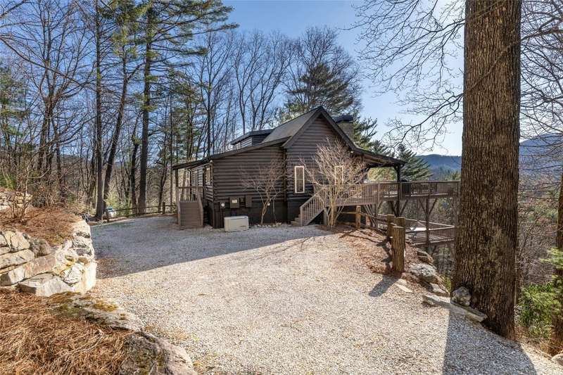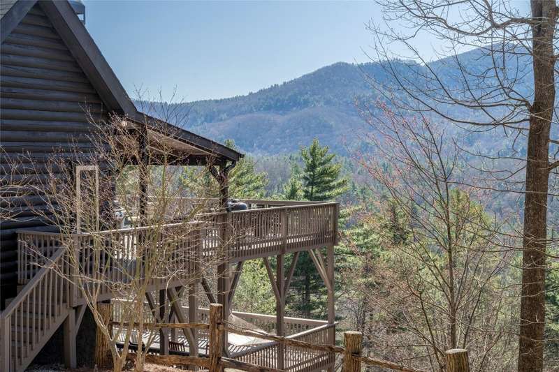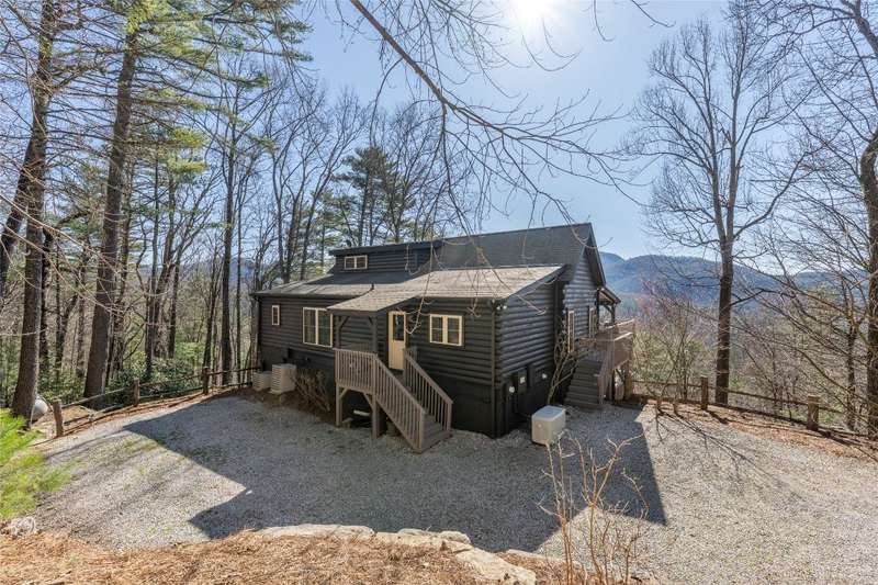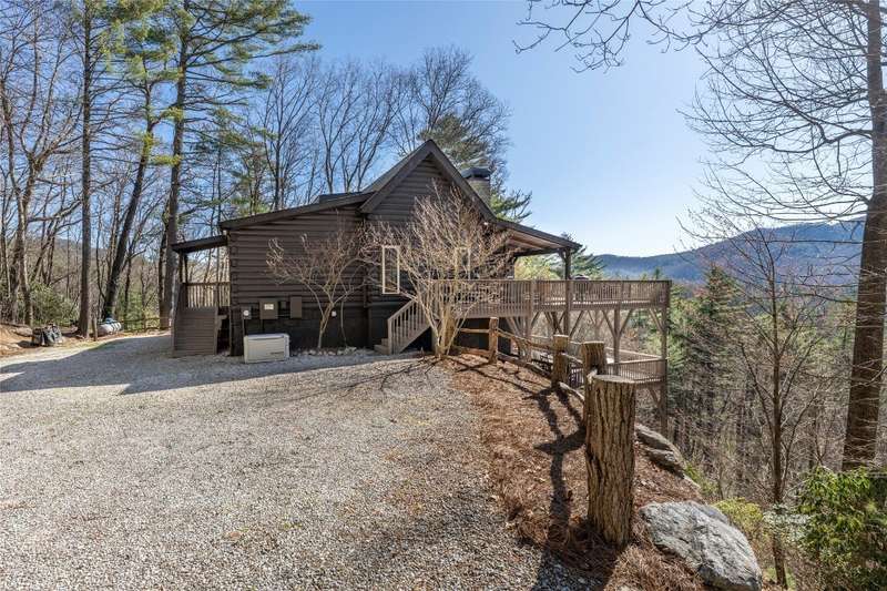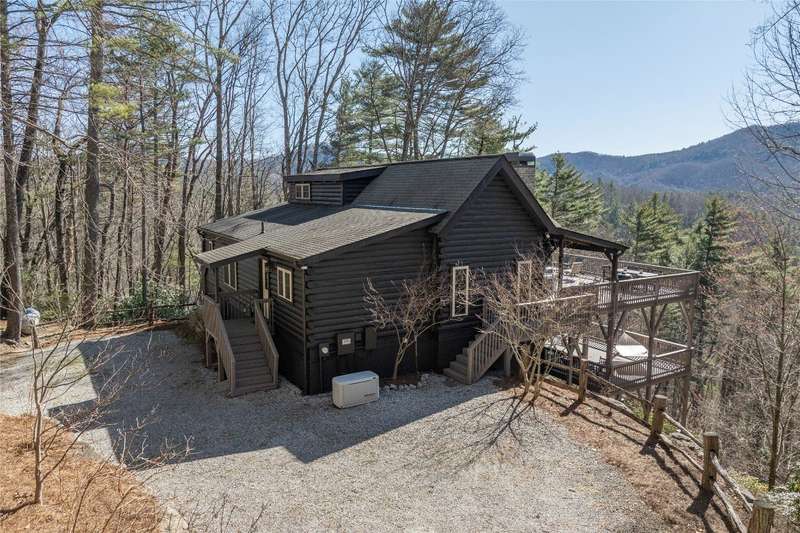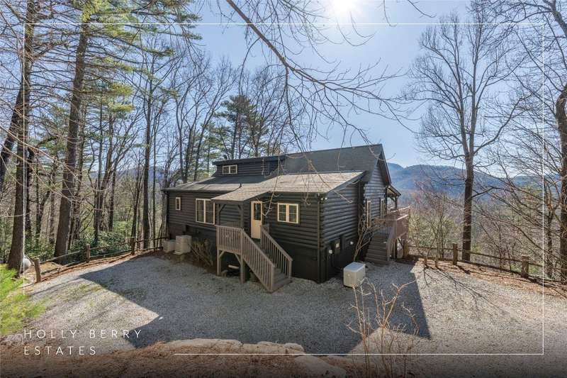 Perched on a scenic 3-acre +/- lot in Holly Berry Estates, this impressive log home captivates with its rustic allure and long-range mountain views. From nearly every room, gaze upon the beauty of Little Terrapin and pristine national forest land. Designed for mountain living with sophistication, this home blends elegant interiors, idyllic outdoor spaces, and breathtaking vistas. Step into the main living area, where vaulted ceilings with exposed timber beams create an expansive yet inviting atmosphere. The living room centers around a striking fireplace adjacent to large windows and French doors that connect to a sprawling back deck. Here, the panoramic views offer the ideal backdrop for quiet mornings or social gatherings. The adjoining dining room extends to a covered portion of the deck - complete with fireplace - making it perfect for enjoying mountain evenings surrounded by natural beauty. The thoughtfully designed kitchen combines style and function with a breakfast bar, stainless steel appliances, pendant lighting, and ample pantry storage. The main floor features two luxurious bedrooms. The primary suite's sliding doors open to sweeping mountain views and lead to another covered area of the deck. Its indulgent ensuite bathroom includes a large jetted tub, a separate shower, and dual vanities. A second bedroom with a full bathroom provides additional accommodation. On the upper level, a charming loft bedroom with its own full bathroom offers an airy retreat that is perfect for guests. Meanwhile, the lower level transforms into an entertainer's paradise, with a family room featuring a gas log stove and French doors leading to the lower, covered deck that shares the same mesmerizing views as the upper level. A large, open game and entertainment room includes a counter and sink, adding both functionality and fun. This level also has a bedroom, a full bathroom with a laundry area, and a generous utility and storage room. Modern conveniences include fiber internet, an EV charging station, a generator, and easy access to a level parking area. Combining rugged mountain charm with thoughtful design and stunning scenery, this property is a remarkable retreat for those seeking both beauty and comfort. Holly Berry Estates is situated at the base of Whiteside Mountain and has two private lakes for residents to enjoy fishing, swimming and non-motorized boating.