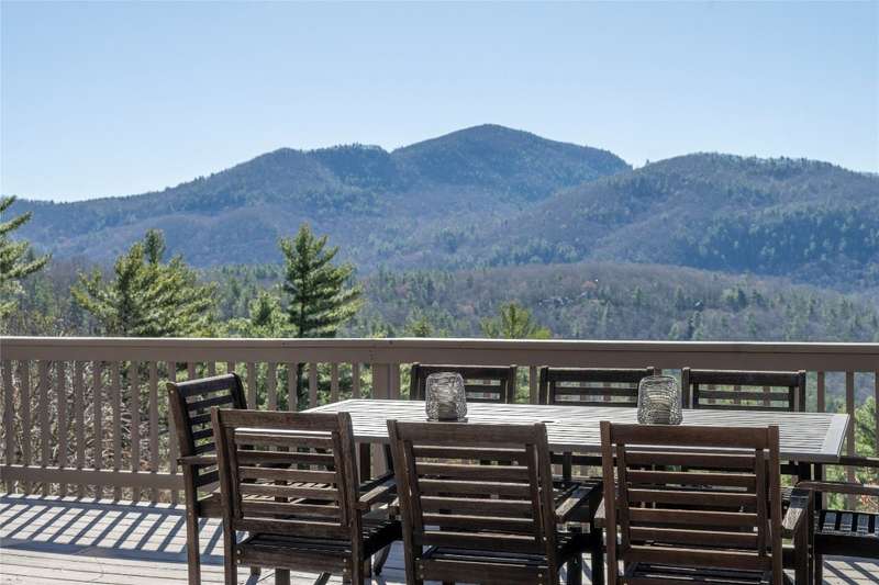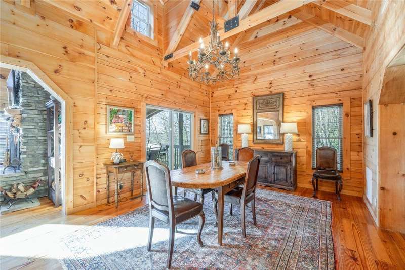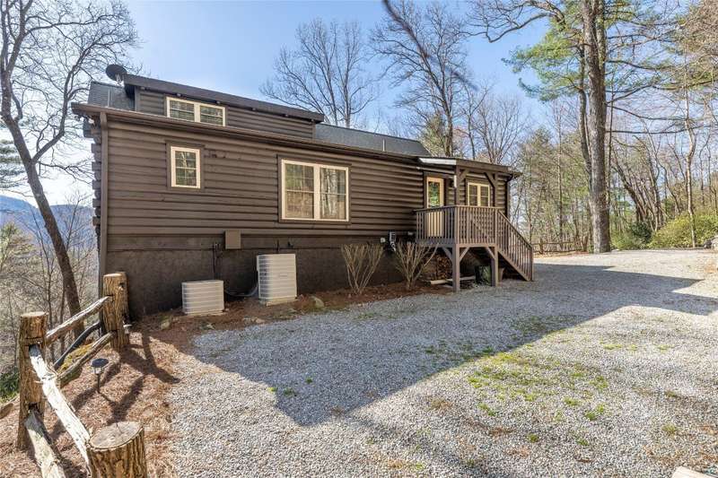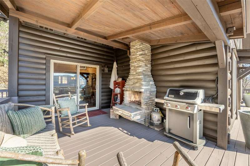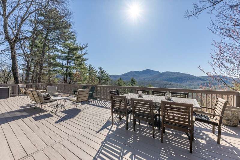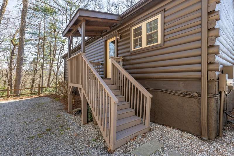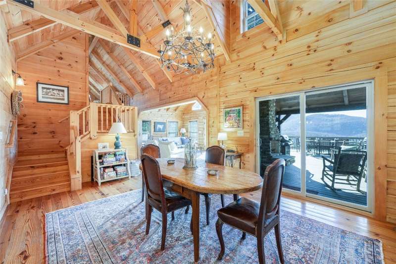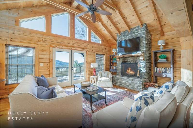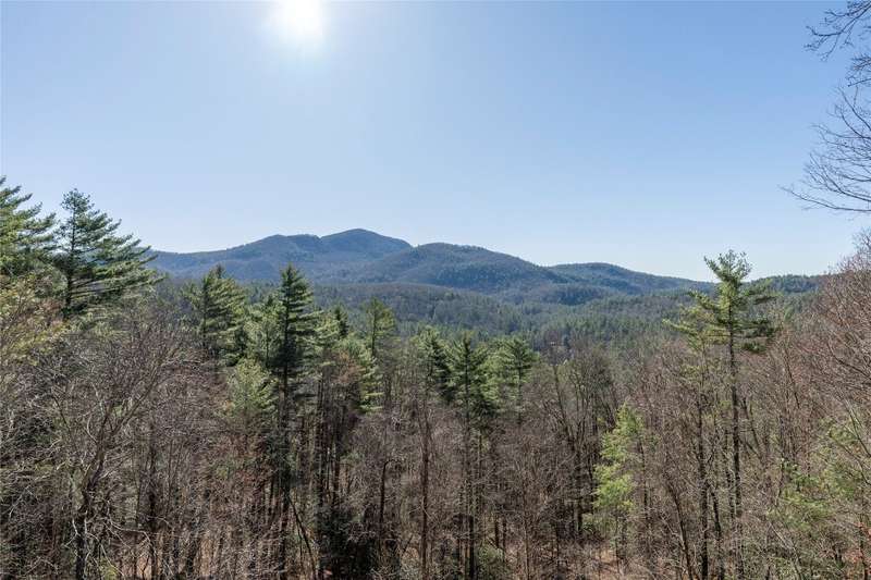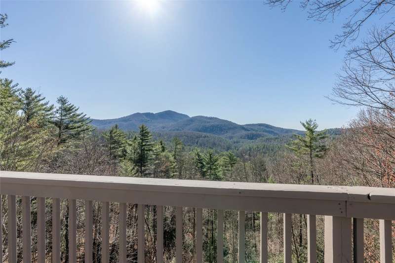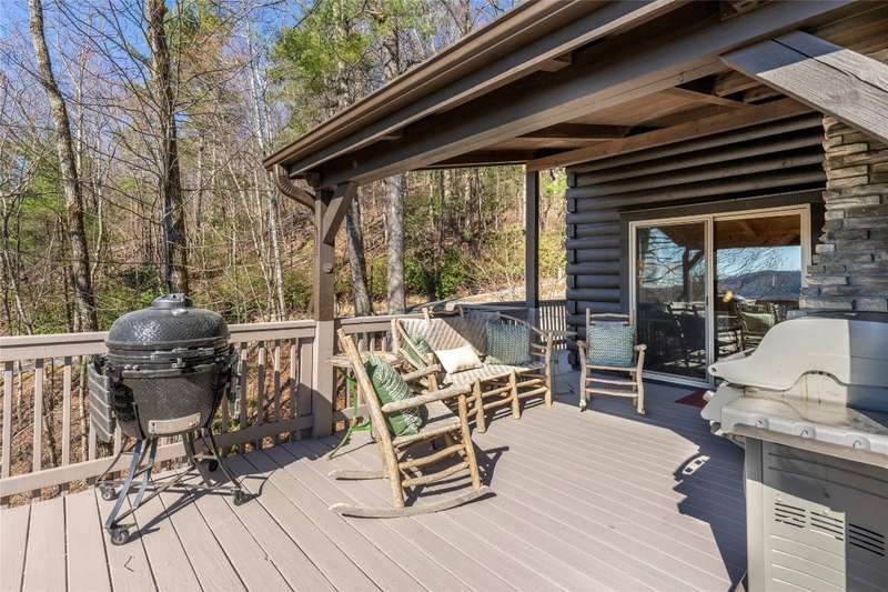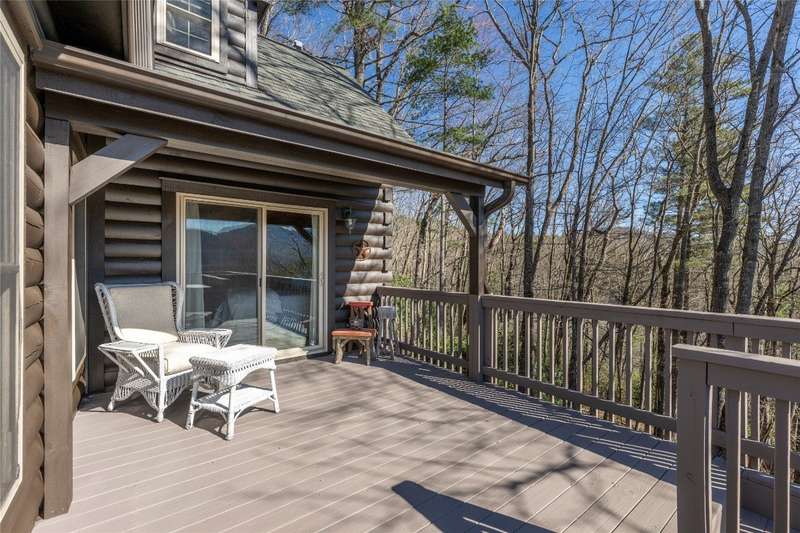 Perched on a scenic 3-acre +/- lot in Holly Berry Estates, this impressive log home captivates with its rustic allure and long-range mountain views. From nearly every room, gaze upon the beauty of Little Terrapin and pristine national forest land. Designed for mountain living with sophistication, this home blends elegant interiors, idyllic outdoor spaces, and breathtaking vistas. Step into the main living area, where vaulted ceilings with exposed timber beams create an expansive yet inviting atmosphere. The living room centers around a striking fireplace adjacent to large windows and French doors that connect to a sprawling back deck. Here, the panoramic views offer the ideal backdrop for quiet mornings or social gatherings. The adjoining dining room extends to a covered portion of the deck - complete with fireplace - making it perfect for enjoying mountain evenings surrounded by natural beauty. The thoughtfully designed kitchen combines style and function with a breakfast bar, stainless steel appliances, pendant lighting, and ample pantry storage. The main floor features two luxurious bedrooms. The primary suite's sliding doors open to sweeping mountain views and lead to another covered area of the deck. Its indulgent ensuite bathroom includes a large jetted tub, a separate shower, and dual vanities. A second bedroom with a full bathroom provides additional accommodation. On the upper level, a charming loft bedroom with its own full bathroom offers an airy retreat that is perfect for guests. Meanwhile, the lower level transforms into an entertainer's paradise, with a family room featuring a gas log stove and French doors leading to the lower, covered deck that shares the same mesmerizing views as the upper level. A large, open game and entertainment room includes a counter and sink, adding both functionality and fun. This level also has a bedroom, a full bathroom with a laundry area, and a generous utility and storage room. Modern conveniences include fiber internet, an EV charging station, a generator, and easy access to a level parking area. Combining rugged mountain charm with thoughtful design and stunning scenery, this property is a remarkable retreat for those seeking both beauty and comfort. Holly Berry Estates is situated at the base of Whiteside Mountain and has two private lakes for residents to enjoy fishing, swimming and non-motorized boating.