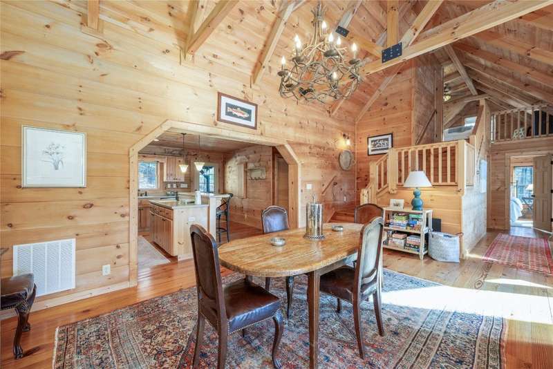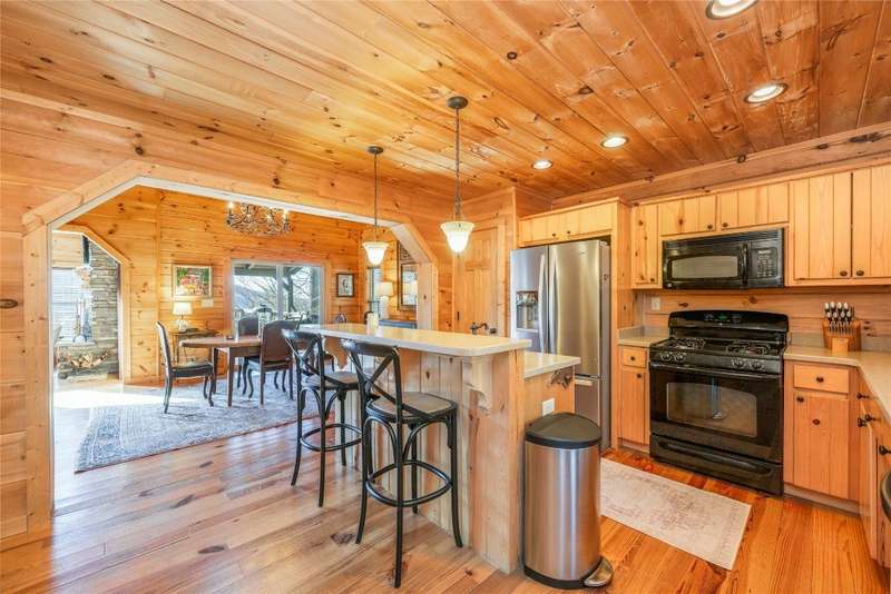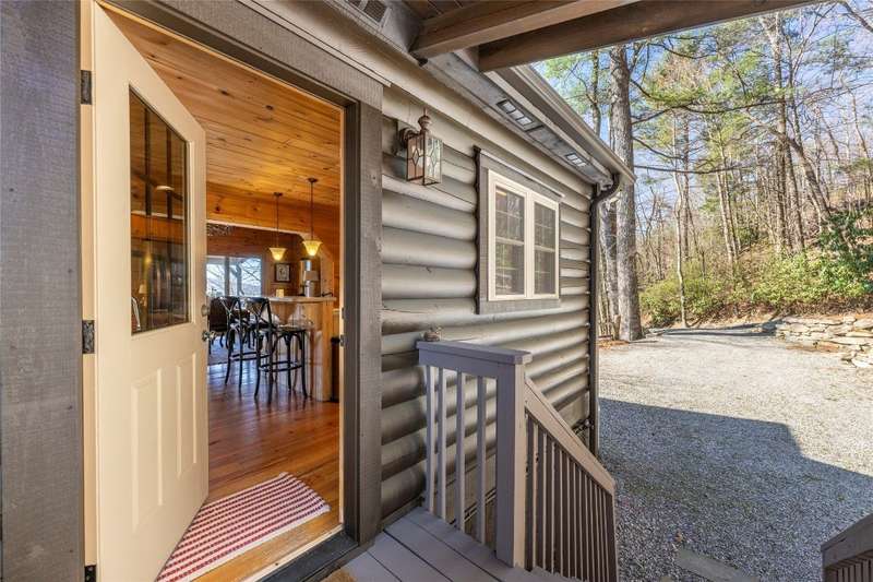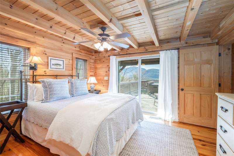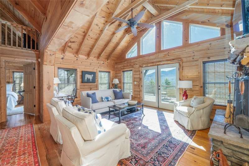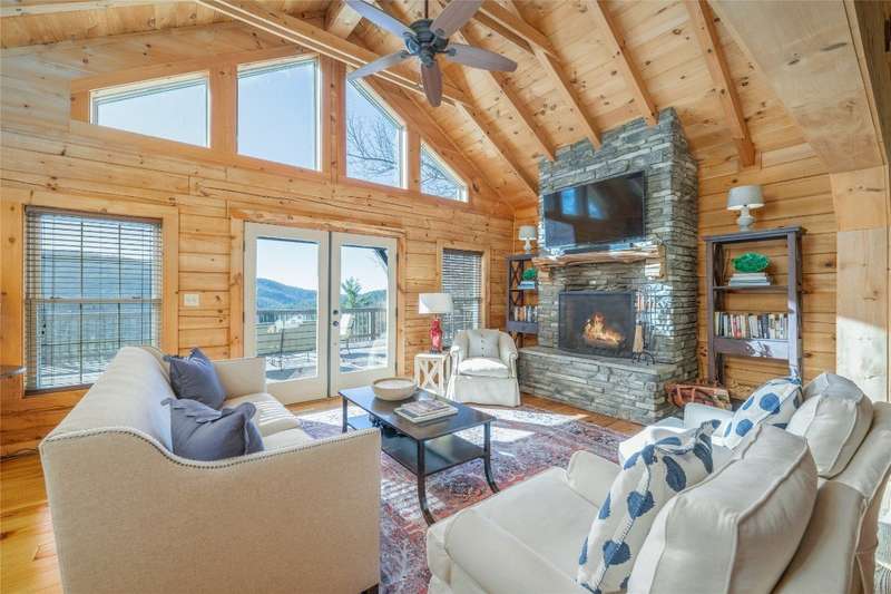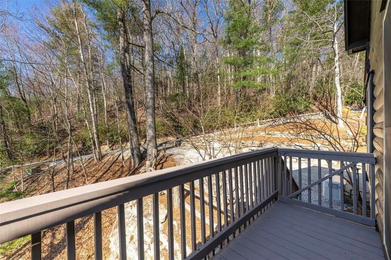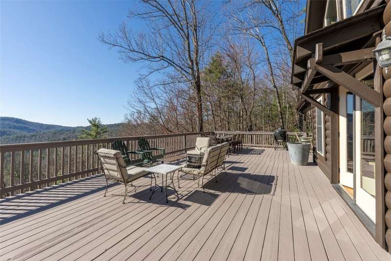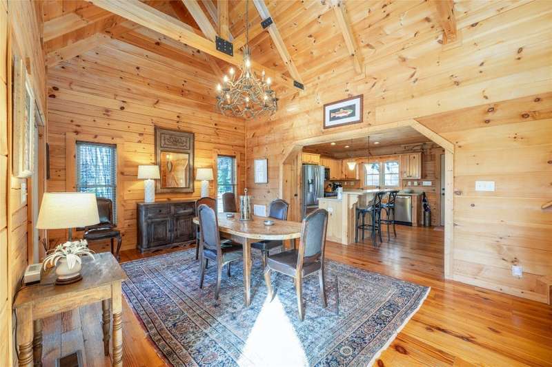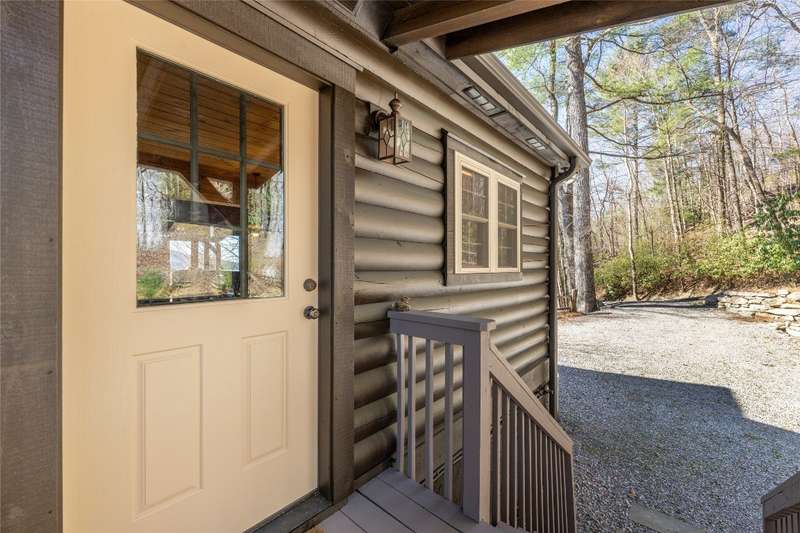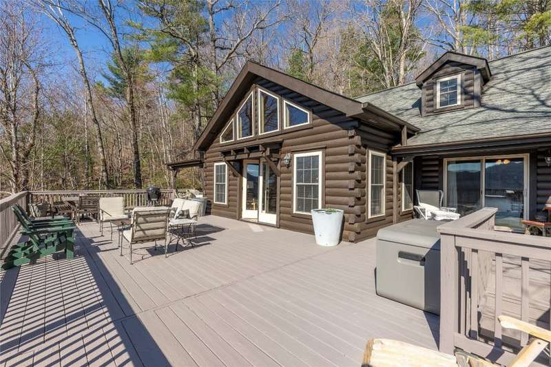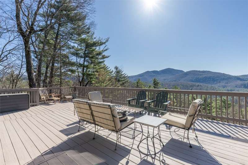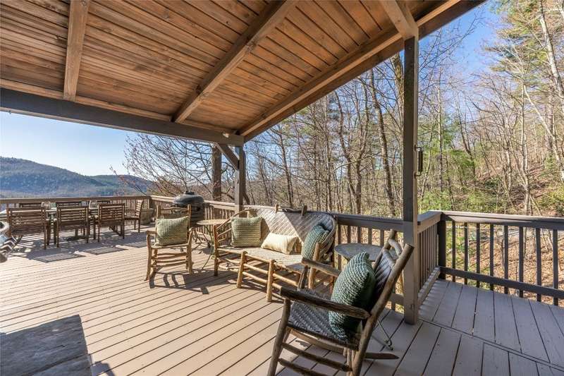Perched on a scenic 3-acre +/- lot in Holly Berry Estates, this impressive log home captivates with its rustic allure and long-range mountain views. From nearly every room, gaze upon the beauty of Little Terrapin and pristine national forest land. Designed for mountain living with sophistication, this home blends elegant interiors, idyllic outdoor spaces, and breathtaking vistas. Step into the main living area, where vaulted ceilings with exposed timber beams create an expansive yet inviting atmosphere. The living room centers around a striking fireplace adjacent to large windows and French doors that connect to a sprawling back deck. Here, the panoramic views offer the ideal backdrop for quiet mornings or social gatherings. The adjoining dining room extends to a covered portion of the deck - complete with fireplace - making it perfect for enjoying mountain evenings surrounded by natural beauty. The thoughtfully designed kitchen combines style and function with a breakfast bar, stainless steel appliances, pendant lighting, and ample pantry storage. The main floor features two luxurious bedrooms. The primary suite's sliding doors open to sweeping mountain views and lead to another covered area of the deck. Its indulgent ensuite bathroom includes a large jetted tub, a separate shower, and dual vanities. A second bedroom with a full bathroom provides additional accommodation. On the upper level, a charming loft bedroom with its own full bathroom offers an airy retreat that is perfect for guests. Meanwhile, the lower level transforms into an entertainer's paradise, with a family room featuring a gas log stove and French doors leading to the lower, covered deck that shares the same mesmerizing views as the upper level. A large, open game and entertainment room includes a counter and sink, adding both functionality and fun. This level also has a bedroom, a full bathroom with a laundry area, and a generous utility and storage room. Modern conveniences include fiber internet, an EV charging station, a generator, and easy access to a level parking area. Combining rugged mountain charm with thoughtful design and stunning scenery, this property is a remarkable retreat for those seeking both beauty and comfort. Holly Berry Estates is situated at the base of Whiteside Mountain and has two private lakes for residents to enjoy fishing, swimming and non-motorized boating.