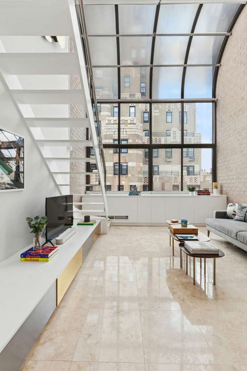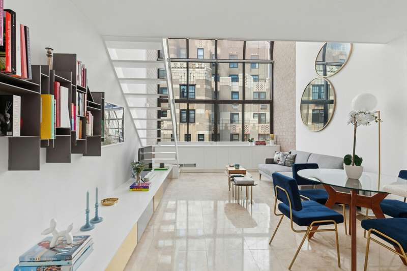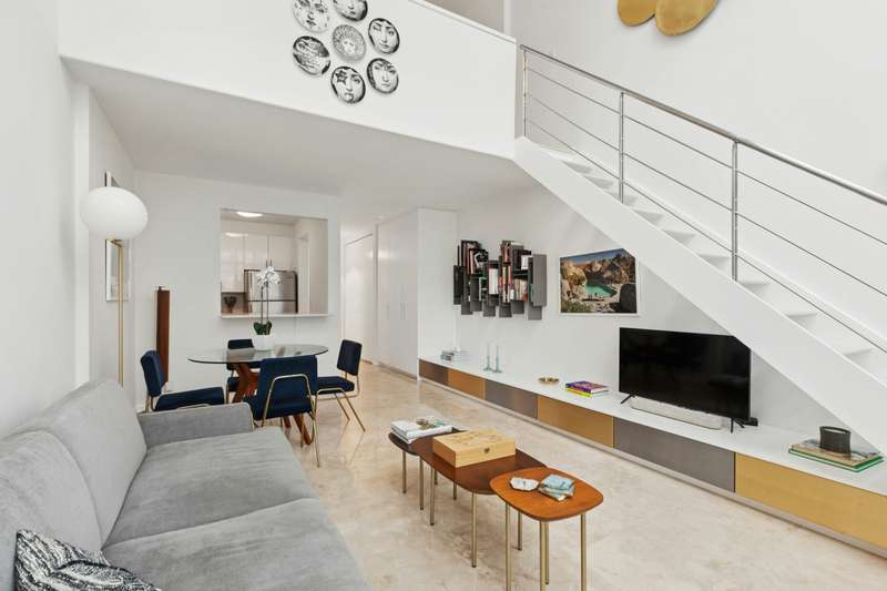 Welcome to 32 East 76th Street Residence 1403, the most special one bedroom in the building. Soaring ceilings, dramatic light, and a prime Upper East Side location define this unique "loft" like residence. Upon entering, a striking wall of floor to ceiling windows floods the first level with natural light, showcasing ceilings that rise to approximately 17 feet. The entry provides a generous coat closet and features a powder room. Marble tile expands the entire first floor. The kitchen with a pass-through breakfast bar flows seamlessly into the open living and dining area, creating a perfect space for both entertaining and everyday living.