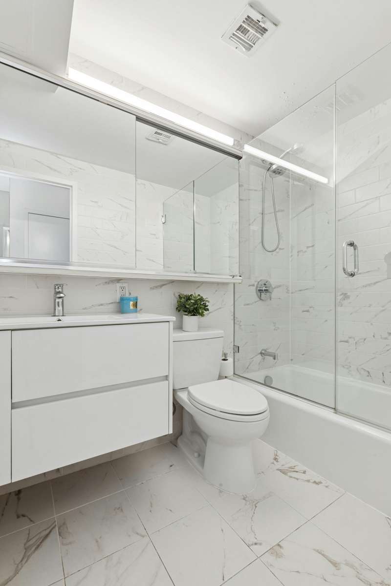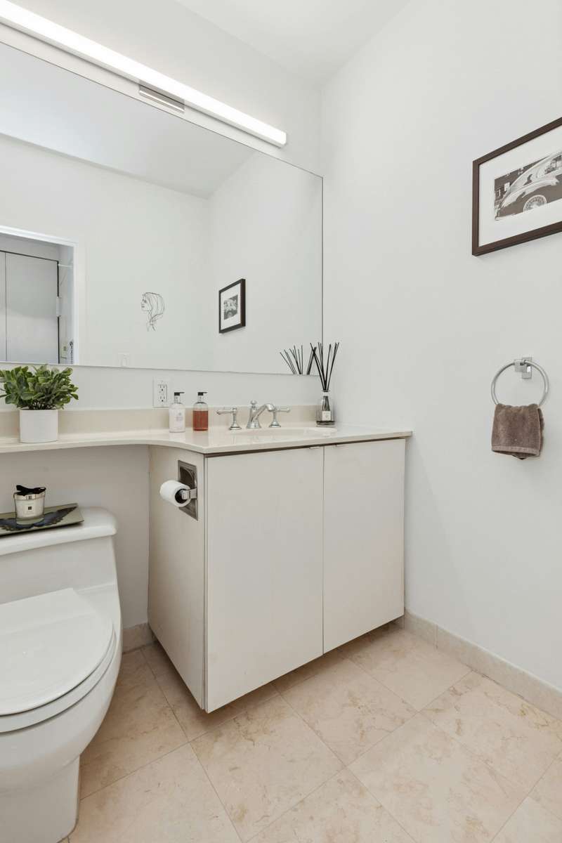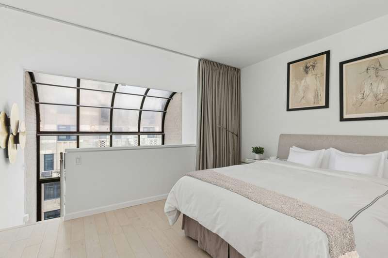 Upstairs, the lofted bedroom suite is illuminated by the spectacular oversized windows and features a large outfitted closet, and a fully renovated bathroom, providing both comfort and privacy. The residence enjoys the convenience of dual entrances on the 14th and 15th floors, offering flexibility and ease of access.