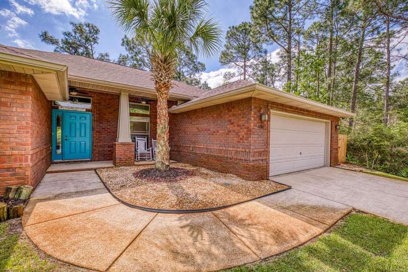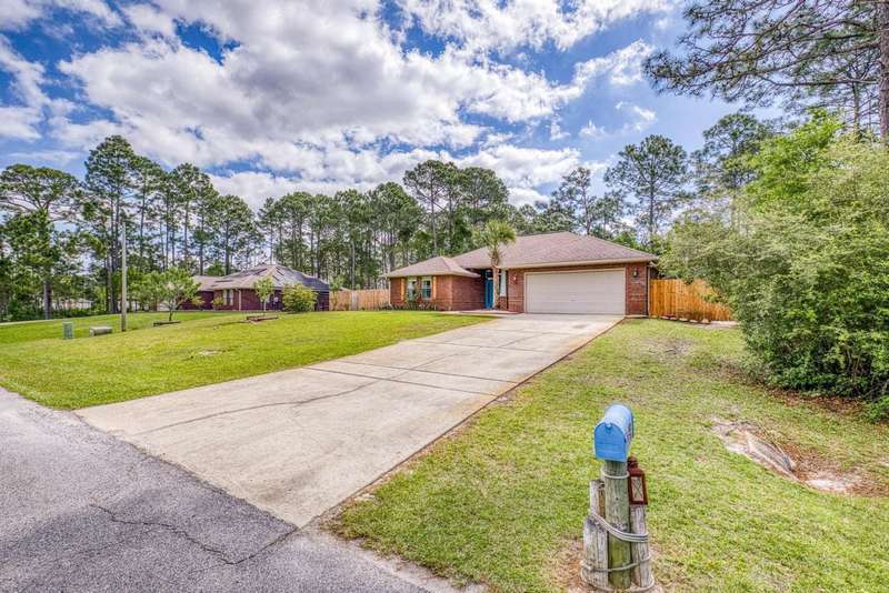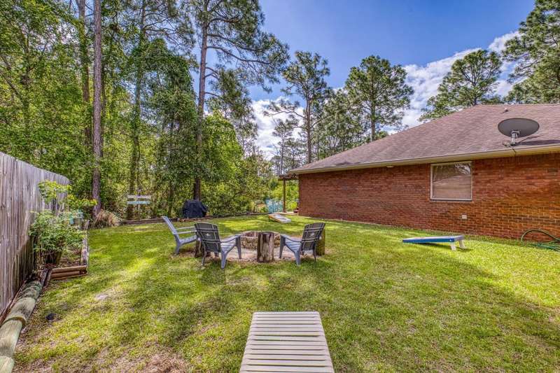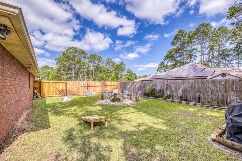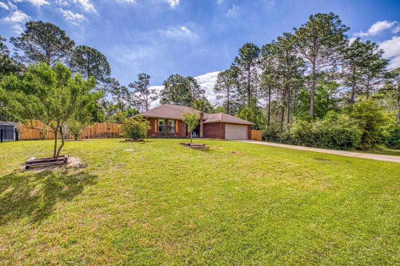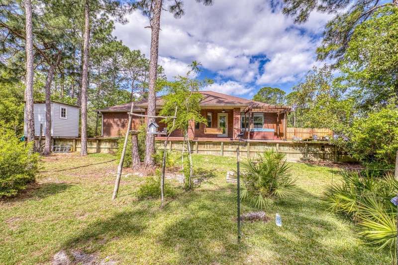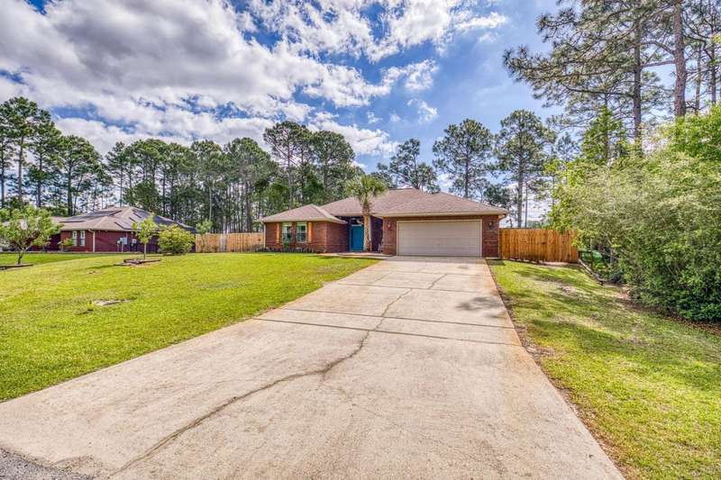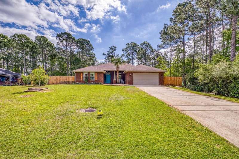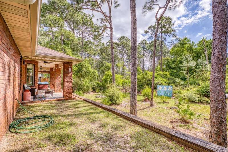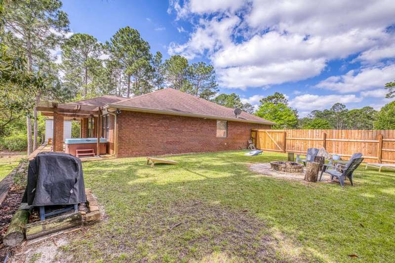 Discover tranquility in this meticulously maintained, freshly painted, all-brick residence nestled within the desirable Holley By The Sea community and adjacent to a lush wooded area just teeming with birds, flora and fauna. Built in 2010, this inviting home offers a perfect blend of comfort and privacy, ideal for those seeking a peaceful retreat. This home boasts 4 generously sized bedrooms - all with walk in closets - and 2 full bathrooms - both with double vanities, providing ample space for family and guests. A separate office, flex room or 5th bedroom offers the perfect environment for remote work, a quiet study or guests. Solid floors like vinyl plank and tile are throughout the home with the exception of the back bedroom which has new wall to wall carpet. You will be welcomed w ith a covered front porch with ceiling fan, a bright and airy entry foyer and high ceilings, but your eyes will be drawn to the back yard with its large covered patio, additional trellis covered hot tub and the natural beauty of a lush wooded back yard. There are roses, lemongrass - great to keep the mosquitos away - pear trees, blueberries and blackberries. There is also a large side lawn area with a fire pit and plenty of room for games and pets. Back inside - the kitchen features granite counter tops, tile floors, pantry, breakfast bar, large dining area overlooking the back yard and electric appliances. The main bedroom is HUGE and ensuite bath features cultured marble double vanity, separate shower, garden tub, water closet and walk-in closet. You will love the solid all brick exterior, gutters and hurricane shutters. Enjoy all of the HBTS amenities including the Multi-Million Dollar Rec Center with its pools, parks, tennis, pickleball, fitness center, ballfields, basketball courts, fishing pier, boat launch and waterfront RV Guest Rental Area, and still be close to Military Bases, Shopping, Restaurants and of course the Navarre Beach - voted one of the best, most relaxing beaches in the Country! Make arrangements to see this home today!