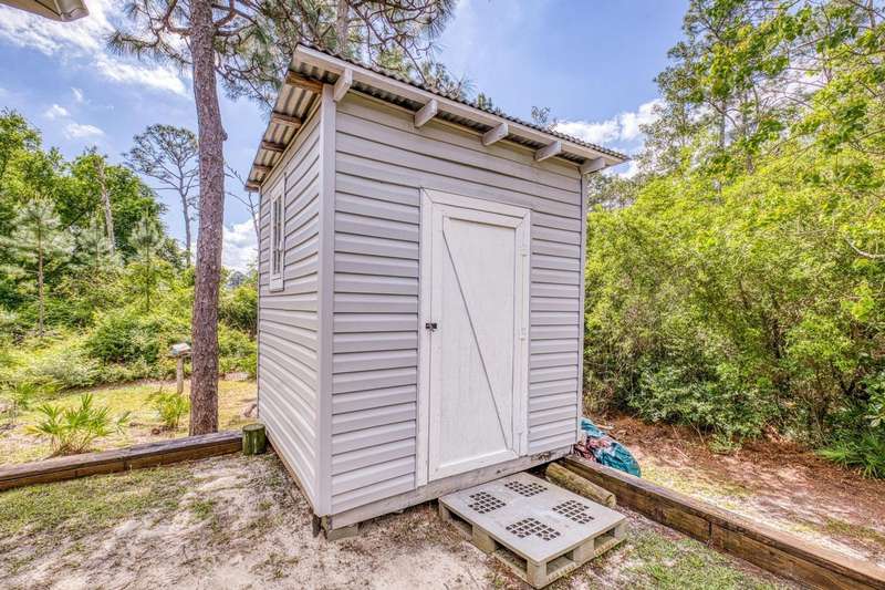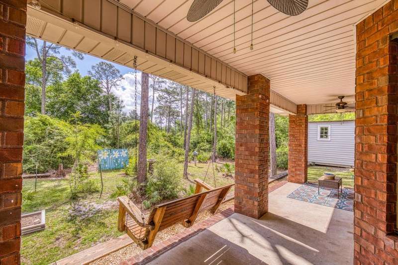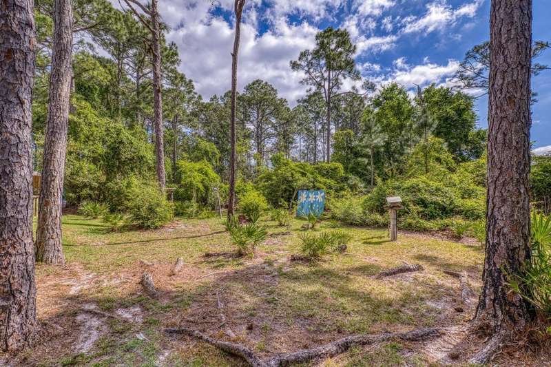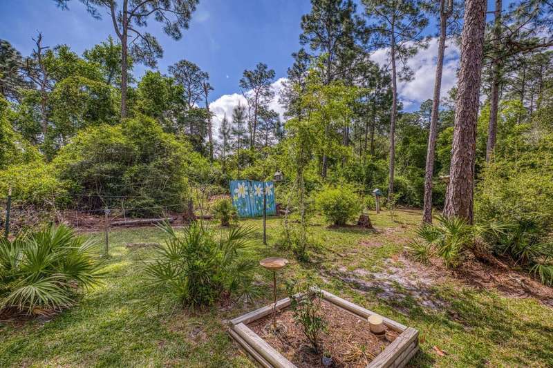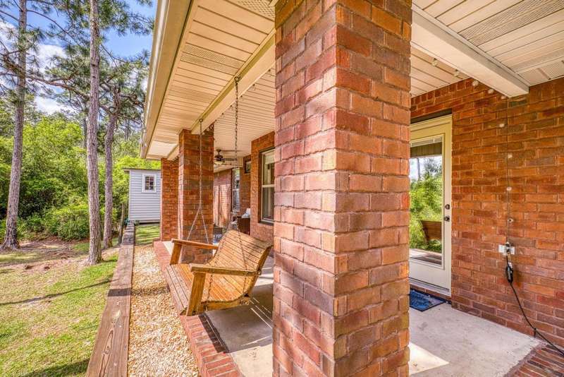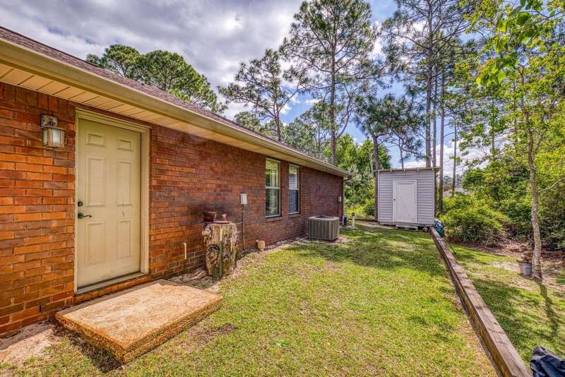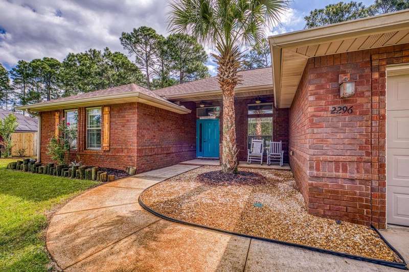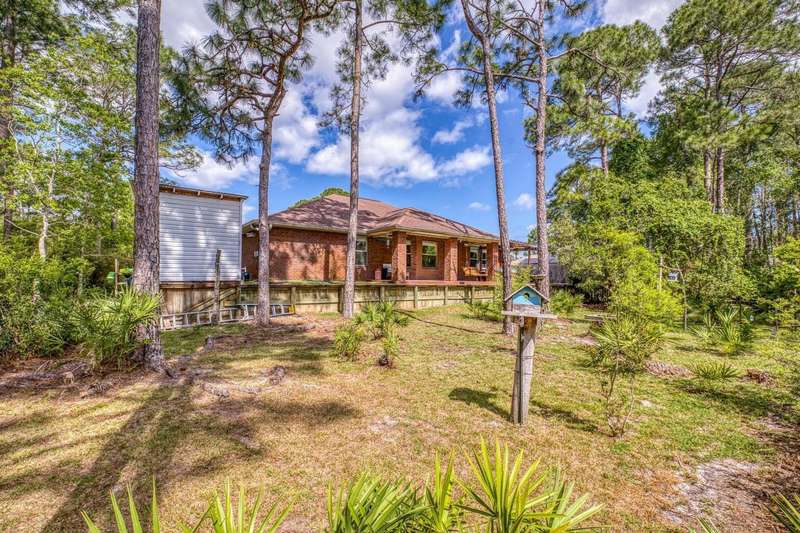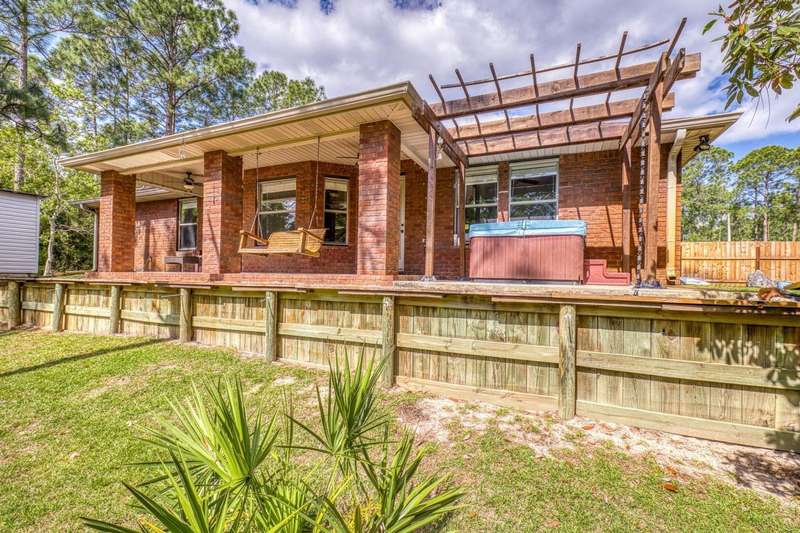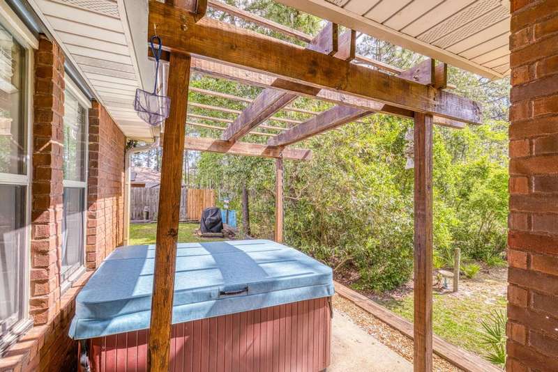 Discover tranquility in this meticulously maintained, freshly painted, all-brick residence nestled within the desirable Holley By The Sea community and adjacent to a lush wooded area just teeming with birds, flora and fauna. Built in 2010, this inviting home offers a perfect blend of comfort and privacy, ideal for those seeking a peaceful retreat. This home boasts 4 generously sized bedrooms - all with walk in closets - and 2 full bathrooms - both with double vanities, providing ample space for family and guests. A separate office, flex room or 5th bedroom offers the perfect environment for remote work, a quiet study or guests. Solid floors like vinyl plank and tile are throughout the home with the exception of the back bedroom which has new wall to wall carpet. You will be welcomed w ith a covered front porch with ceiling fan, a bright and airy entry foyer and high ceilings, but your eyes will be drawn to the back yard with its large covered patio, additional trellis covered hot tub and the natural beauty of a lush wooded back yard. There are roses, lemongrass - great to keep the mosquitos away - pear trees, blueberries and blackberries. There is also a large side lawn area with a fire pit and plenty of room for games and pets. Back inside - the kitchen features granite counter tops, tile floors, pantry, breakfast bar, large dining area overlooking the back yard and electric appliances. The main bedroom is HUGE and ensuite bath features cultured marble double vanity, separate shower, garden tub, water closet and walk-in closet. You will love the solid all brick exterior, gutters and hurricane shutters. Enjoy all of the HBTS amenities including the Multi-Million Dollar Rec Center with its pools, parks, tennis, pickleball, fitness center, ballfields, basketball courts, fishing pier, boat launch and waterfront RV Guest Rental Area, and still be close to Military Bases, Shopping, Restaurants and of course the Navarre Beach - voted one of the best, most relaxing beaches in the Country! Make arrangements to see this home today!