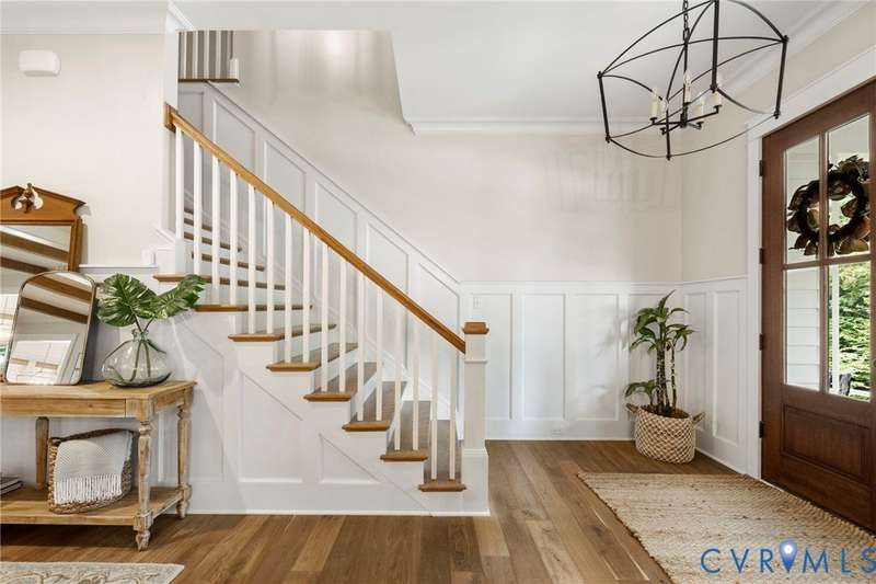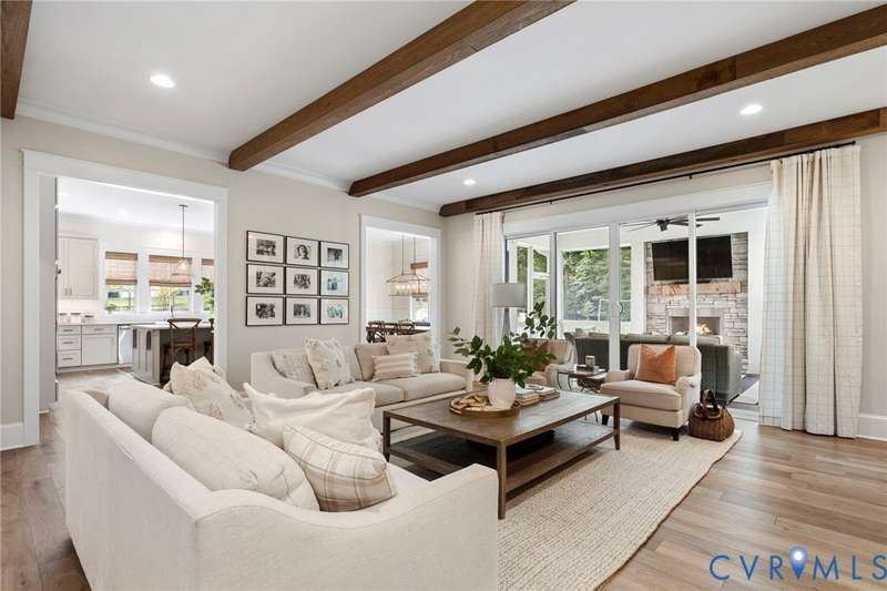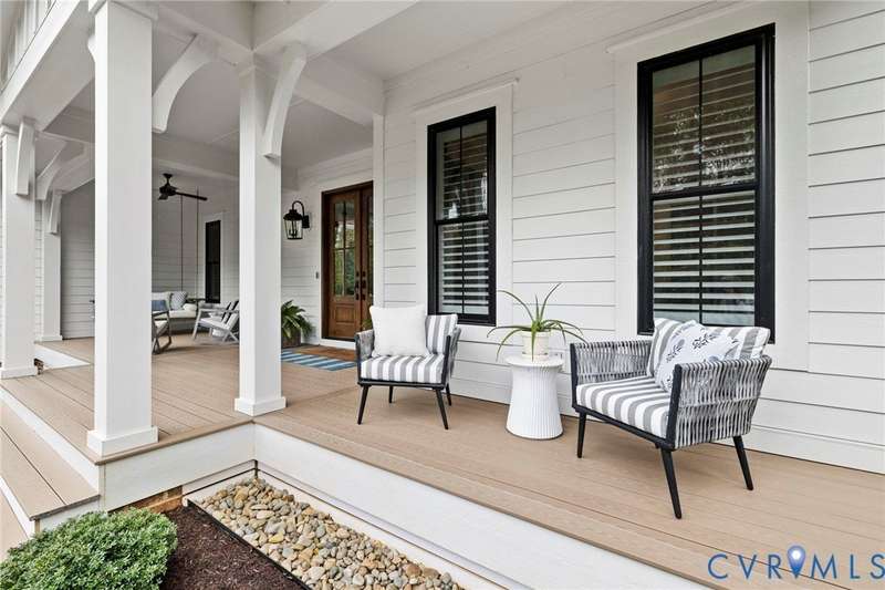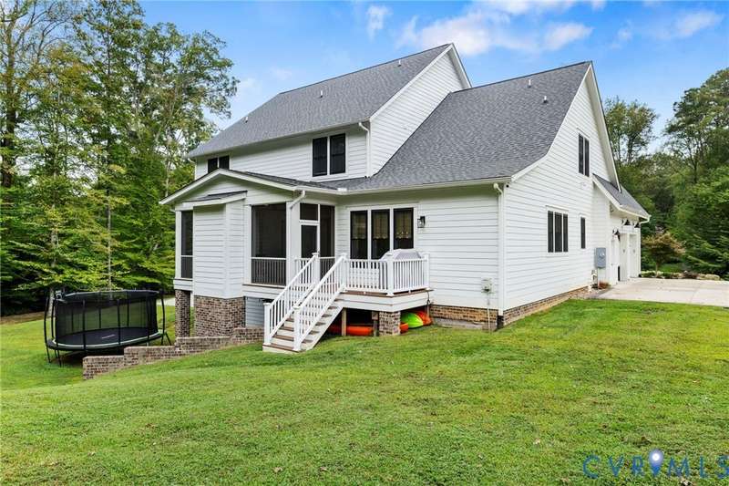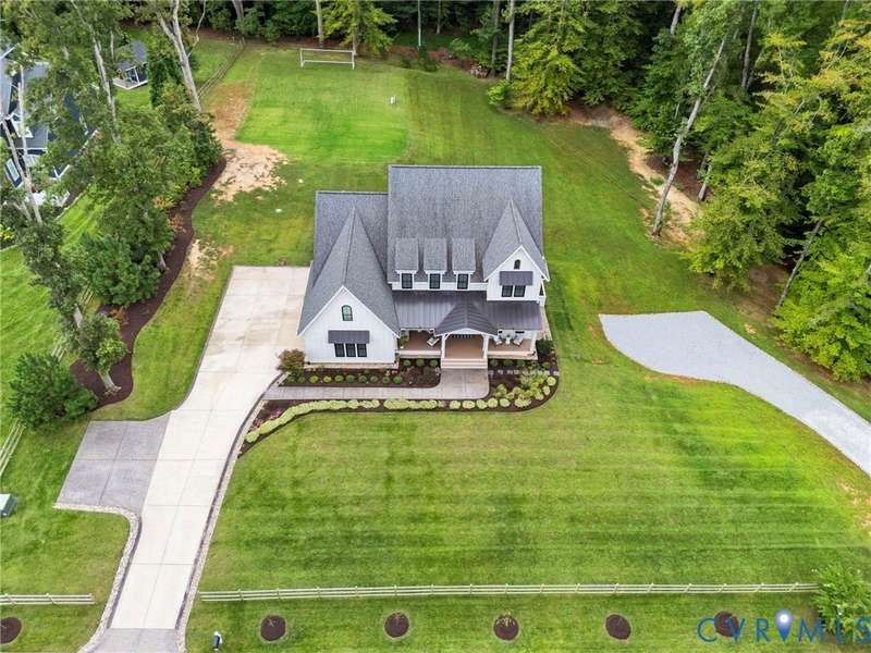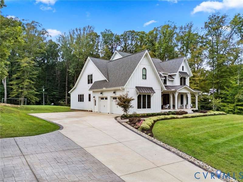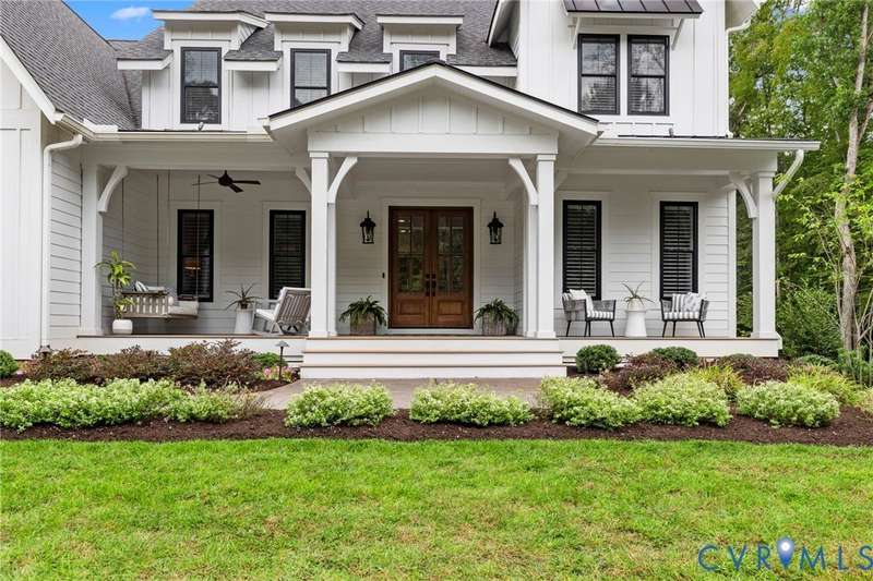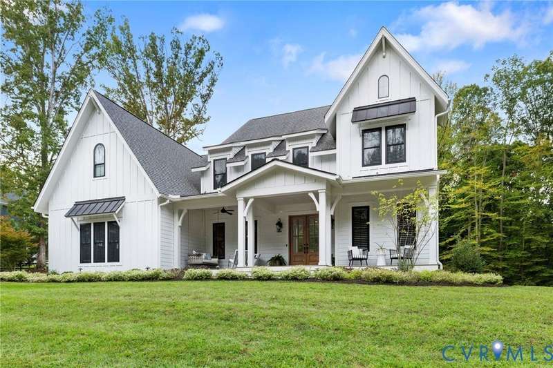 This custom-designed Pacific Farmhouse by Biringer Builders is a masterpiece of craftsmanship & design, blending elevated sophistication with everyday comfort. Situated off of historic Old Gun Road on 2 private acres, the home offers the serenity of a retreat while remaining minutes from conveniences. From the inviting front porch to the welcoming foyer, every detail has been thoughtfully curated. Soaring 10' ceilings, exquisite moldings & wide-plank wood floors establish an atmosphere of refinement. A paneled dining room & butlers pantry provides the perfect setting for gatherings, while the light-filled family room with beamed ceilings, fireplace, and built-ins flows seamlessly to a three-season screened porch with a stone fireplace-ideal for entertaining & relaxation. The chef's kitchen is a true showstopper, featuring a large quartz island with breakfast bar, floor-to-ceiling cabinetry, designer backsplash, luxury appliances, and a sunlit dining area. A walk-in pantry, office/mudroom, powder room and laundry enhance main-level living. The primary suite is a luxurious retreat, wrapped in windows with refined crown molding. The spa-inspired bath offers a double vanity, walk-in shower, private water closet, linen storage, and a boutique-style walk-in dressing room with custom built-ins. Upstairs, a versatile loft connects four spacious bedrooms, including a Jack-and-Jill suite plus a second laundry room with cabinetry. An additional suite with full bath offers flexible space for a media room, office or guest accommodations with expansion potential in the wired storage area. The finished lower level provides abundant living space with a great room, playroom, guest suite and direct walk-out to a private patio. An oversized two-car garage offers excellent storage. Outdoors, the property is designed for both recreation & retreat with a sports field and wooded trails and convenient second stone driveway. This remarkable residence offers a rare opportunity to enjoy elevated living in the heart of beautiful Midlothian.