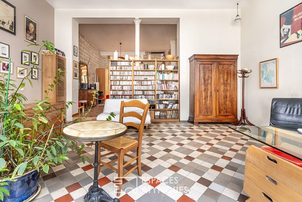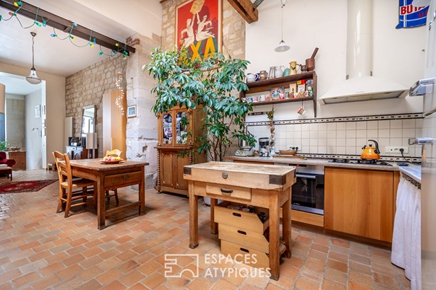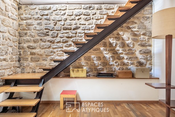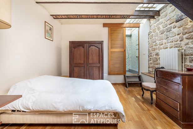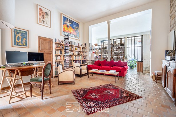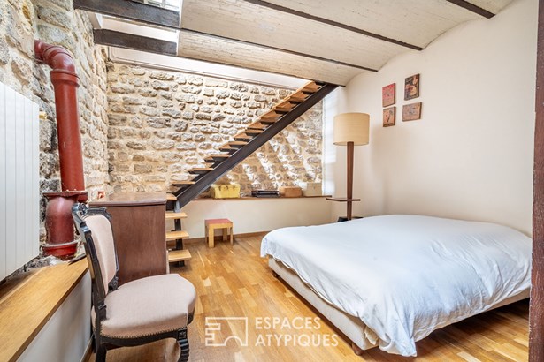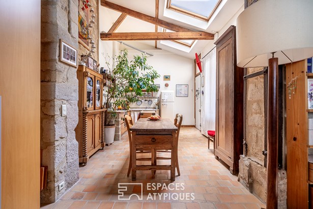 The double-aspect loft offers a large, bright 47 m2 living room with generous volumes, combining exposed stone, beams, and antique tiles.