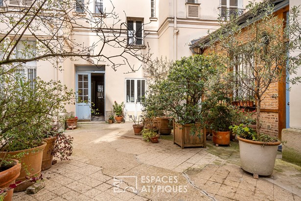 The entrance is through the former back shop, like a brick cottage, accessible from a small tree-lined courtyard.