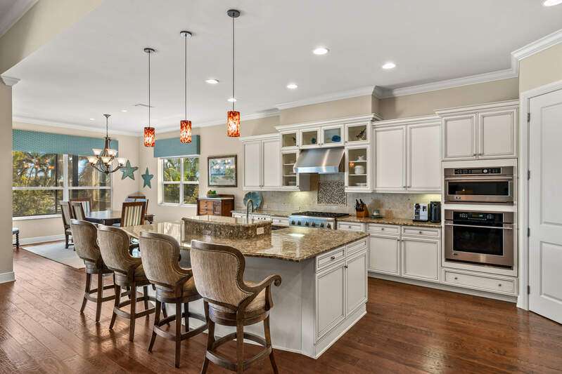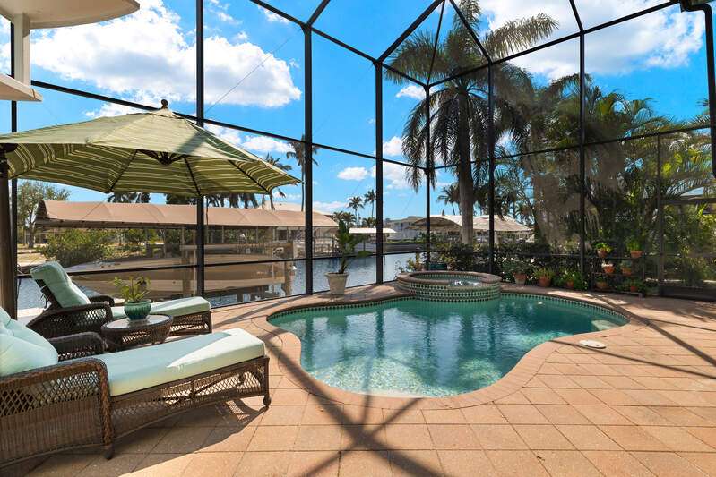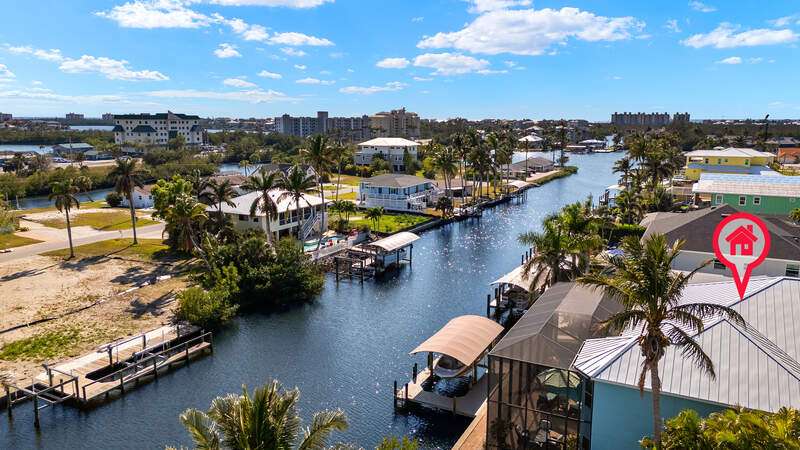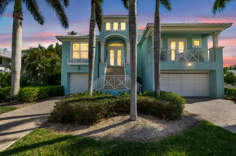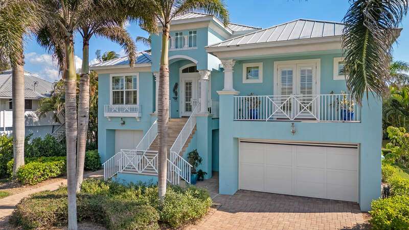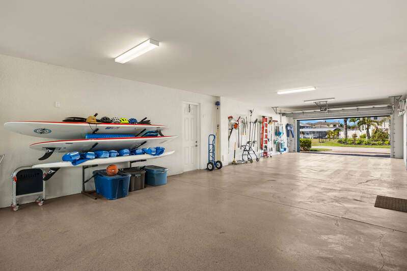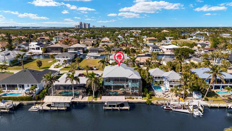 This custom-built Arthur Rutenburg Belize home is a waterfront paradise offering easy Gulf access for the nautical enthusiast. Featuring 3 bedrooms plus a den and 4 bathrooms across 3,227 square feet, this residence masterfully blends luxury and functionality. The private elevator makes it easy to carry groceries and heavy items to the upper level. For the car collector or hobbyist, the extraordinary 6-car garage "man cave" includes a remote screen door-perfect for entertaining while showcasing your car collection. Boat lovers will appreciate the 75' seawall, captains walk, private dock and 10,000 lb covered boat lift, making waterfront adventures a breeze. Hurricane-ready with impact glass throughout and sub-surface concrete pilings beneath the footings, pool, and spa, this home stands strong against Florida's elements. The 24-gauge snap-loc metal roof system and Square D 60 AMP standby generator panel provide additional peace of mind. Elegant design touches include 12" recessed ceilings in the primary bedroom, living room, and den, beautiful hardwood flooring throughout common areas, and crown molding that adds sophistication to every room. The spiral staircase connecting the balcony to the pool area creates a dramatic focal point. Enjoy your outdoor space with a fully-equipped kitchen and a Peterson 34" gas firepit-ideal for evening gatherings. Modern conveniences include a tankless water heater, and 2024 GE washer and dryer. Located minutes from Bonita Beach, restaurants, and shopping, this waterfront gem offers the quintessential Florida lifestyle with all the bells and whistles you could desire.