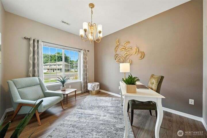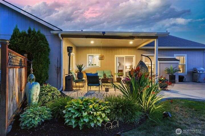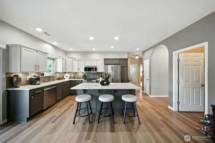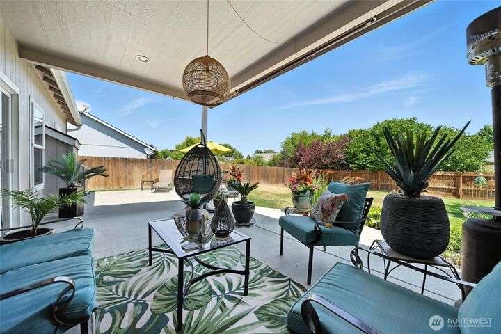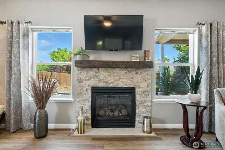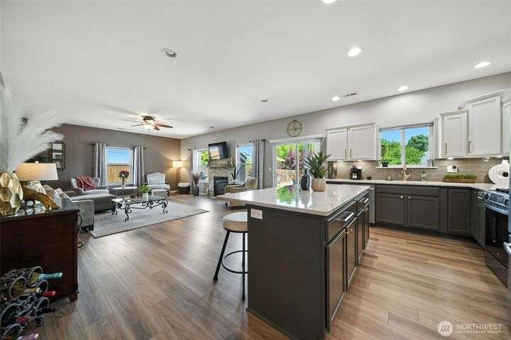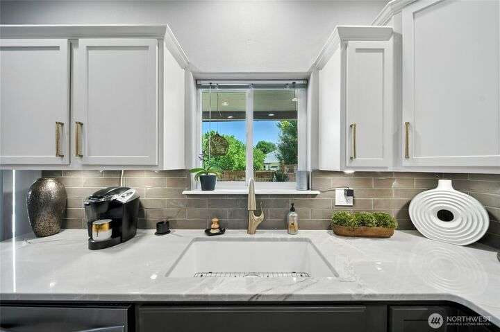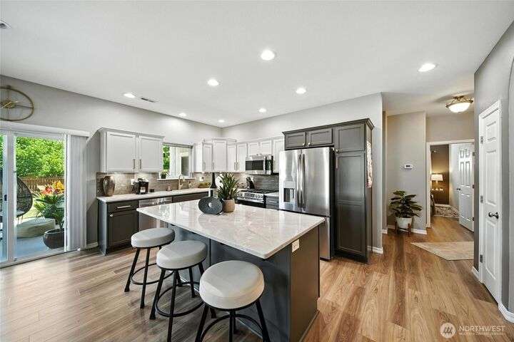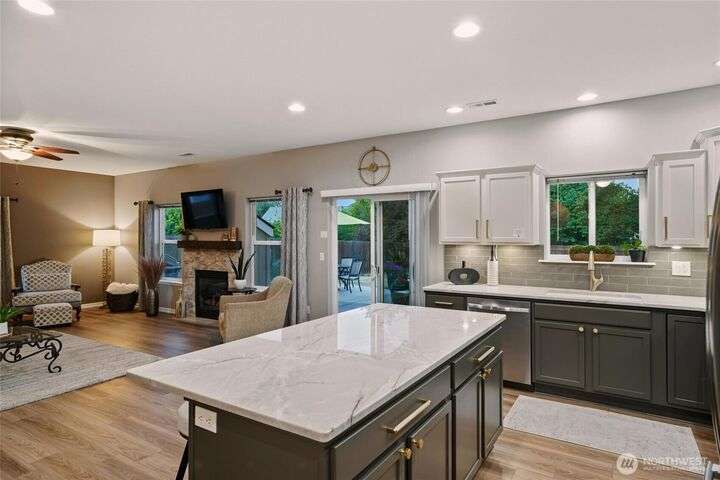 Ultimate expression of sophistication in remodeled home. To the right of foyer is lg front/formal dining rm w vaulted ceilings. Home office to your left. A big surprise awaits you in kitchen & great room. Carefully designed w distinction, a 6.25' island & counters are signature elements, w real Quartzite Brazilian stone & Italian backsplash, complementing butter-rich finish cabinetry w brass hardware. Entertaining space has all new luxury vinyl flooring, 9' ceilings & cozy stone-stacked fireplace that flows to entertaining patio- partially covered & private. Lg fenced yard. Primary w full ensuite, walk-in closet & slider to enjoy patio year-round. New gas & stainless appliances & freshly painted. You won't want to miss this stunning home.