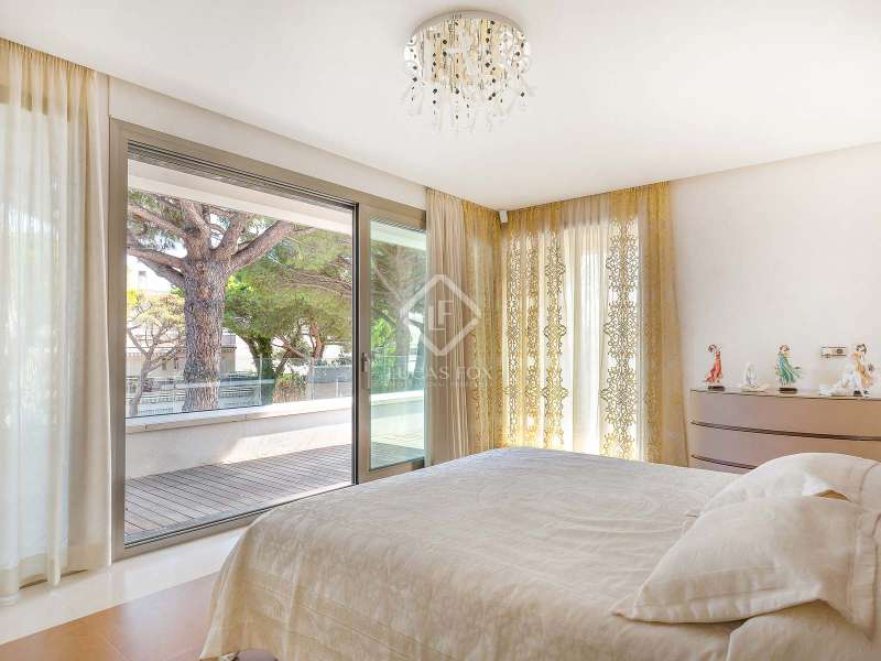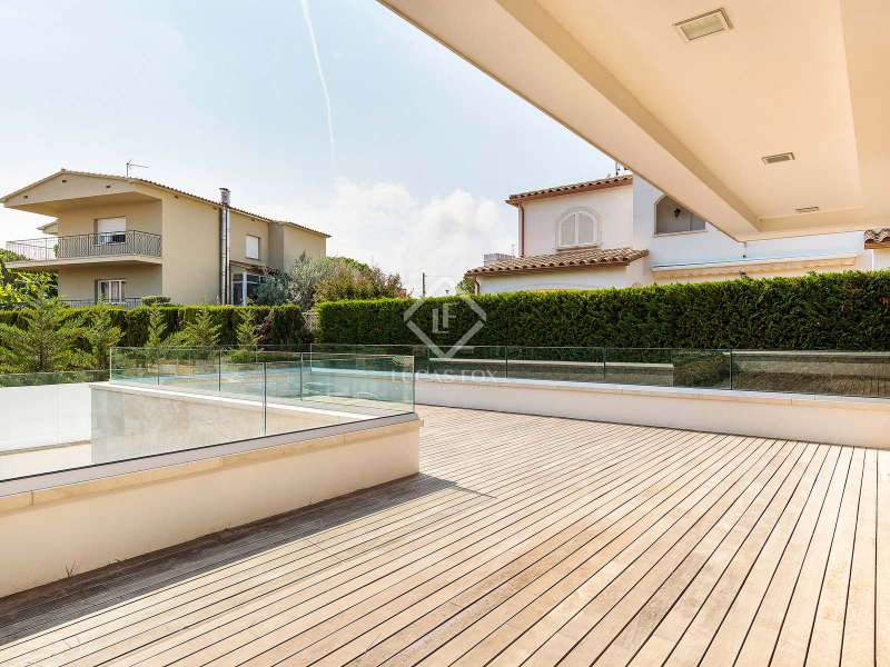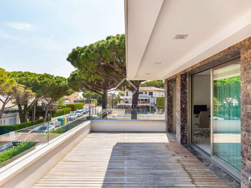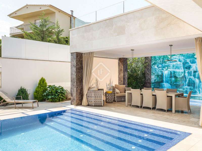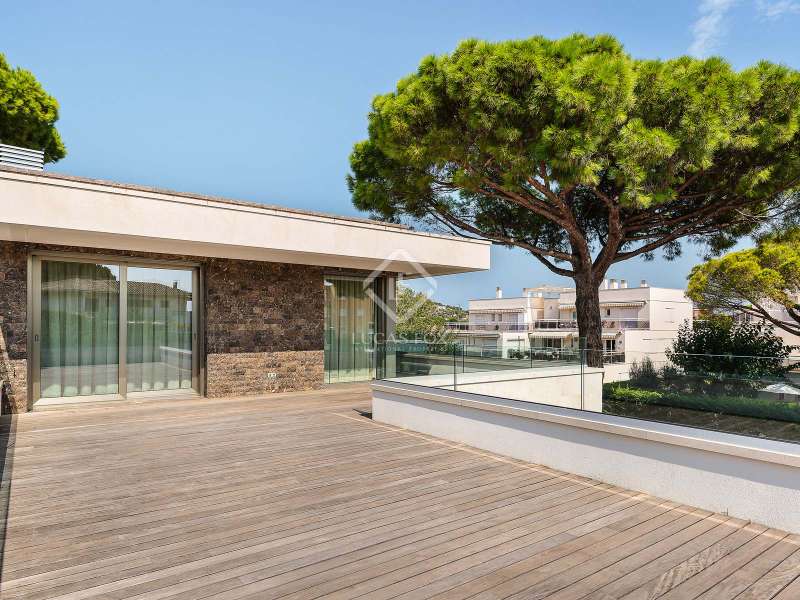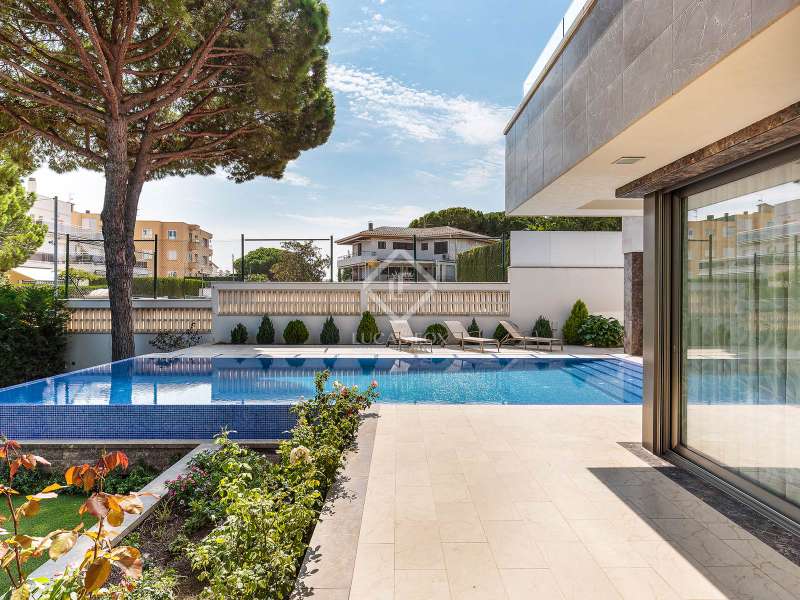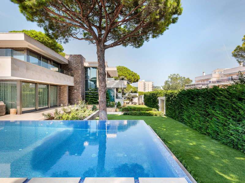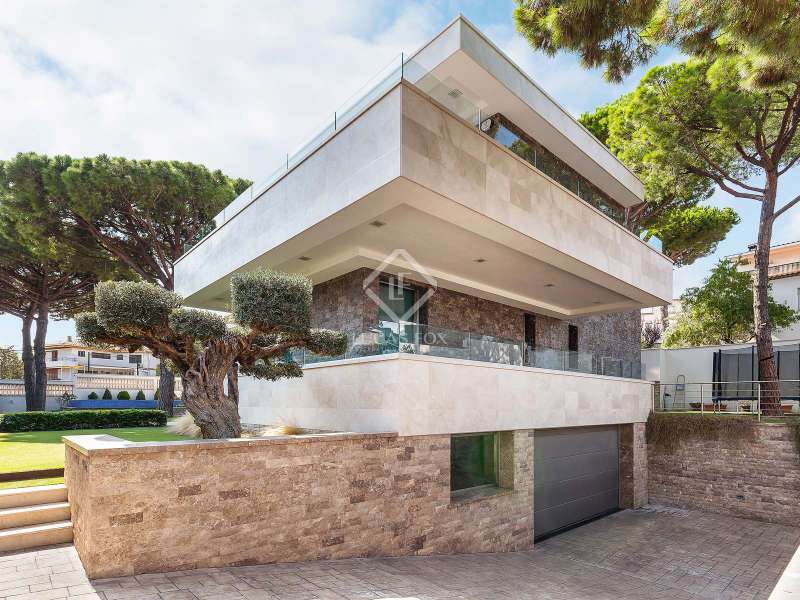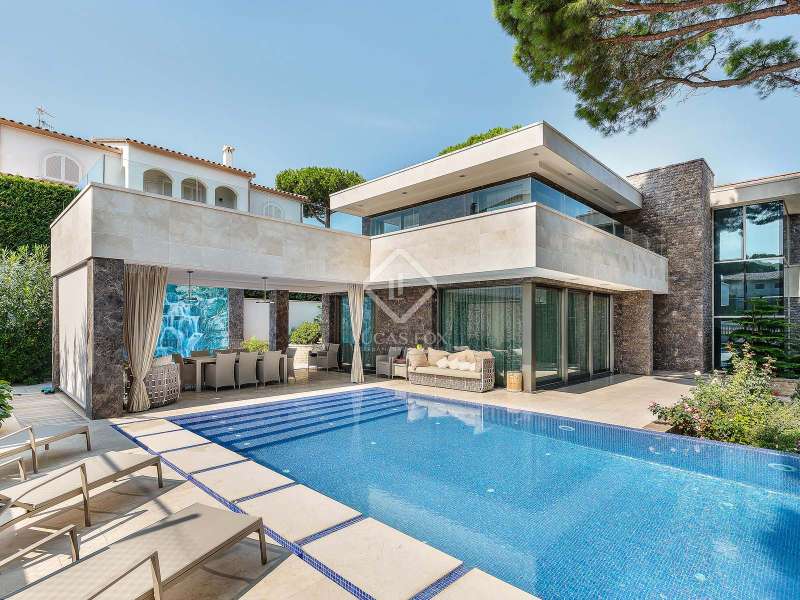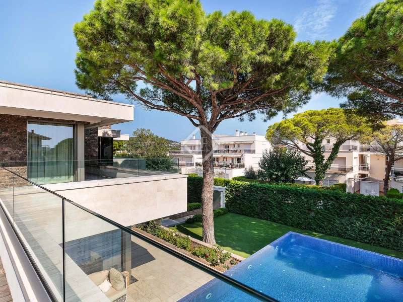 This impressive modern villa with a built area of 837 m² occupies a privileged location at the heart of Playa de Aro, on the Costa Brava. With the beach and all other amenities just 2 minutes away on foot, this is an ideal location for a coastal family home. Built in 2015 the finishes are modern and of very high quality. On the main floor we find the spacious, sunny living room with a fireplace and access to the chill out terrace where we also find the heated pool and jacuzzi, the dining area with an island and a fully equipped kitchen diner with all appliances and access to the beautiful garden. Lastly on this floor we encounter a bedroom with an en-suite bathroom with a shower and a spacious terrace. The first floor offers 2 immense bedroom suites with a shower, a large dressing room and a private terrace each. There is a third bedroom suite with a shower on this floor. On the lower ground floor is a large cinema and games room, a climate controlled wine cellar, a utility room and a 2-car garage. The house has a lift to every floor and all rooms have large windows that allow plenty of light in. Additional features include the 9 solar panels that fuel the heating, as well as mains gas underfloor heating, an interior and perimeter alarm, security cameras in the garden, a diesel generator for back up in the case of a power cut and a private water well. A modern, luxury residence in Playa de Aro.