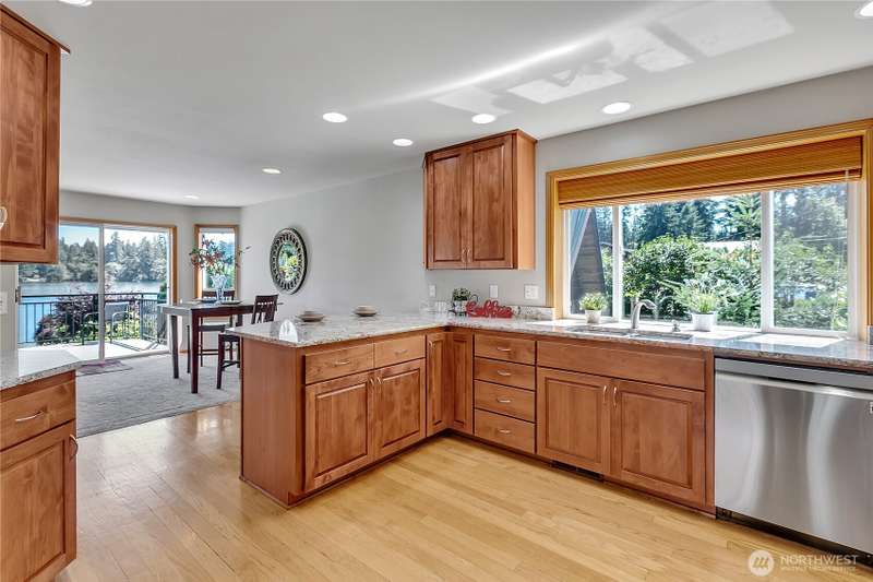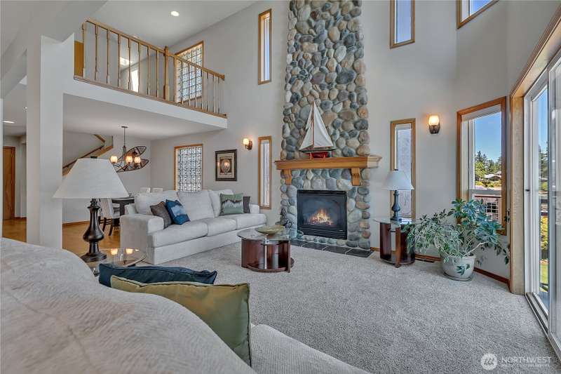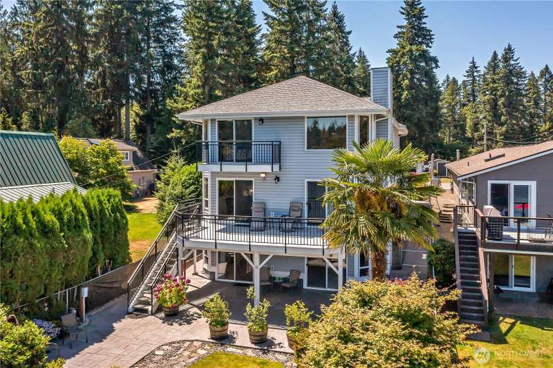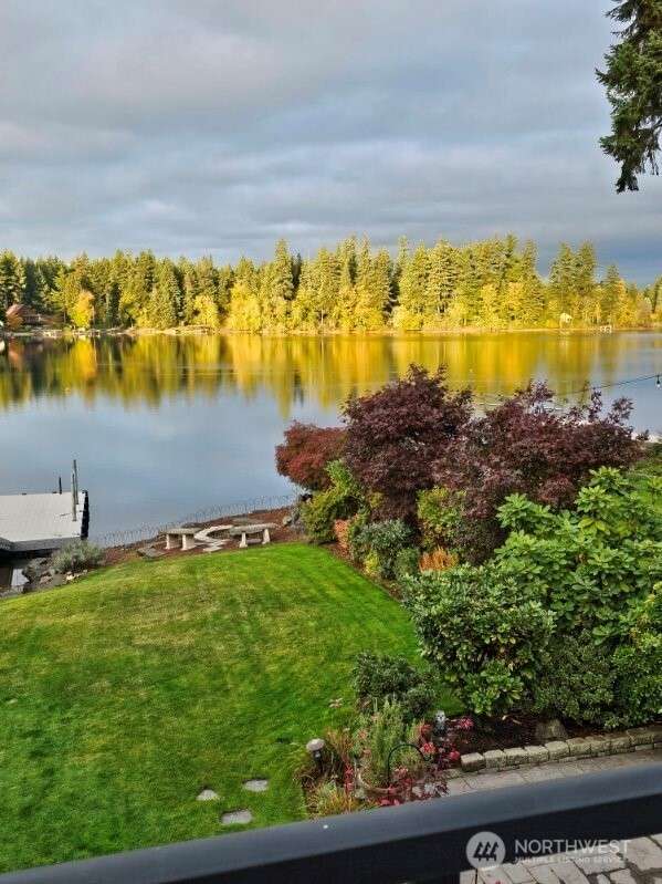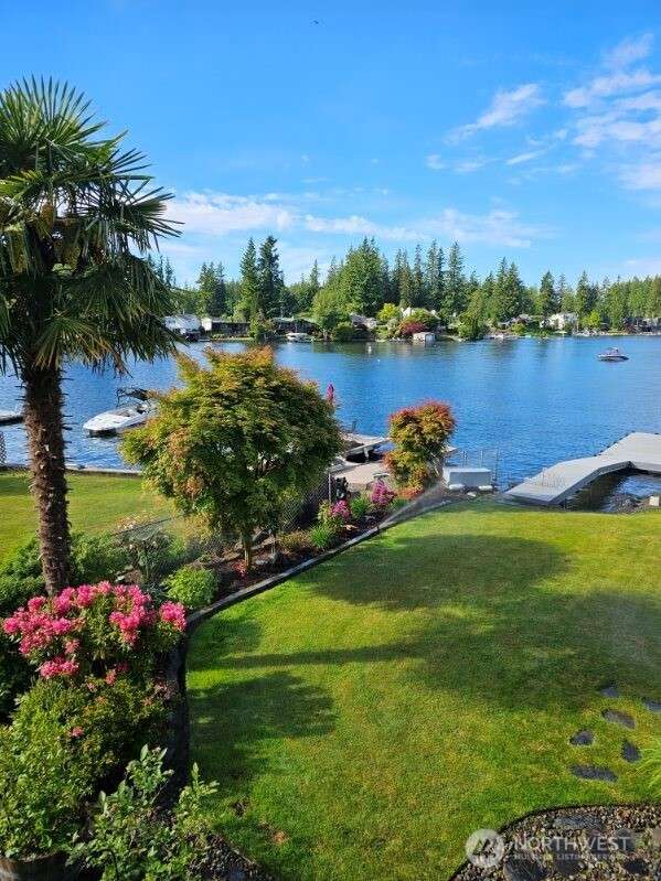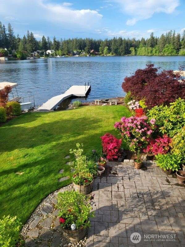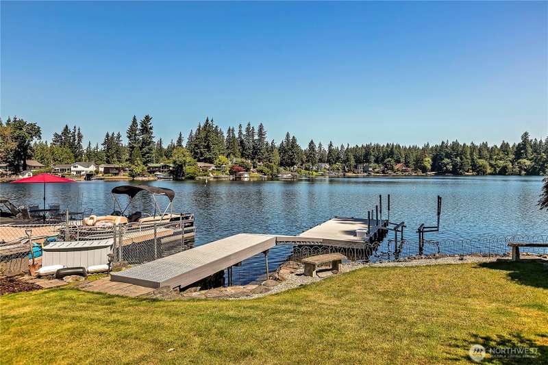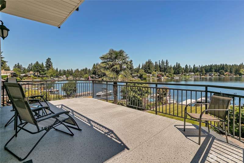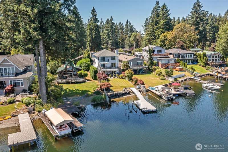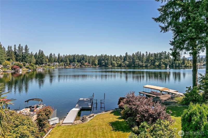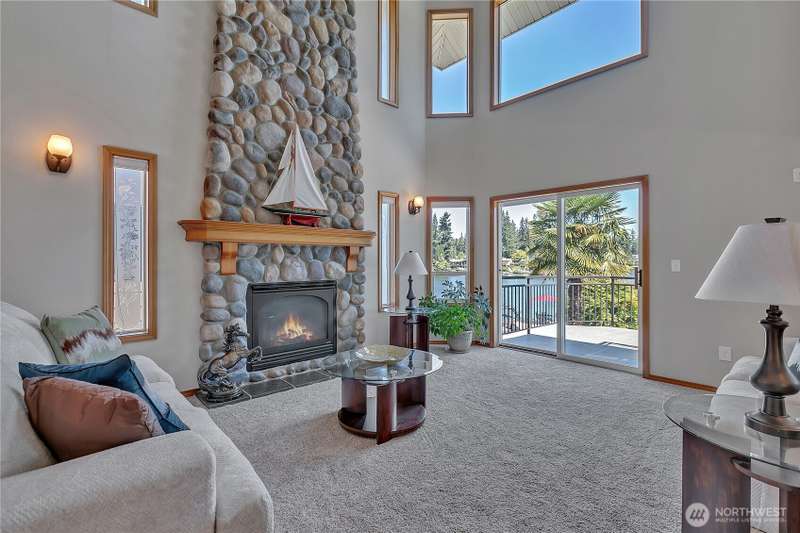 Lake living at its best! Beautiful, deep water, 40 feet of lake front home with soaring ceilings, open floor plan, gorgeous river rock fireplace, large deck, central air, remodeled chef's kitchen with gas cooking and newer appliances, newer carpet and paint, primary bedroom with deck, oversized bath and walk in shower, 2 more upper bedrooms with custom closets, additional full bath & upper laundry. Lower level boasts huge rec room, wet bar, full bath, guest bedroom, tons of storage, opens to patio and beautifully landscaped grounds, blueberries and potted plants for new owner, newer dock and boat lift. Gated entry, detached garage, shed, tons of parking! Newer roof and gutters, stand-by generator, connected to sewer, this one has it all!