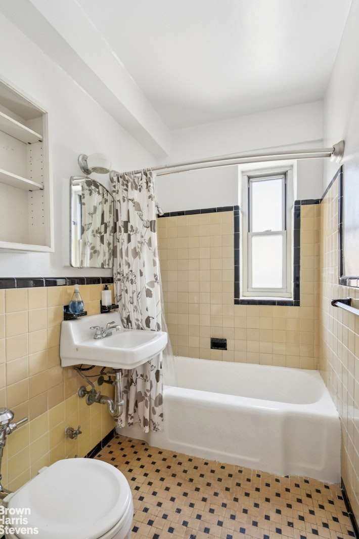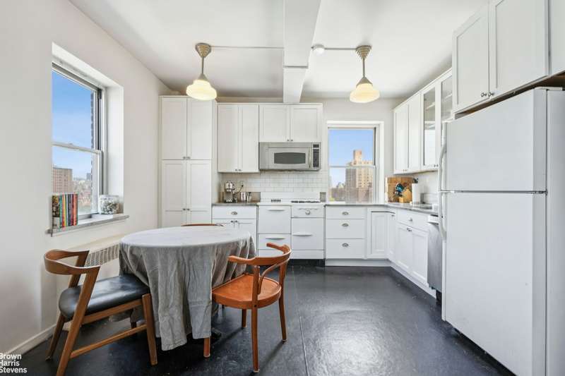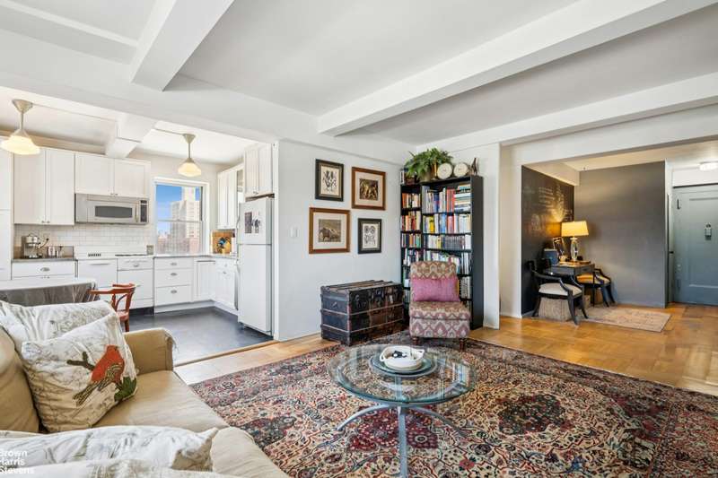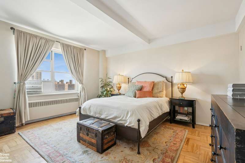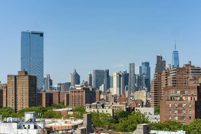 Airy top floor 1 bedroom with western & northern exposures! Extra large layout found only on the top two floors of the building. Enter via the foyer to an expansive, light filled great room with four windows and double exposures! Plenty of room for entertaining, dining, and relaxing. The generously proportioned kitchen has been fully opened to the living room for excellent flow, light and air. Dramatic views to the full downtown skyline and Empire State spire! The spacious bedroom is nicely separated from the main living, has two north facing windows as well as two closets, and can easily accommodate a king or queen size bed. A windowed bath, parquet strip floors, and high beamed ceilings round out the offering.