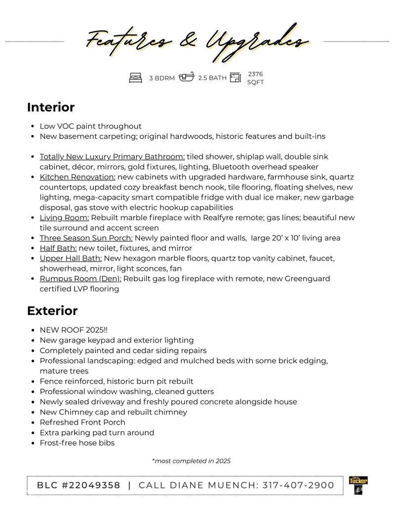 Charming Historic Elegance Meets Modern Living in Kesslerwood! Welcome to this beautifully renovated home in the highly sought-after Broadripple Kesslerwood neighborhood! Situated on a generous .27-acre lot, this timeless property blends the charm of the historic era with modern upgrades designed for today's lifestyle. Step inside through a separate foyer into light-filled, spacious living and dining rooms, featuring a cozy newly marble tiled and rebuilt fireplace and a stunning dining room with original chandelier. You'll love the protected original hardwood floors throughout, preserving the warmth and authenticity of the home. The dining room gives way to a 20' x 10' three seasons porch lined with windows, a perfect place for morning coffee or evening relaxation, and giving access to the fully fenced backyard. The newly renovated kitchen boasts all-new cabinetry, sink, flooring, lighting, floating shelves and a built-in cozy bench eat-in area, perfect for everyday living and entertaining. The primary ensuite includes a brand-new, spa-inspired bathroom, while additional bathrooms have been thoughtfully updated. The lower level features a large rumpus room with new GREENGUARD LVP flooring and a second newly rebuilt gas fireplace-plus a huge laundry/flex space featuring tile floor and painted walls, ready to customize as you wish: workout or dance room, art studio, play room Additional highlights include: * Brand-new roof * Fresh interior and exterior paint * Attached 2-car garage * Professionally refreshed landscaping with edged beds, trimmed trees, and fresh mulch *many more updates listed in photos. Don't miss this rare opportunity to own a character-filled home that offers both historic charm and modern convenience, all in a prime Broadripple location! Property presently does not have a homestead exemption, so taxes will be significantly lower when buyer files for a homestead.