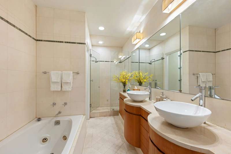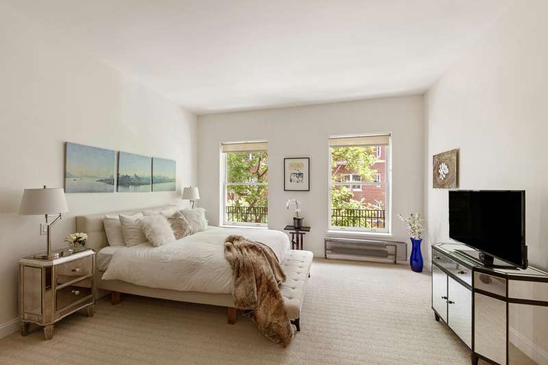Above the parlor floor is the first bedroom floor, offering a sprawling primary suite with an oversized primary bedroom and the home's second wood burning fireplace. A dressing room leads to a luxurious five-fixture en-suite bathroom with a spacious double vanity, twin-head stall shower, a deep jetted soaking tub and a dedicated water closet. On this level, there is a second bedroom overlooking the treetops of 91st Street, with a walk-in cedar closet and its own en-suite marble bathroom with a soaking tub. There are two more bedroom suites on the fourth floor, each with excellent closet space and dedicated marble bathrooms with soaking tubs. The bedroom floors are additionally serviced by a laundry closet with a vented washer/dryer.