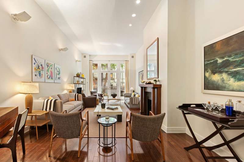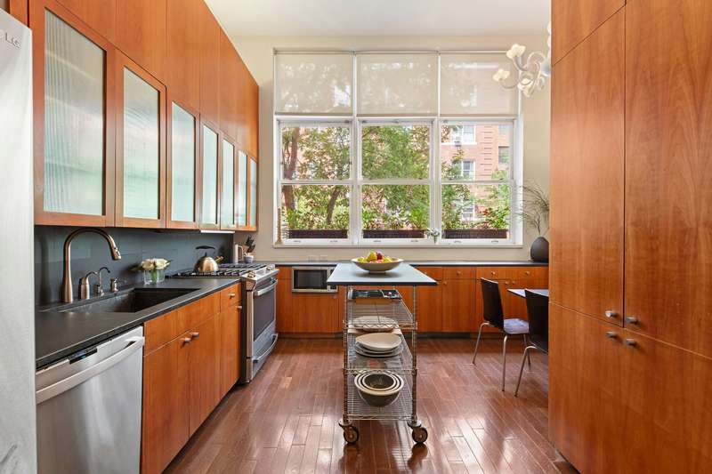 Grand-scale living is immediately showcased on the parlor level of this home, with soaring ceilings of nearly 13 feet anchored by a wall of glass with twin doors leading to the garden, bathing the floor in warm southern sun and offering a glamorous space in which to entertain at scale. On this floor, the living room is adorned with the first of the house's two handsome wood-burning fireplaces, and in its current open-plan used for dining as well, flows seamlessly into the dining area and the large eat-in kitchen with a built-in banquette affront a wall of windows overlooking leafy 91st Street. The kitchen features extensive storage with beautiful custom cherry wood cabinetry and a full suite of stainless steel appliances. This entertaining level is perfectly completed by a full bathroom as well as two walk-in closets.