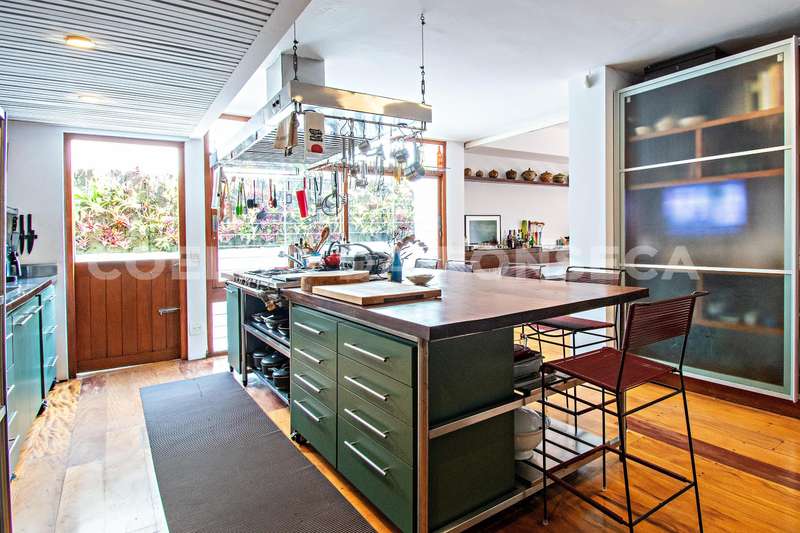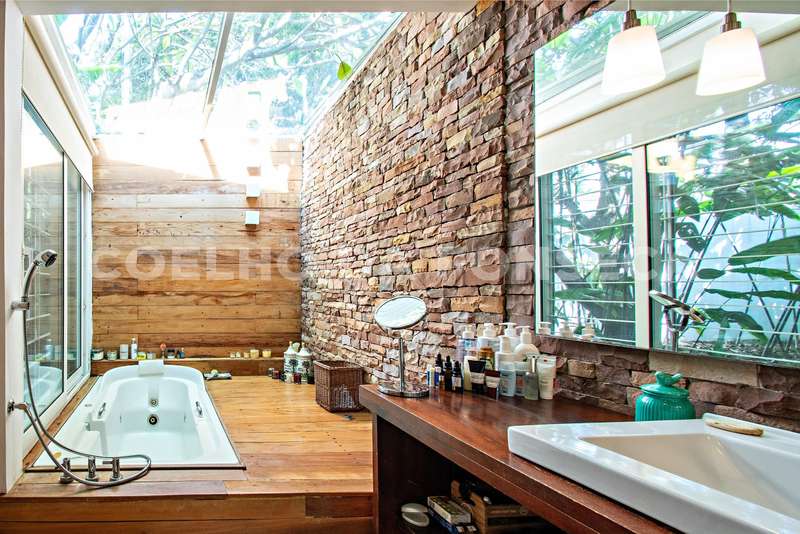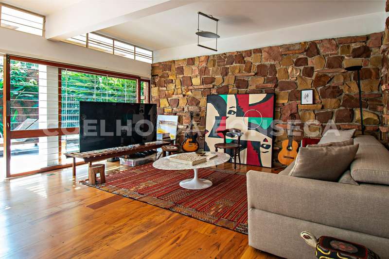 Casa térrea com projeto modernista assinada pelo arquiteto Paulo Henrique Cardoso que valorizou a utilização de materiais naturais, como pedras mineiras na sala e no banheiro da suíte. O piso da casa, bancadas e prateleiras são de madeira garimpada, peroba rosa no piso e prateleiras da cozinha, cajarana na grande mesa central da cozinha e bancadas dos banheiros.