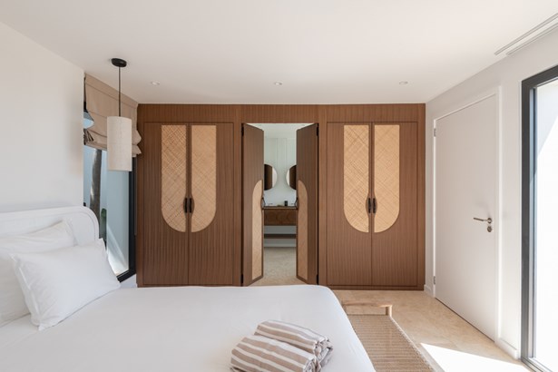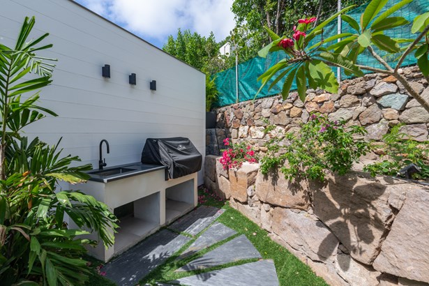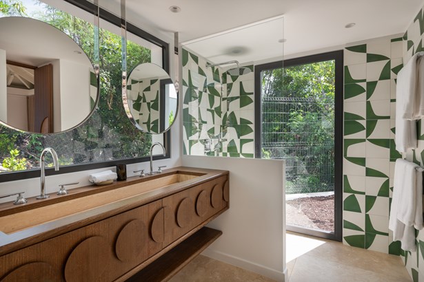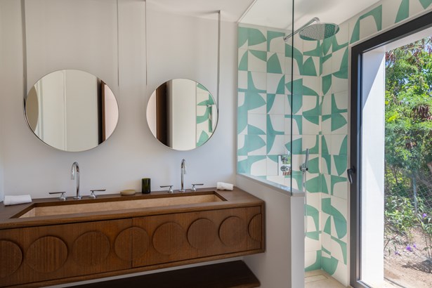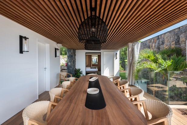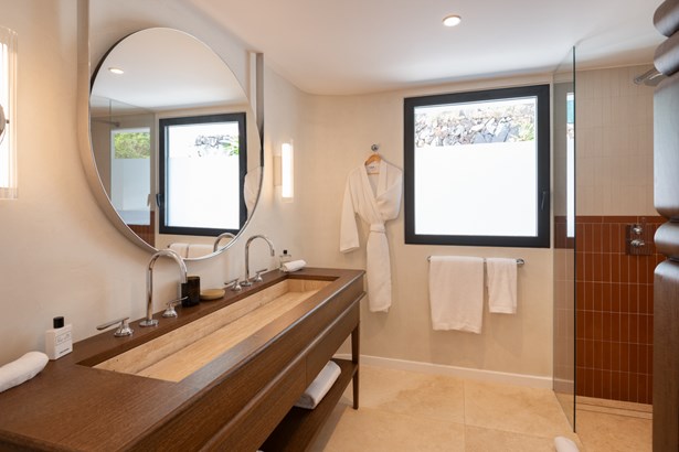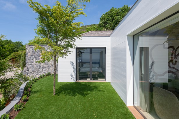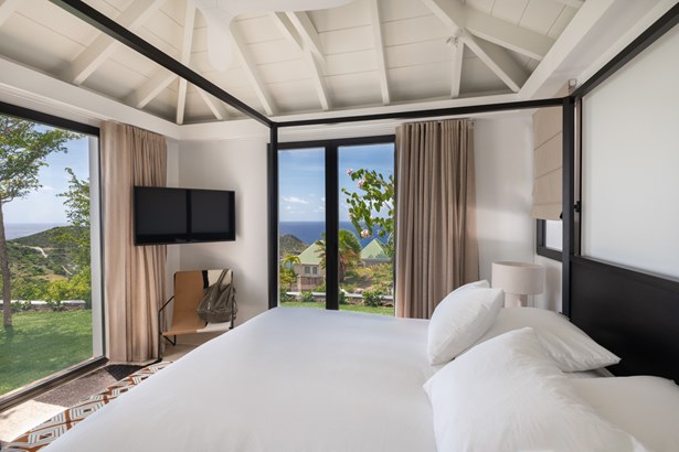 Villa Scarlett is a recently completed villa nestled in the heights of Vitet. It enjoys a tranquil setting with a double panoramic ocean view; On one side you can enjoy the unspoiled lagoon of Grand Cul-de-Sac and the sunrise over Toiny beach on the other. Built on two levels, this magnificent villa perfectly combines comfort and style, with a contemporary design that enhances every space. The entrance opens onto an open-plan living room with a bright lounge and fully-equipped kitchen. The minimalist decor creates a warm yet sophisticated ambience, while the elegant curves adorning the walls add an artistic dimension. The room flows naturally outwards onto a large terrace, where the heated infinity pool and deckchairs make the most of the idyllic setting. A shaded dining area provides a convivial space to enjoy every meal while taking in the exceptional panoramic views. The sleeping area comprises four independent bedrooms, each with its own en-suite bathroom. One of these is connected to the living room, and two others can be accessed via the terrace. The fourth can be found on the lower floor and benefits from a private outdoor space surrounded by tropical vegetation. A covered garage for two vehicles completes this luxurious ensemble.