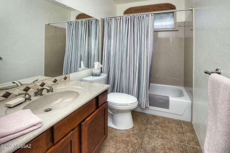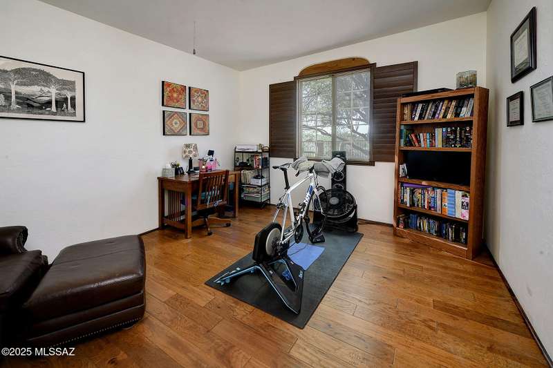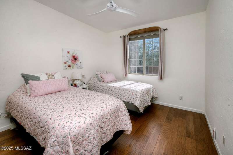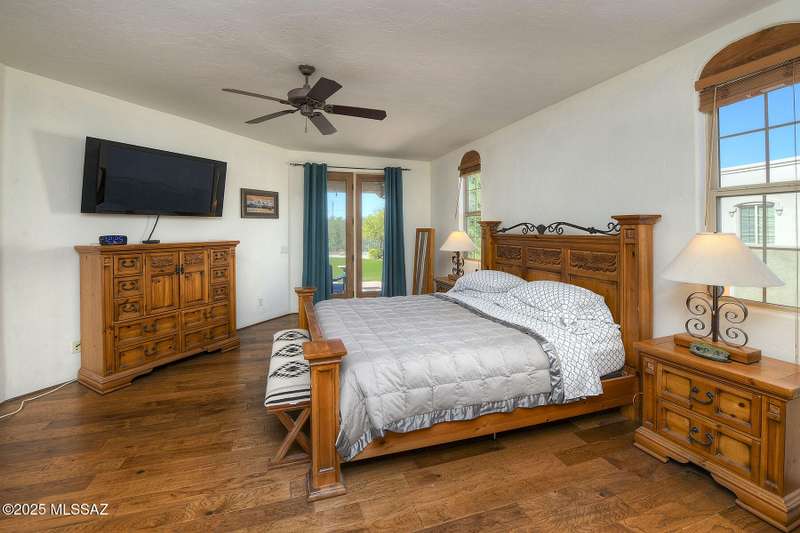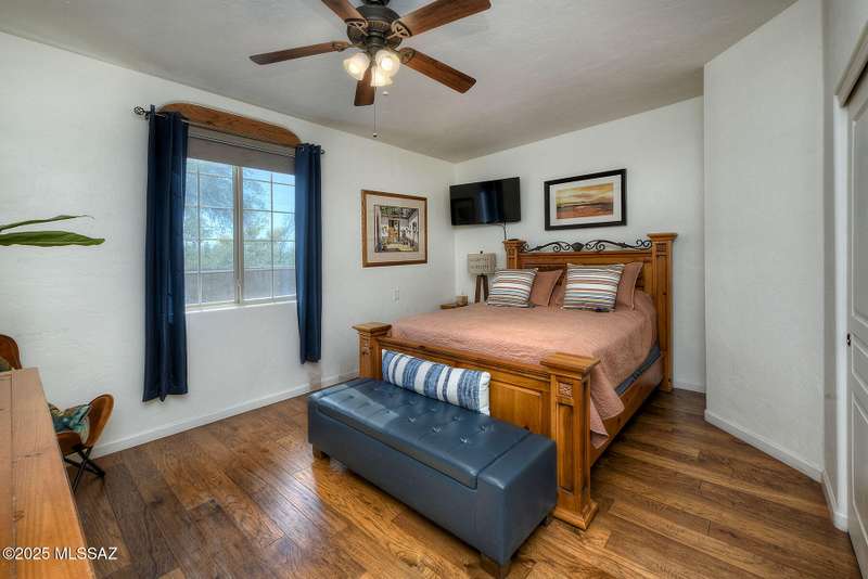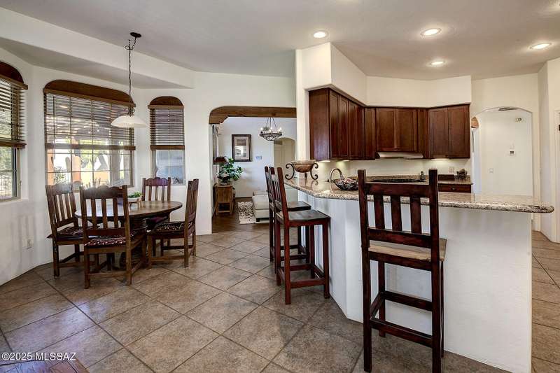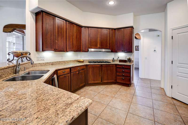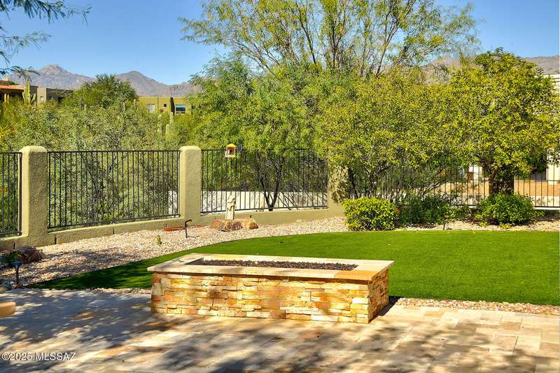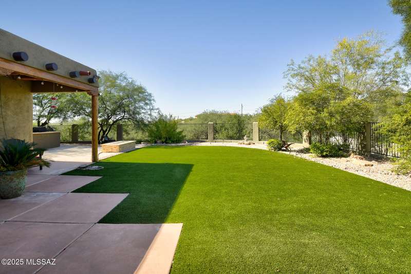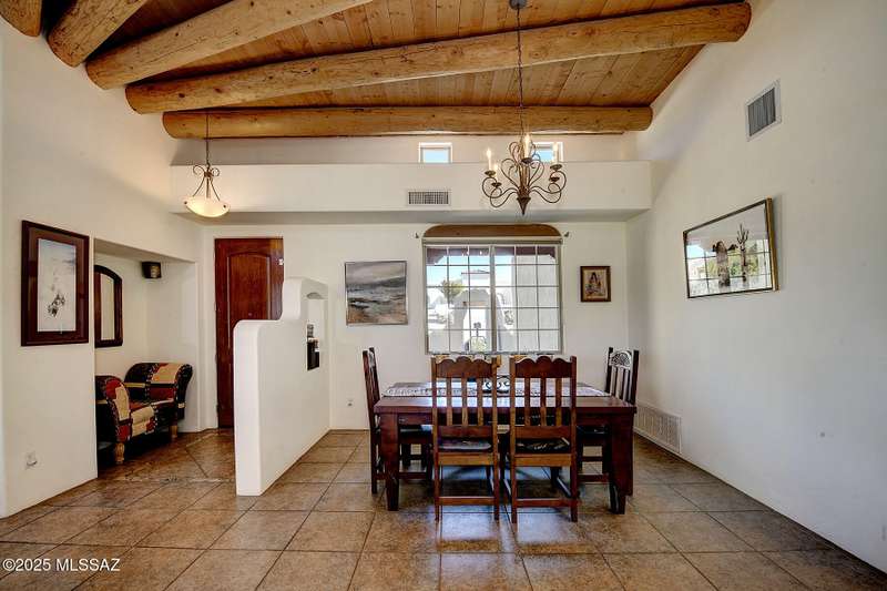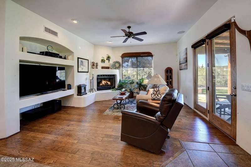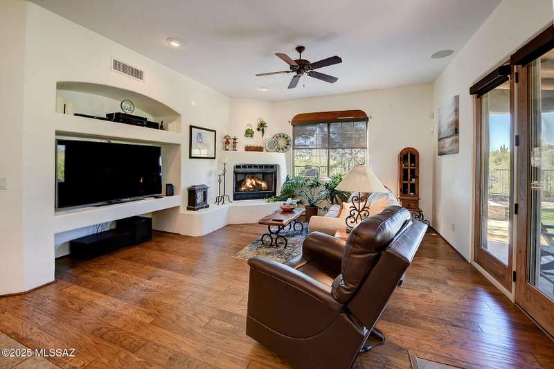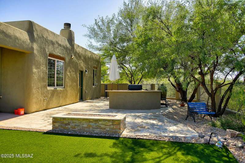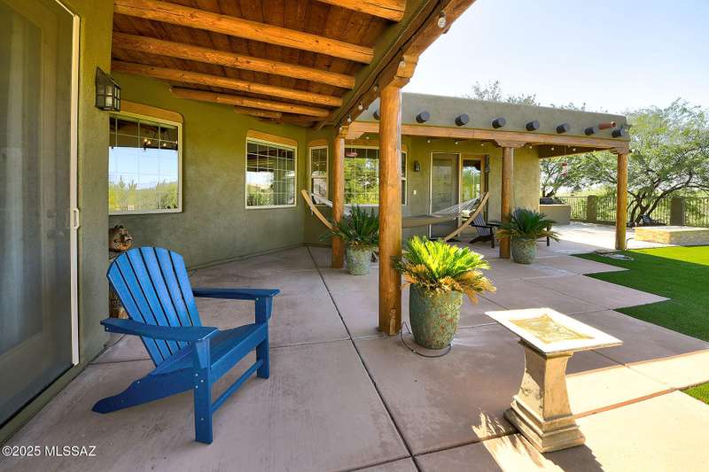Stunning home featuring a warm wood plank ceiling with exposed beams in the living room, elegant ceramic tile and engineered wood floors, and a cozy gas fireplace. The gourmet kitchen boasts a five-burner gas range, stainless steel appliances, and granite countertops. The primary suite offers a spa-like bath with dual vanity, soaking tub, and walk-in shower. Owned solar system to keep utility costs low. Enjoy outdoor living on the covered back porch with artificial turf, a built-in gas BBQ, and firepit--perfect for entertaining or relaxing while taking in beautiful sunset views.