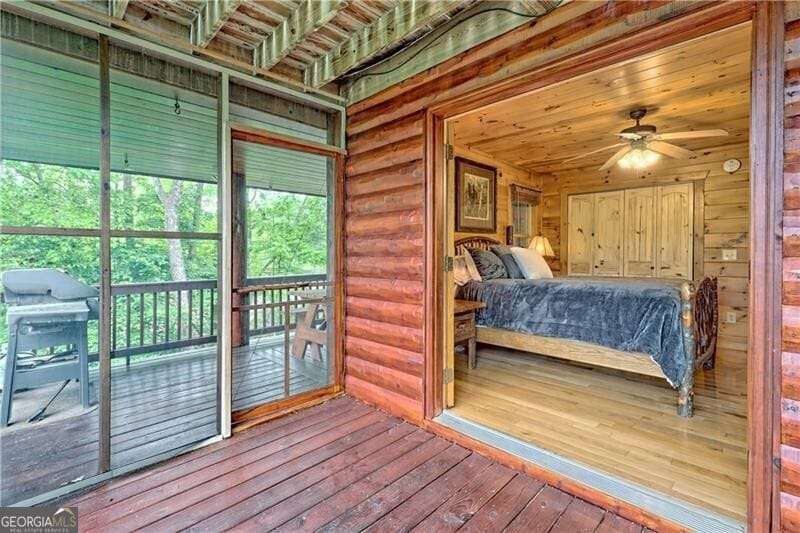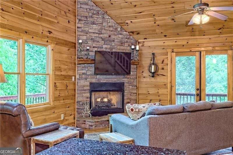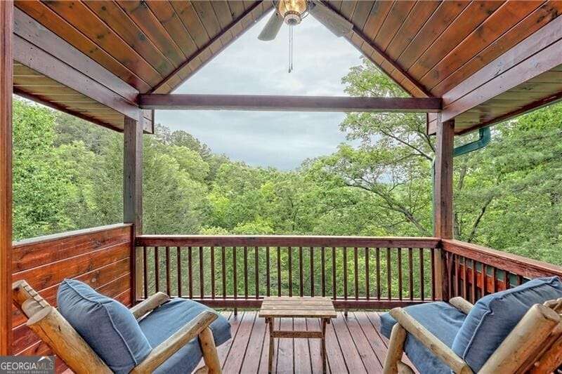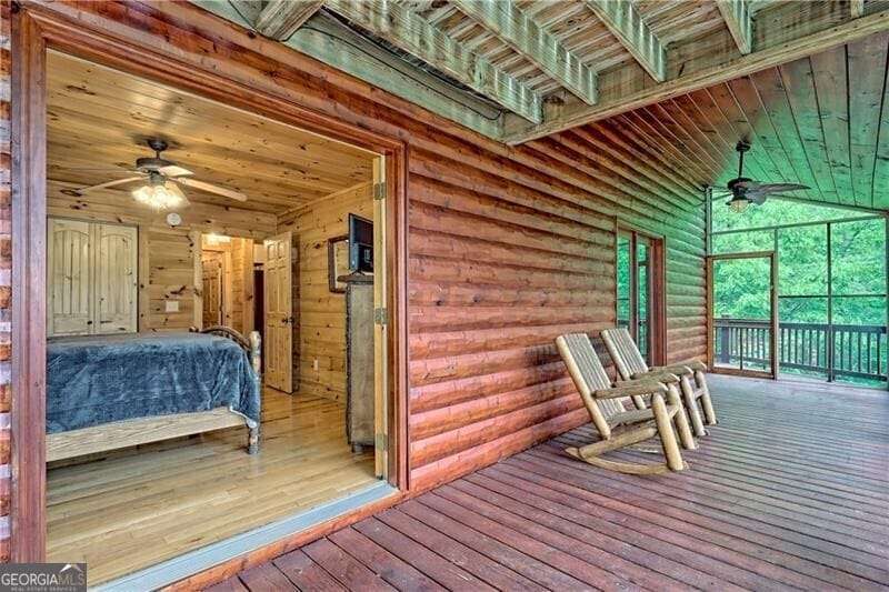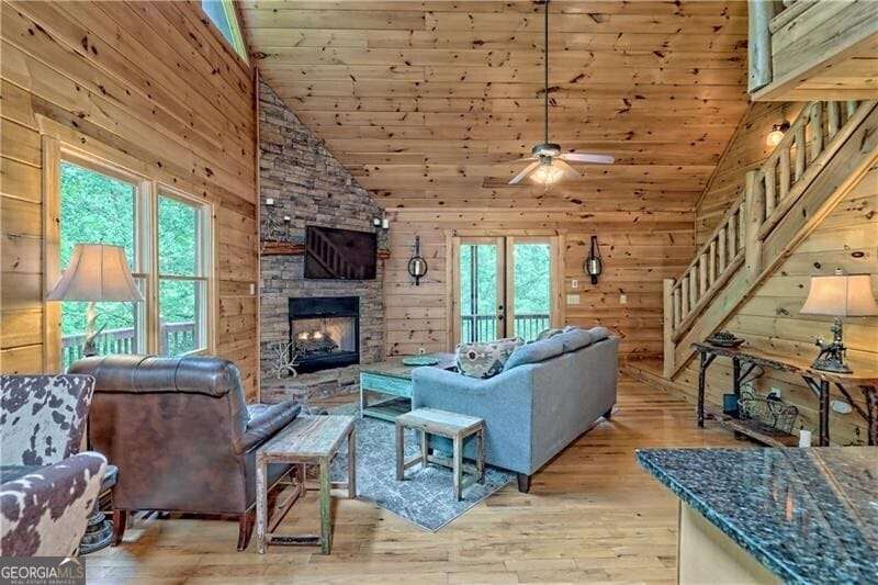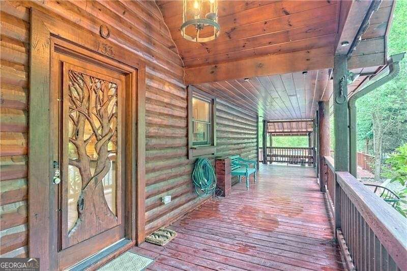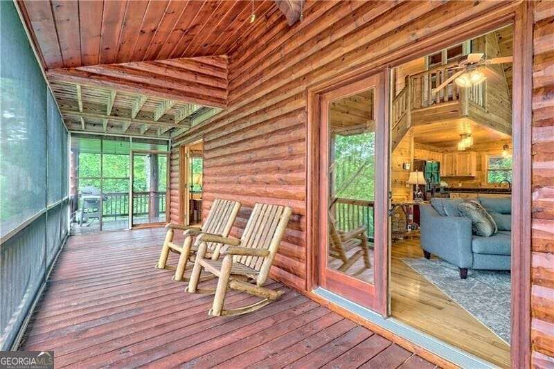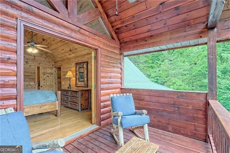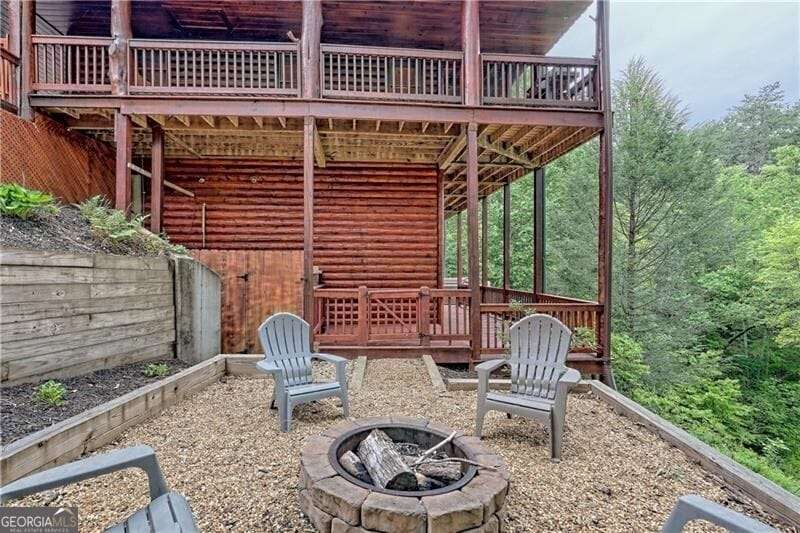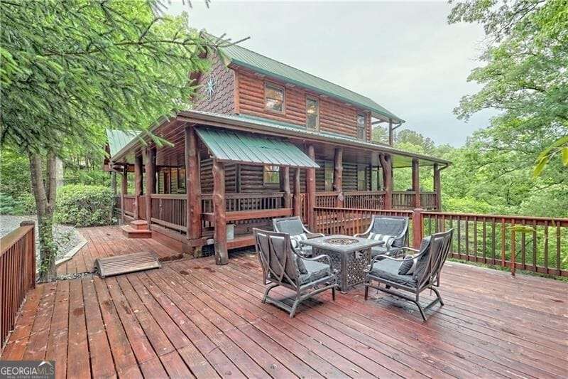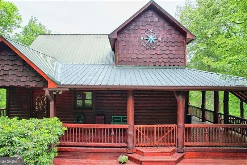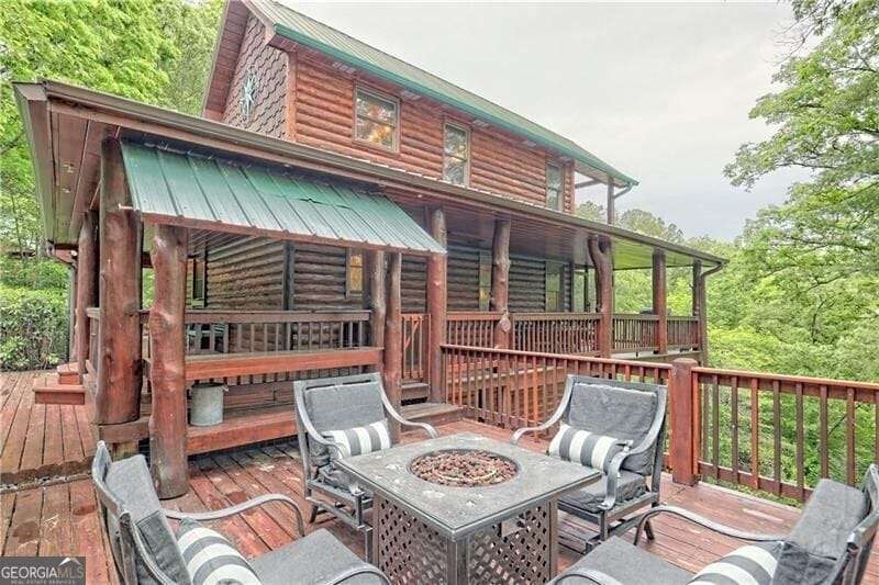 Nestled within a gated community just TWO MILES from downtown Blue Ridge, this well maintained log cabin is the perfect mountain retreat. The front entrance radiates curb appeal with landscaping, a metal roof and wrap around porches that provide ample space for outdoor living and entertainment. Multi-level decks are great for enjoying nature, including a private Owners Suite top porch. The terrace level deck has a hot tub with a dedicated hot water line for quick reheating between rentals. Additionally, there are two uncovered patio areas, one with a fire pit for cozy evenings under the stars. Inside, the open floor plan with cathedral ceilings and expansive windows seamlessly merges the indoors with the outdoors. The lower level, boasts a bunk bedroom and separate living area allowing additional space for guests to unwind. This turnkey property is being sold fully furnished.