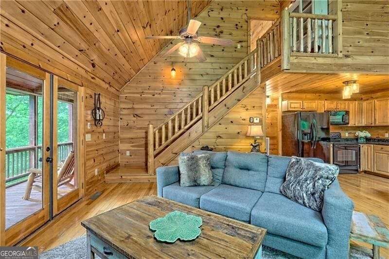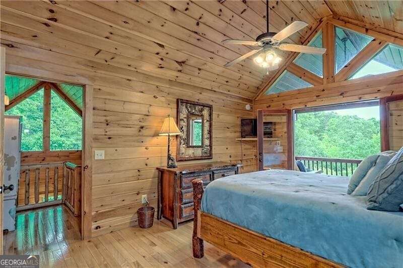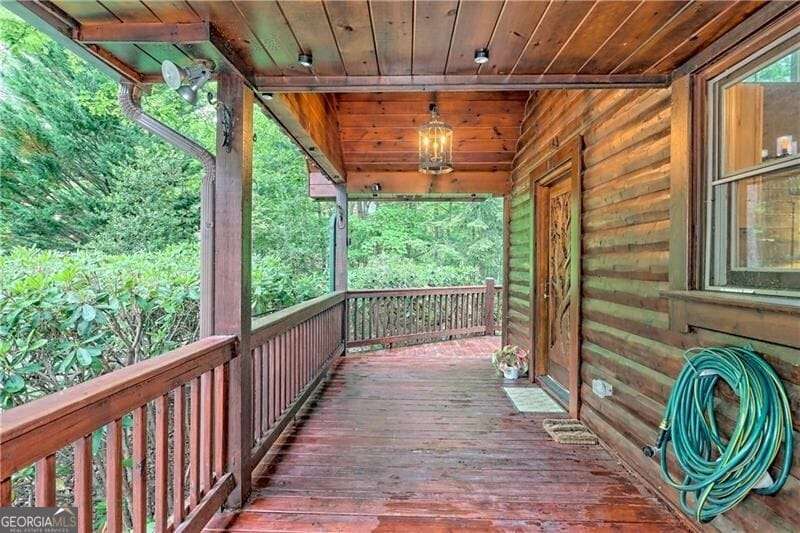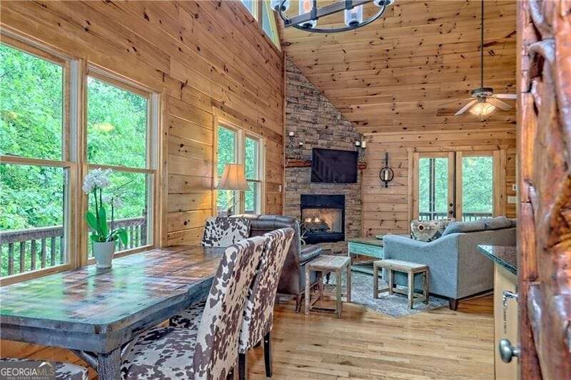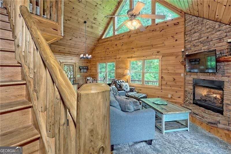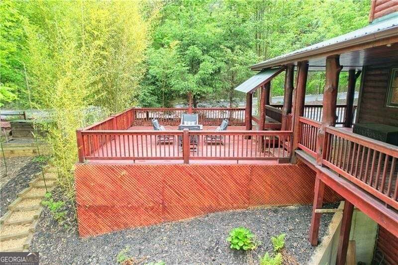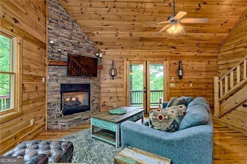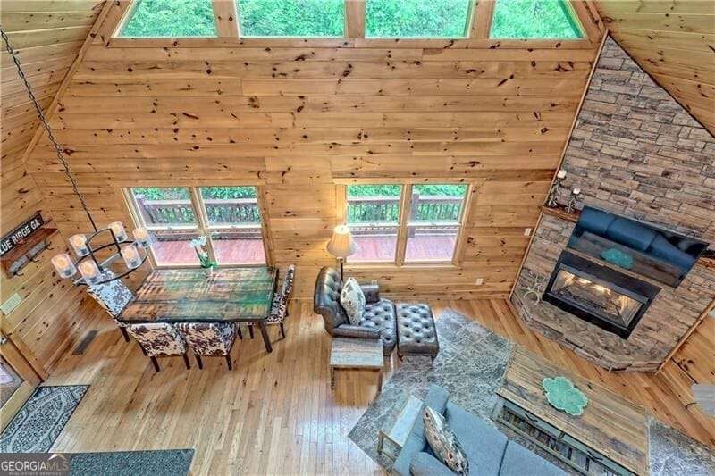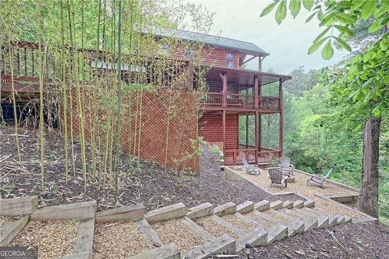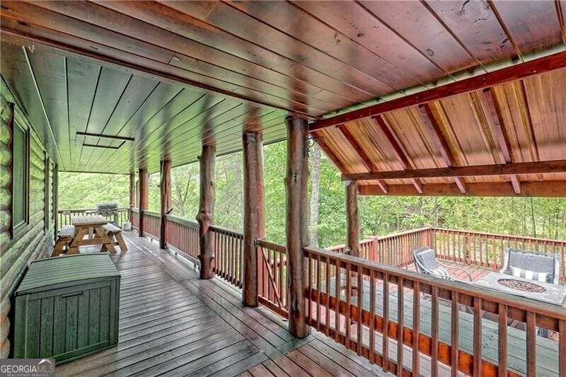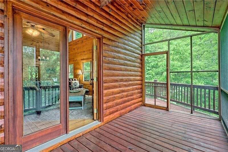 Nestled within a gated community just TWO MILES from downtown Blue Ridge, this well maintained log cabin is the perfect mountain retreat. The front entrance radiates curb appeal with landscaping, a metal roof and wrap around porches that provide ample space for outdoor living and entertainment. Multi-level decks are great for enjoying nature, including a private Owners Suite top porch. The terrace level deck has a hot tub with a dedicated hot water line for quick reheating between rentals. Additionally, there are two uncovered patio areas, one with a fire pit for cozy evenings under the stars. Inside, the open floor plan with cathedral ceilings and expansive windows seamlessly merges the indoors with the outdoors. The lower level, boasts a bunk bedroom and separate living area allowing additional space for guests to unwind. This turnkey property is being sold fully furnished.