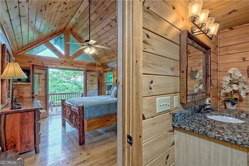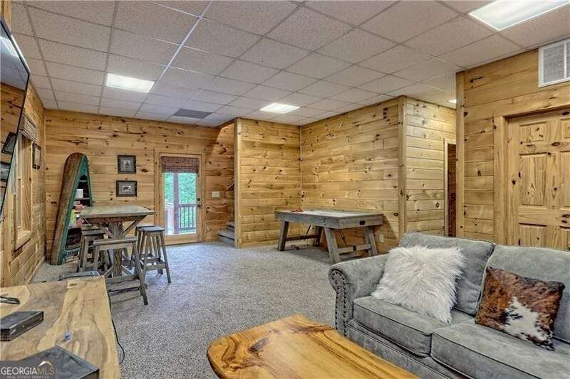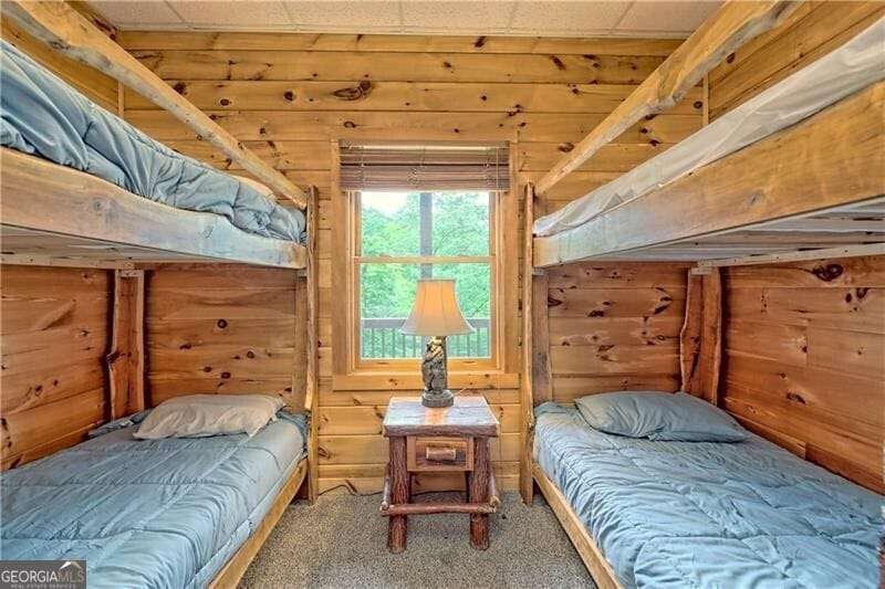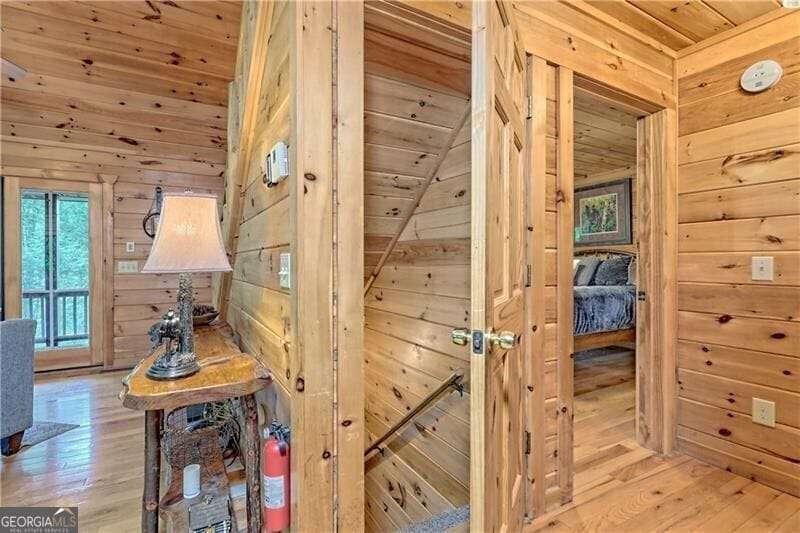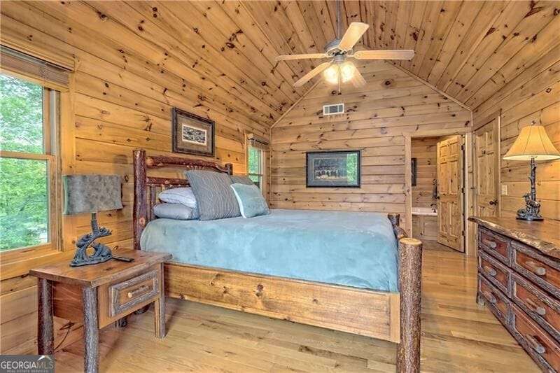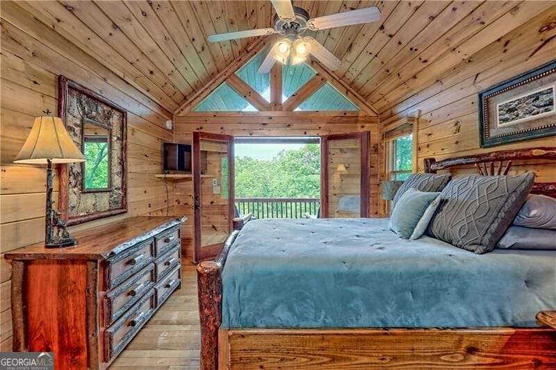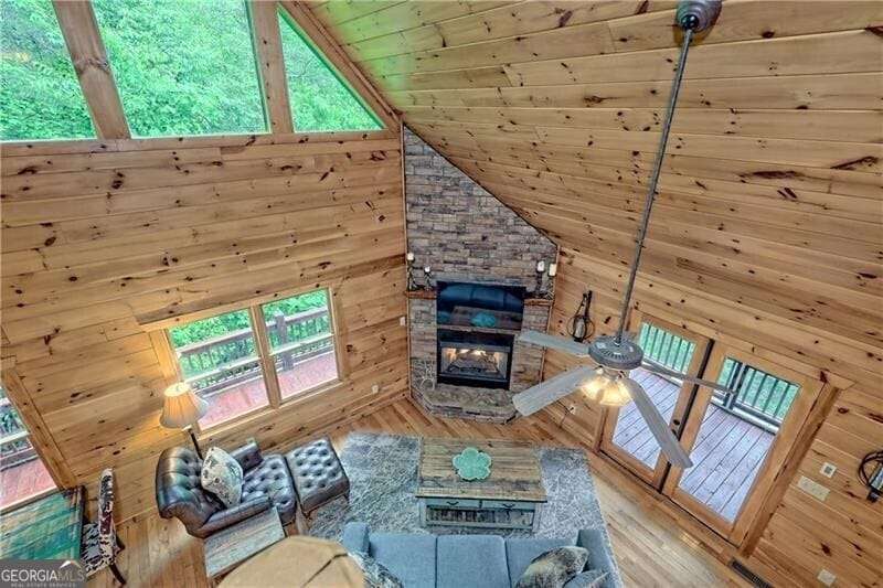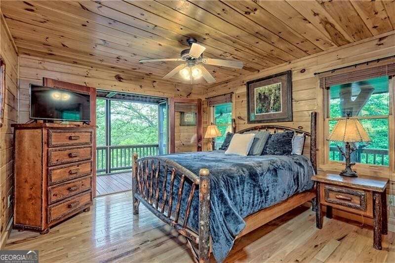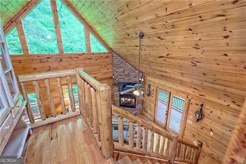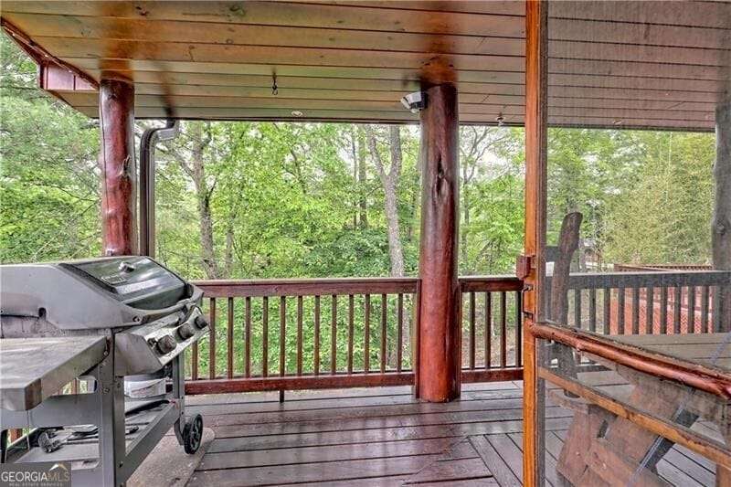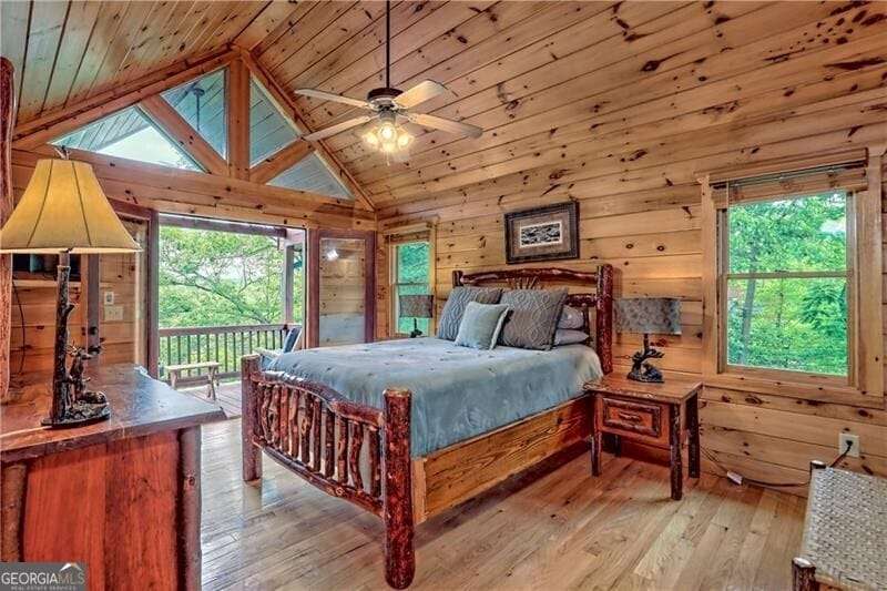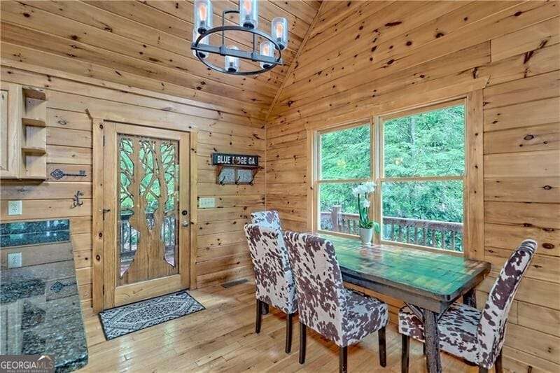 Nestled within a gated community just TWO MILES from downtown Blue Ridge, this well maintained log cabin is the perfect mountain retreat. The front entrance radiates curb appeal with landscaping, a metal roof and wrap around porches that provide ample space for outdoor living and entertainment. Multi-level decks are great for enjoying nature, including a private Owners Suite top porch. The terrace level deck has a hot tub with a dedicated hot water line for quick reheating between rentals. Additionally, there are two uncovered patio areas, one with a fire pit for cozy evenings under the stars. Inside, the open floor plan with cathedral ceilings and expansive windows seamlessly merges the indoors with the outdoors. The lower level, boasts a bunk bedroom and separate living area allowing additional space for guests to unwind. This turnkey property is being sold fully furnished.