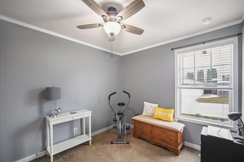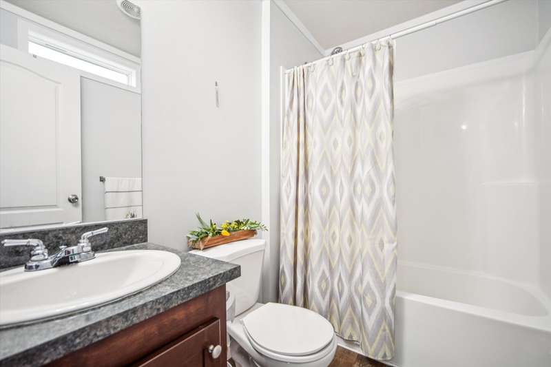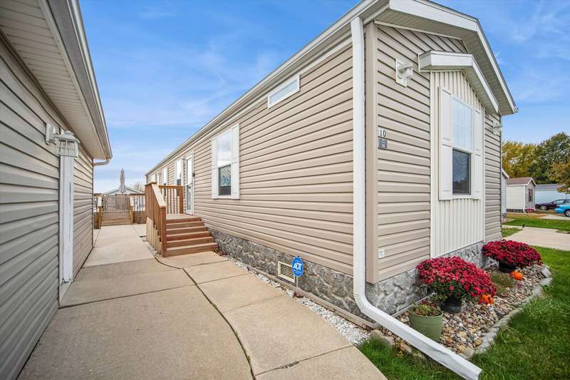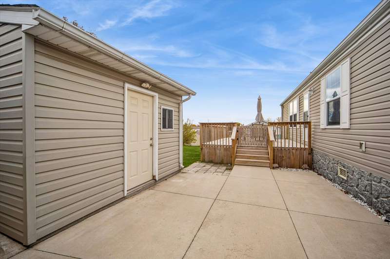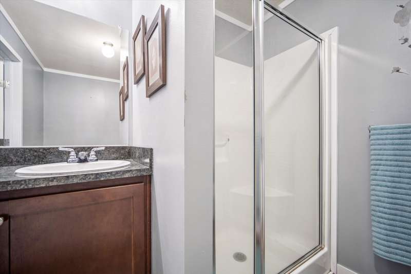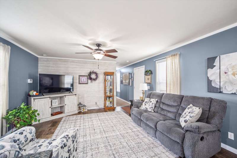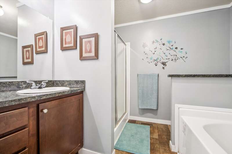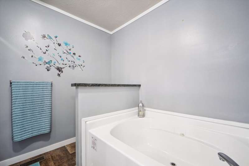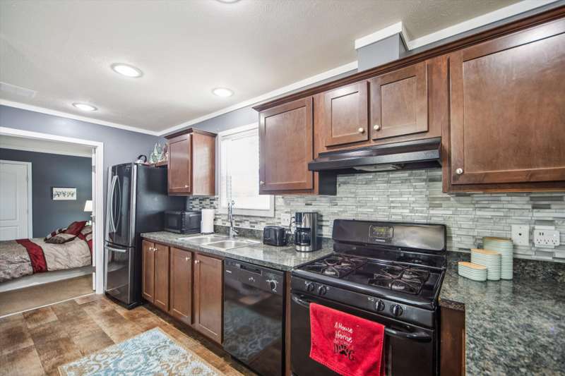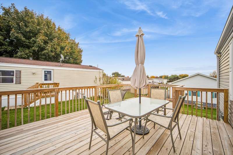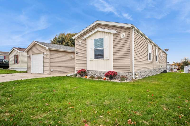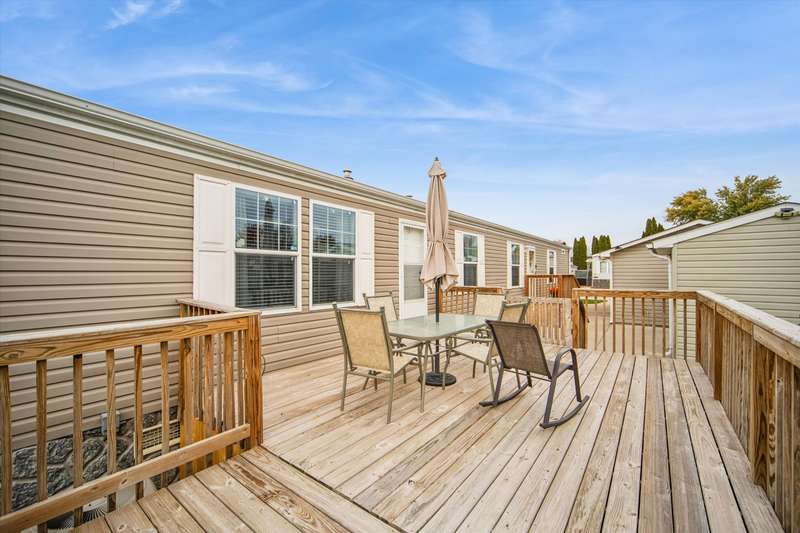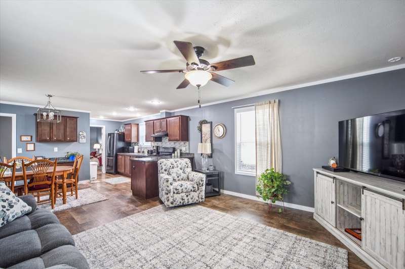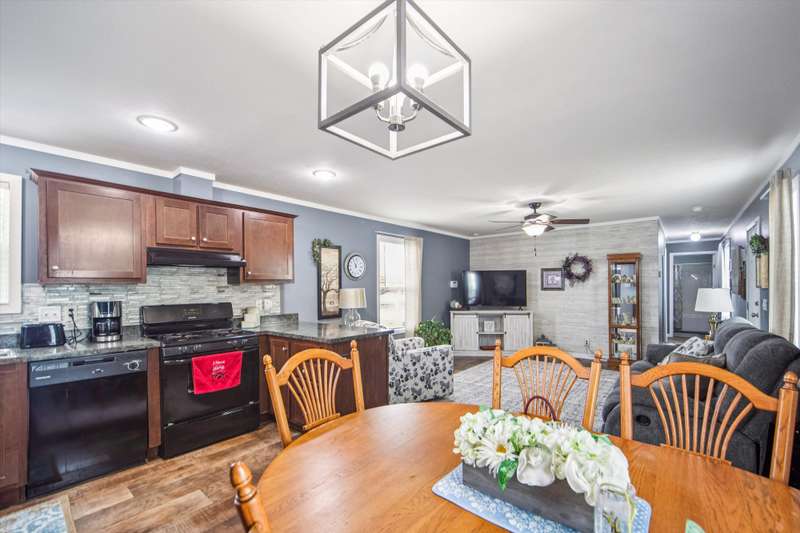 Welcome to this modern mobile home with an open layout. Living room, kitchen, and dining area all open. The kitchen features dark cabinets, a breakfast bar, and a spacious walk-in pantry. The large primary suite accommodates a king bed and includes an en-suite bathroom with a soaking tub and walk-in shower. Beautiful LVP flooring and cozy carpeting in the 2 family bedrooms. Outside you will find a large back deck for entertaining or just relaxing and grilling. Oversized 1 car garage and storage sheds for extra garden and lawn equipment. Schedule your viewing today!