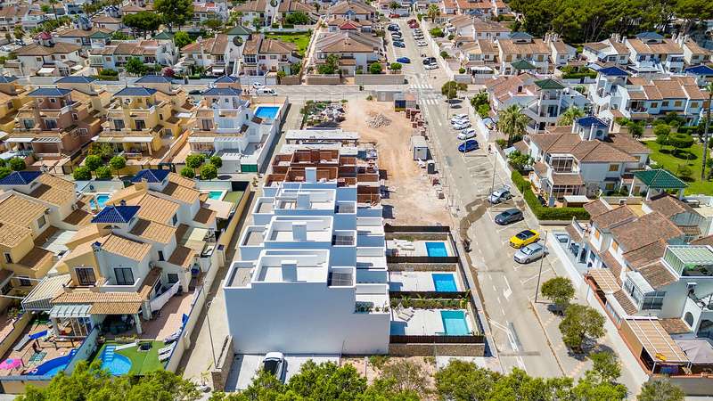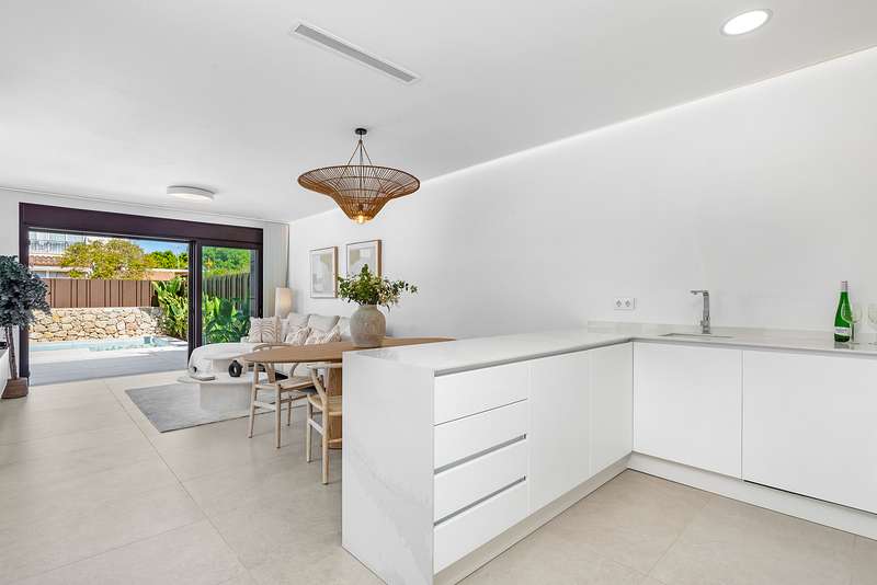The excellent location of the villas for sale in Mil Palmeras Spain is just 900 m away from the beautiful Mil Palmeras beach. Additionally, they are a 5-minute drive from Torre de la Horadada, which offers various amenities such as bars, restaurants, and supermarkets. The city center of Pilar de la Horadada is only a 7-minute drive away, and the renowned Dos Mares shopping center can be reached within 10 minutes. Furthermore, the port of San Pedro, which is home to several luxury cruises, is just a 12-minute drive away. Moreover, both Alicante and Murcia's international airports can be reached within an hour's drive.