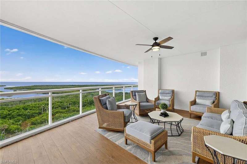 Welcome to Unit 1503 in Tower 100 in the award-winning and truly exceptional resort-style community of Kalea Bay. Ascend the elevator directly into your 15th floor sanctuary in almost 3300 square feet of casually elegant living space. This 4 Bedroom/4 Bathroom residence has been thoughtfully designed and furnished by premier local designer, Design West. Just bring your toothbrush, this unit comes Turnkey!! Open-concept living space features gorgeous wide-plank light oak flooring complemented by distressed wood coffered ceiling in the spacious living room with white brick decorative fireplace. Wall of glass opens out to a gorgeous outdoor terrace with panoramic views of Wiggins Pass and the Gulf. A true chef's eat-in kitchen replete with Sub-Zero/Wolf appliances, white shaker cabinetry, oversized quartz island flanked by waterfall edges and a convenient butler's pantry ideal foyer entertaining. Master Suite oasis with spacious bedroom with breathtaking western facing waterfront views, spa-like bathroom featuring oversized walk-in shower, separate vanities, separate water closet and enormous walk-in closet with custom built-ins. Split floor plan with 3 additional suites on the opposite end of the residence for utmost privacy. Kalea Bay is a 5-star, award winning community featuring 24 hour guard gated entry, a breathtaking 24th floor rooftop deck featuring gorgeous infinity pool, 4 built-in grills, open-air gym and club room with panoramic western views of the Gulf for the utmost in luxurious resort-style living. Kalea Bay Club is rich in amenities including multiple pools, wellness center, tennis and pickleball courts, 2 restaurants, 8 guest cottages and beach shuttle. Truly exceptional living at its finest.