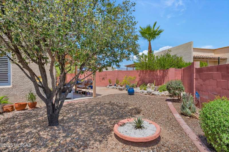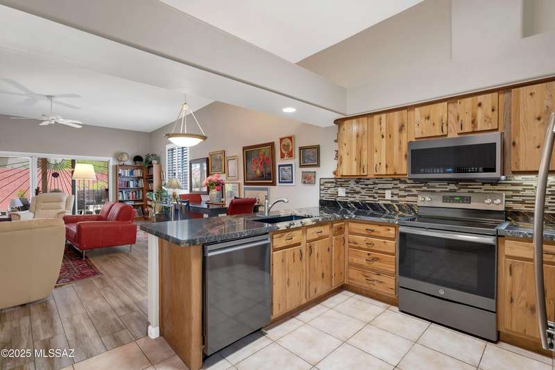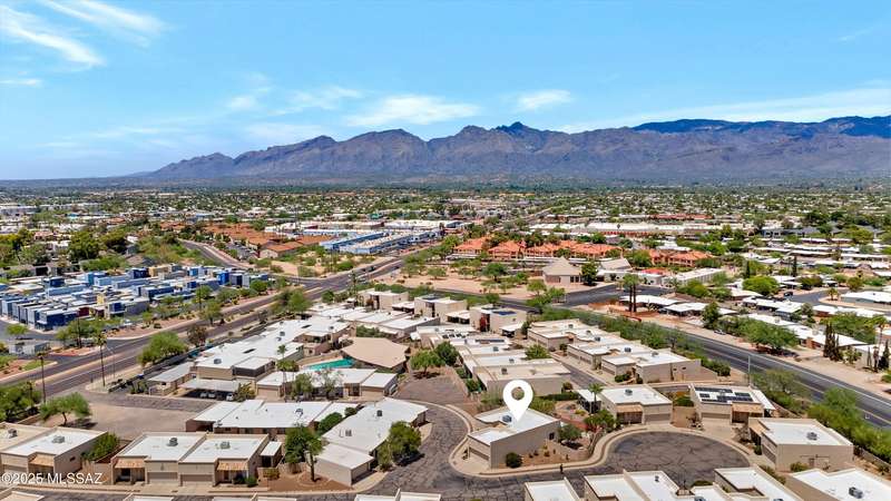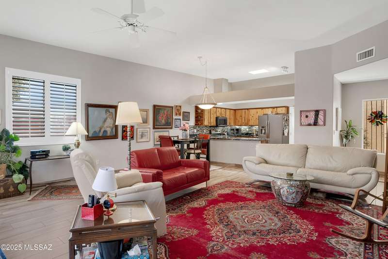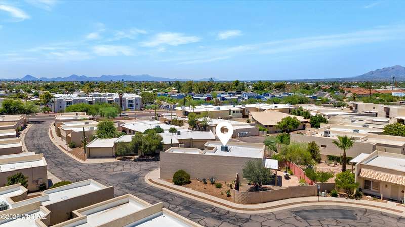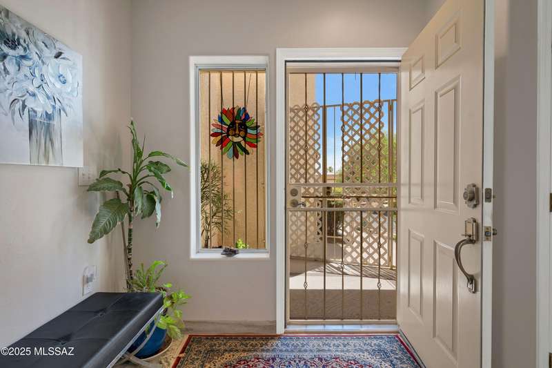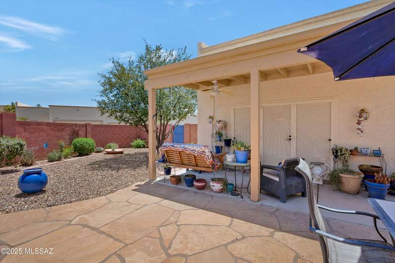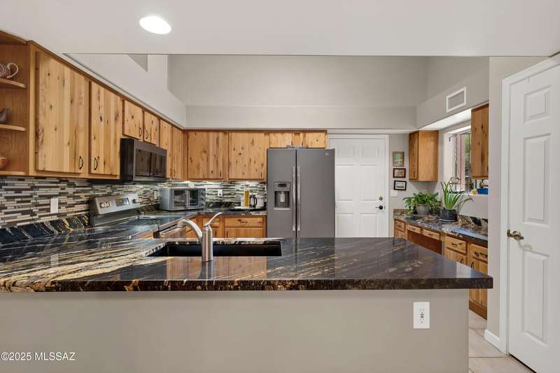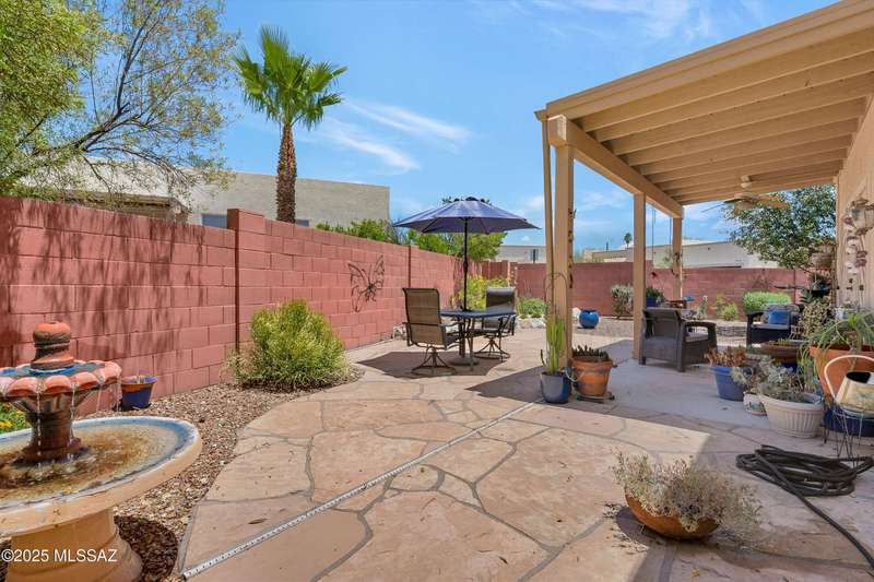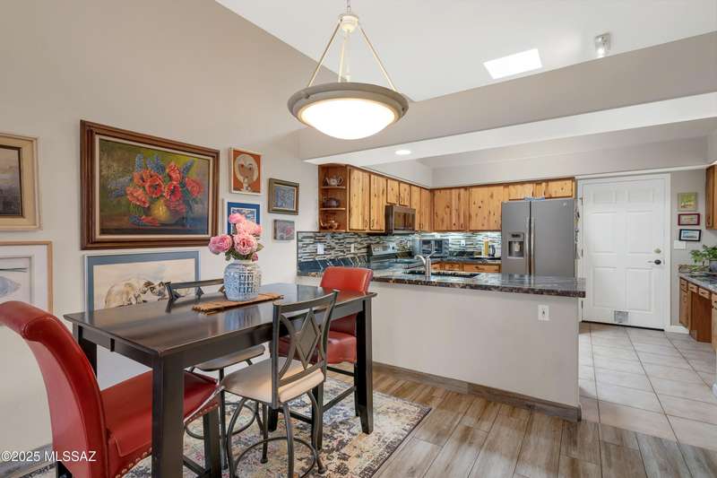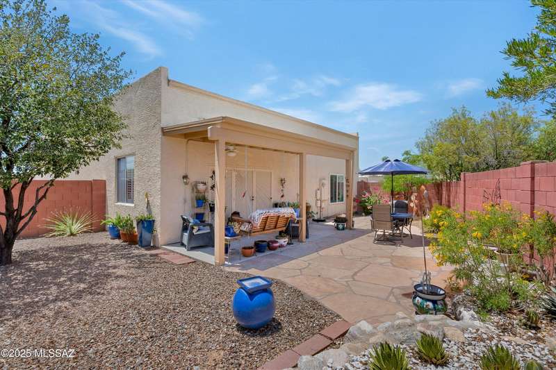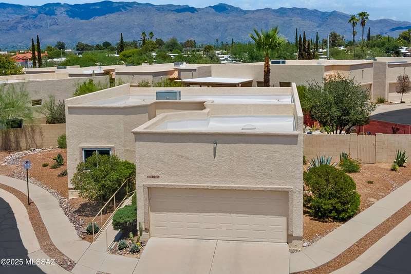 FREESTANDING TOWNHOUSE, end-of-cul-de-sac lot. No attached neighbors! Bright, open great room, split bedroom floor plan with 12' ceilings. Kitchen updated with striking contemporary finishes: chocolate bordeaux granite countertops, slate appliances, under-cabinet lighting, knotty oak cabinets w/pull out shelving. Perfectly wonderful covered flagstone patio with bubbling fountain, mature vegetation, scenic views, peek of Rincon Mtns. Primary suite with a generous walk-in closet. Updated baths. Skylights, plantation shutters, neutral finishes, tile throughout, except bedrooms. Custom security doors. New washer/dryer, newer Heat pump, roof recoated 2025. 2 car garage. Lot is 300 sq ft larger than all others in