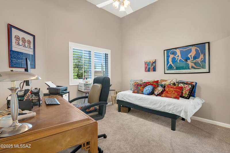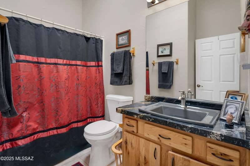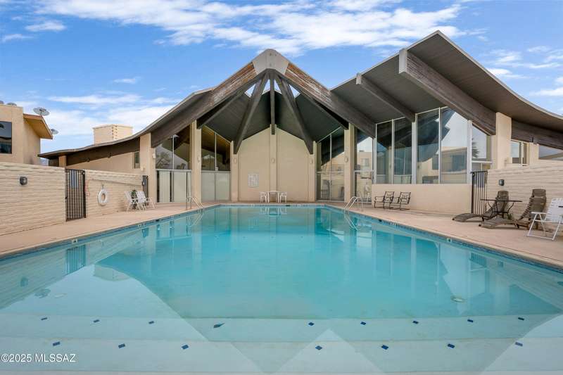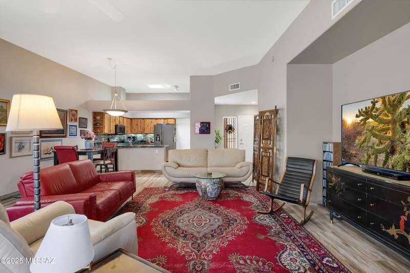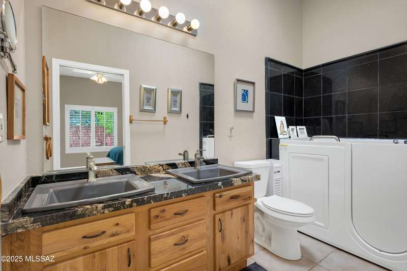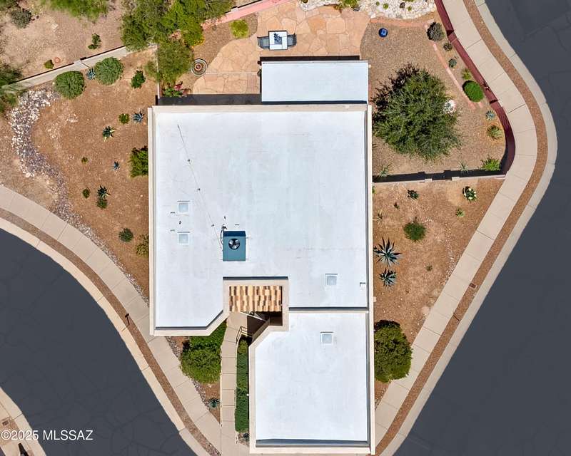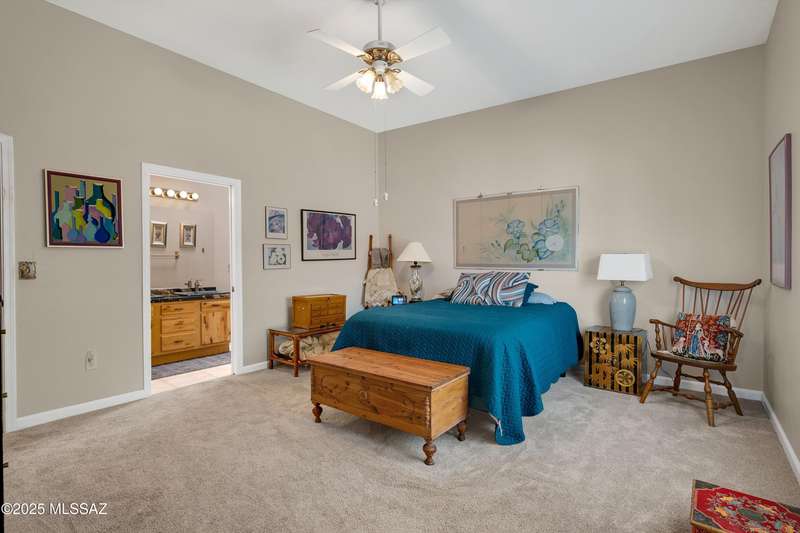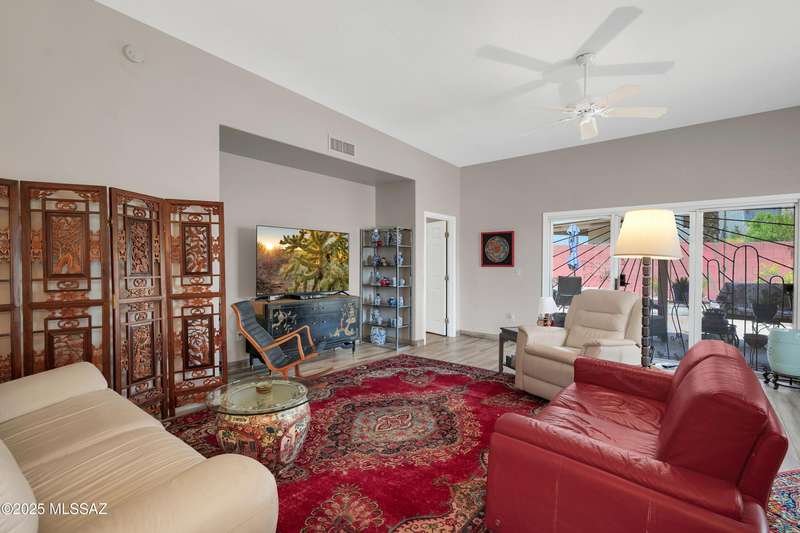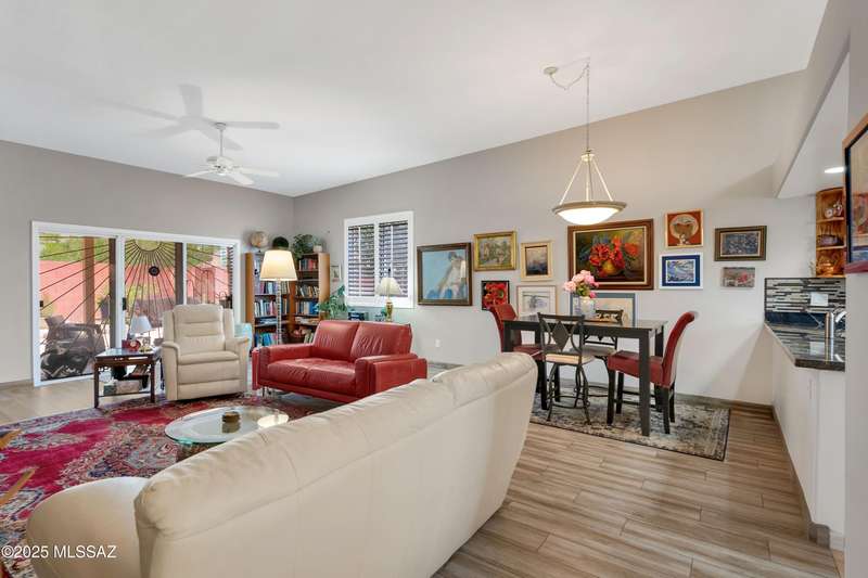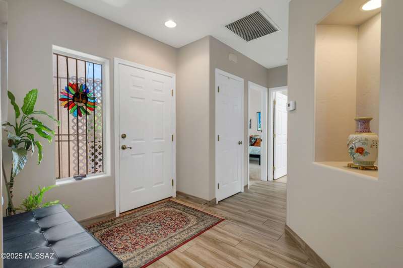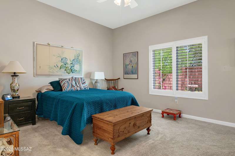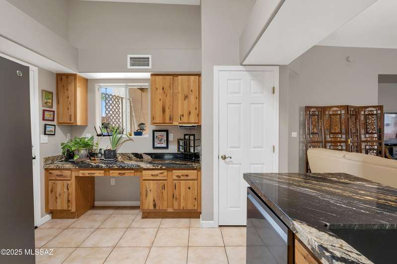 FREESTANDING TOWNHOUSE, end-of-cul-de-sac lot. No attached neighbors! Bright, open great room, split bedroom floor plan with 12' ceilings. Kitchen updated with striking contemporary finishes: chocolate bordeaux granite countertops, slate appliances, under-cabinet lighting, knotty oak cabinets w/pull out shelving. Perfectly wonderful covered flagstone patio with bubbling fountain, mature vegetation, scenic views, peek of Rincon Mtns. Primary suite with a generous walk-in closet. Updated baths. Skylights, plantation shutters, neutral finishes, tile throughout, except bedrooms. Custom security doors. New washer/dryer, newer Heat pump, roof recoated 2025. 2 car garage. Lot is 300 sq ft larger than all others in