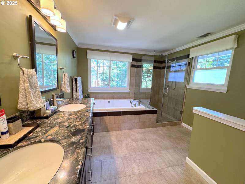 Discover this beautifully updated 4-bedroom, 2.5-bathroom home offering 3,520 sq ft of comfortable living space in the desirable West Lake area. There is Bamboo flooring throughout the home. A spacious remodeled kitchen features sleek quartz countertops and gas appliances. A versatile 20'x15' bonus room on the main level can serve as a 5th bedroom, home office or den — tailored to your lifestyle. The primary suite has a 10'x10' walk-in closet and luxurious bathroom with a jetted tub, separate shower and double sinks. The inviting family room includes a wood fireplace. There are vaulted ceilings & bay windows fill the house with natural light. Upstairs you'll find a convenient utility room with washer and dryer included. Recent upgrades include a new A/C system and gas furnace for year-round comfort. Step outside to a fenced backyard that feels like your own private park, ideal for relaxing or entertaining. Great Lake Oswego Schools! Enjoy nearby walking trails, parks and all the charm the area has to offer.