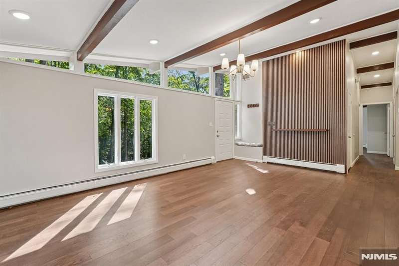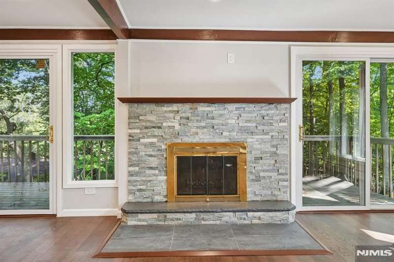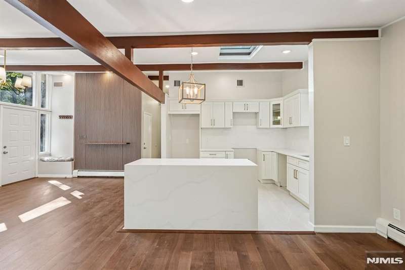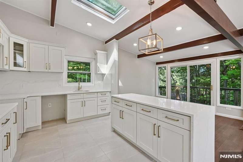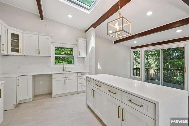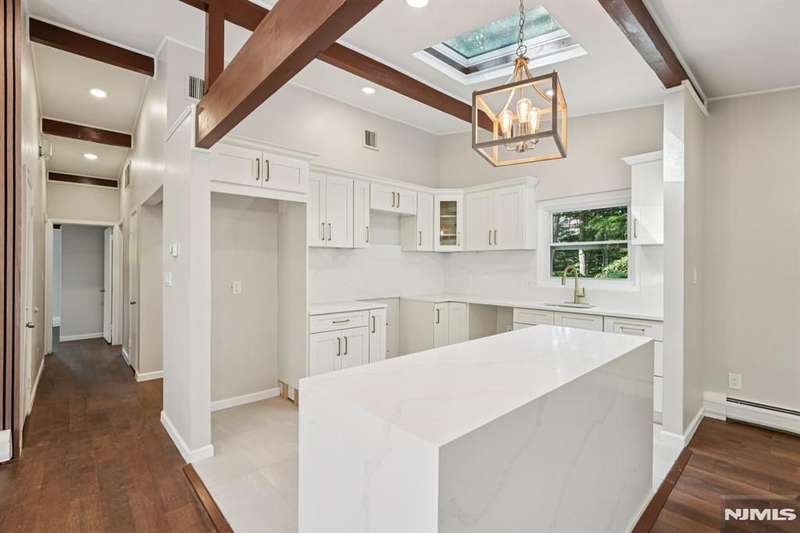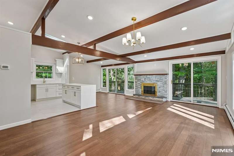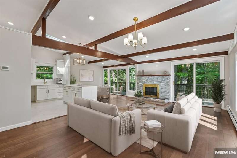 Welcome home to this beautifully renovated 4 bedroom, 3 bathroom Raised Ranch, perfectly nestled on a private wooded lot in the heart of Wayne. Step into the inviting entry foyer that opens to a bright, open-concept main living area. The living room boasts large windows, exposed wood beams, and a charming wood-burning fireplace, creating a warm and welcoming space for conversation and relaxation. Seamlessly flowing into the dining room, you'll find an elegant setting for intimate meals or lively gatherings, with sliding glass doors leading to a spacious rear deck ideal for outdoor entertaining, al fresco dining, and taking in stunning wooded views. The chef's kitchen is a showstopper, featuring custom cabinetry, marble countertops, wood beams, center island and a skylight that bathes the space in natural light. The first floor also offers a serene primary suite with ample closet space and a private bath, plus and 2 additional bedrooms and full bath. Downstairs, enjoy a versatile living area with a den, fourth bedroom, kitchenette, full bath, garage entrance, and walkout to the backyard. Gorgeous hardwood floors and rustic beams run throughout. The expansive yard provides endless opportunities for outdoor activities in a peaceful, natural setting. With a 2-car garage, ample parking, and a location close to NYC transportation, shopping, and dining, this home offers the perfect blend of modern comfort and tranquil retreat living.