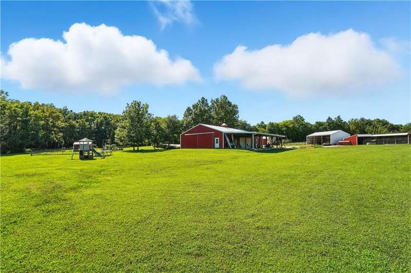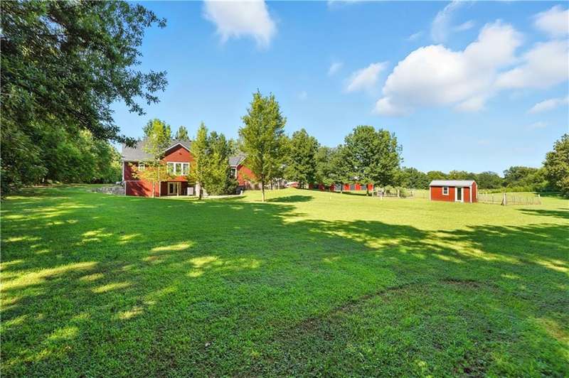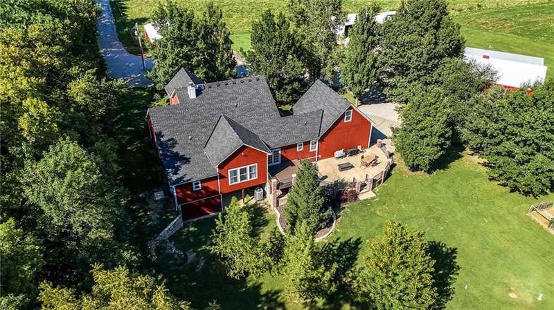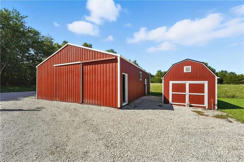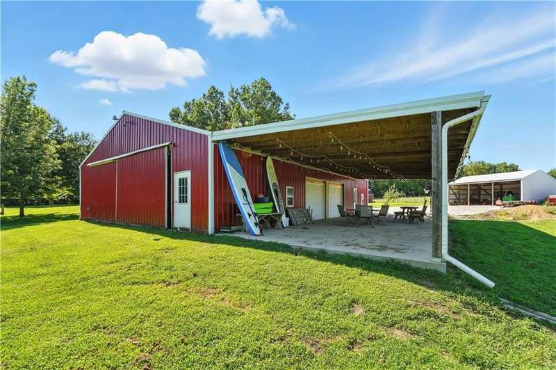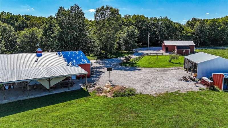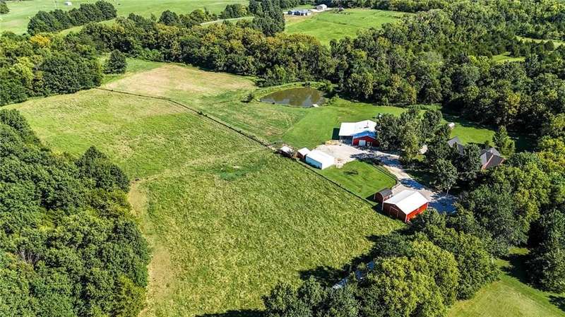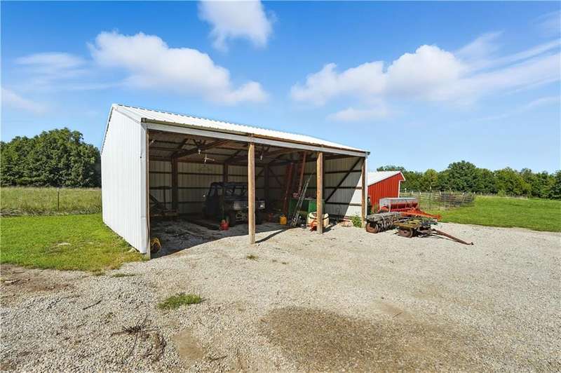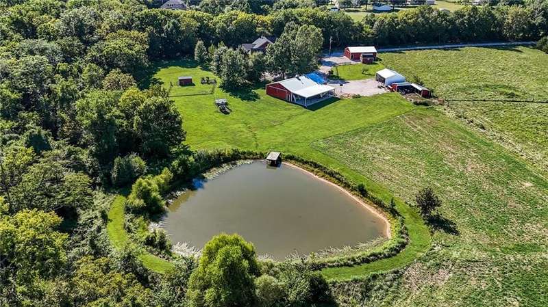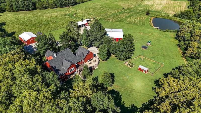 Country living at its finest! Welcome to this stunning 4 bedroom (plus two additional non-conforming), 3.1 bath, 1.5 Story farmhouse on 18 beautiful acres in Harrisonville, MO! Perfectly positioned on blacktop and just minutes from town, this 2007 built home blends modern convenience with timeless country charm. Inside, youll find an updated kitchen with two walk-in pantries, stainless steel appliances, and eating area with a wet bar. The main level features a laundry room, formal dining/living room, and a beautiful family room with vaulted ceilings and fireplace. The primary suite offers his-and-hers walk-in closets, whirlpool tub, and double vanity in the bathroom. Multiple hobby rooms, generous storage spaces, and a dedicated media room provide endless possibilities. The walk-out basement features a non-conformiing bedroom, full bathroom, and second kitchen, ideal for entertaining or multi-generational living. Recent updates include a 2 year-old roof with upgraded shingles and a serviced HVAC system for peace of mind. Outdoors, the property is equally impressive! Relax on the covered front porch or the spacious back deck and large patio, both perfect for taking in the fresh country air. A dock extends into the stocked pond, ready for fishing or quiet evenings by the water. The land offers a perfect mix of 10 acres of fenced pasture and 8 acres of wooded conservation, with abundant wildlife for hunting, plus space for gardening or livestock. The property also includes 6 versatile outbuildings (electric to 4), including: 140x60 building with concrete floors, electric, bathroom and 10x60 overhang. 130x40 building with concrete and electric. 30x24 lean-to with electric. Garden shed. 12x6 shed with electric. 2 livestock lean-tos. Whether you dream of raising animals, working on projects, or simply enjoying the peace and privacy of nature, this one of a kind homestead truly checks all the boxes!