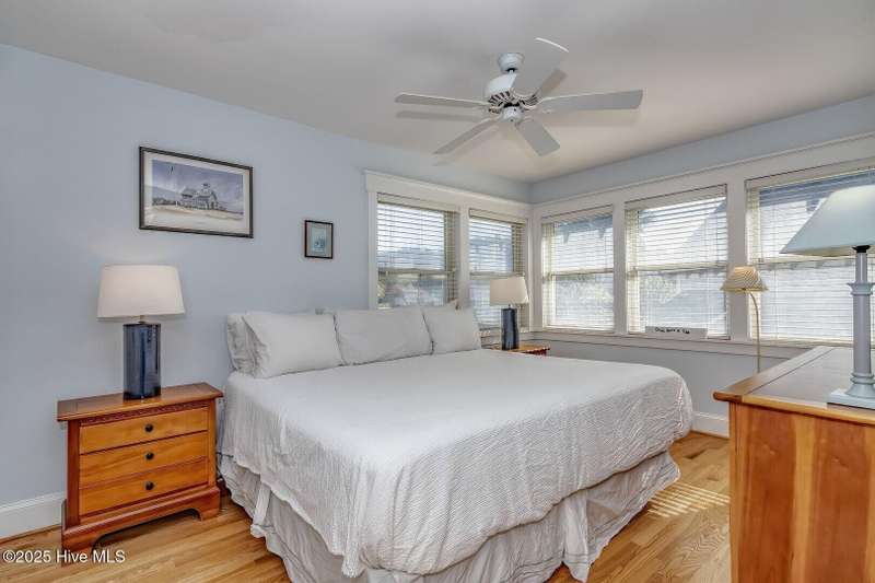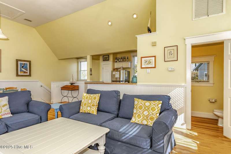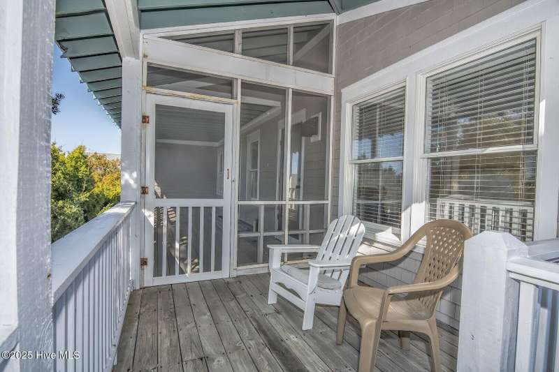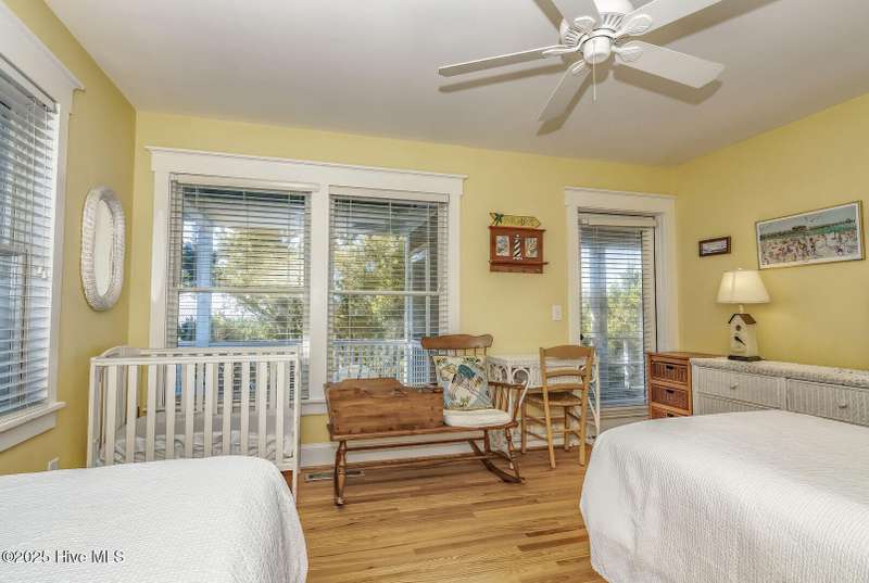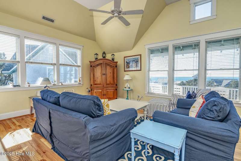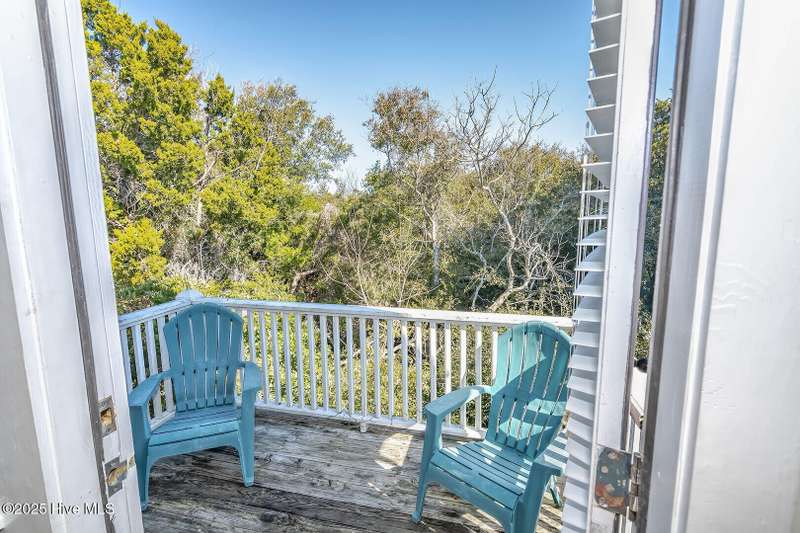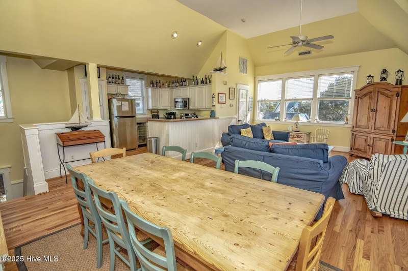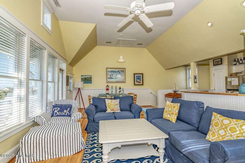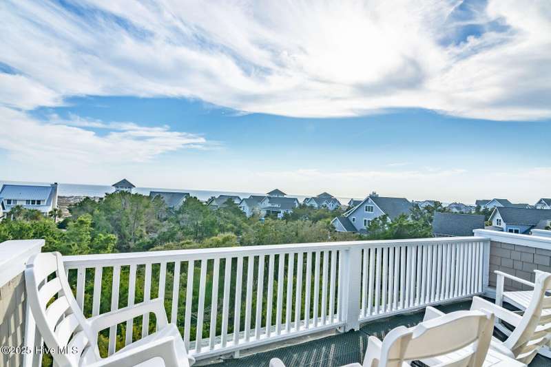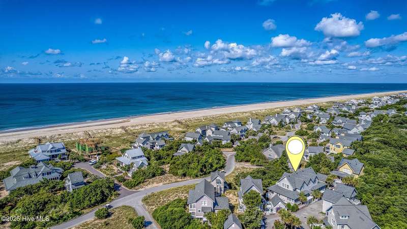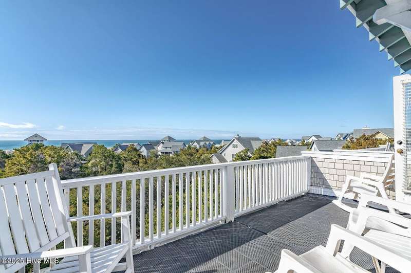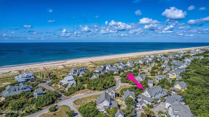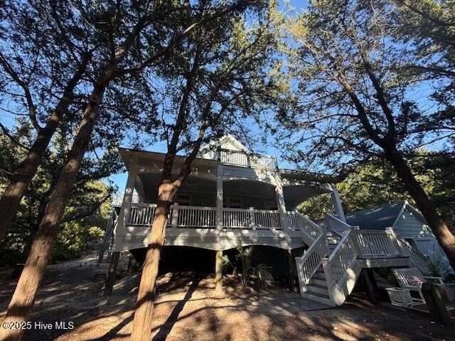 Ideally situated, perched on Bald Head's Dune Ridge to make the most of its Atlantic vistas, and tucked into a quiet cul-de-sac at the center of the Island, this four-bedroom, 3.5-bath reverse floor plan offers arbored curb appeal. From its white picket fence to its porch and through to warm hardwoods, you feel welcomed at this airy beach retreat. Its first appealing suite is a sunlit Queen with colonial touches, including knotty pine furniture, quilts, and a unique cradle rocker. This haven provides access to a generous beachside screen porch where you can relax, relishing salty breezes, the sound of waves on the shore, and glimpses of the water. Its private bath includes a tub/shower and a his/ her vanity. Beyond is a roomy, light-filled Twin bedroom with ocean views that also harbors a desk and a crib. It, too, has entree to the screen porch. Across, a sunny corner King bedroom, with three closets, shares the convenient hall bath with a tub/shower and dual vanity that is located between the rooms. A laundry completes this level. Upstairs reveals a bright, vaulted open floor plan showcasing azure seascapes through a plethora of front windows and doors. Admire the panorama from the cozy gathering space or out on the lengthy covered deck. The latter is where you'll sip your morning coffee and savor magnificent sunsets. The sun-drenched dining space is accented by chair railing and features a handsome farm table. Nearby, the kitchen also grants briny prospects and boasts a pantry and stainless appliances, including a wine cooler. For those seeking more privacy, the home's crofter houses a lovely Queen suite with its own desk, sitting area, full bath with tub/shower and a small porch backed by the Maritime Forest and offering peeks of the water. Close to the beach, clubs, the Conservancy, shops, and restaurants, this home conveys with two four-passenger golf carts. There is a Lifestyle membership available for separate purchase. Gross rental income for 2024 $42k