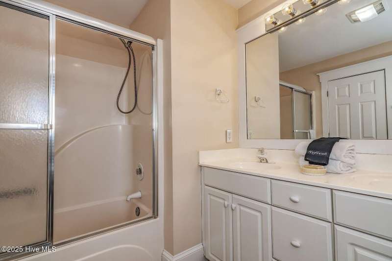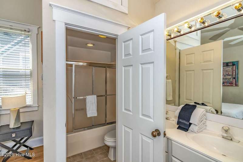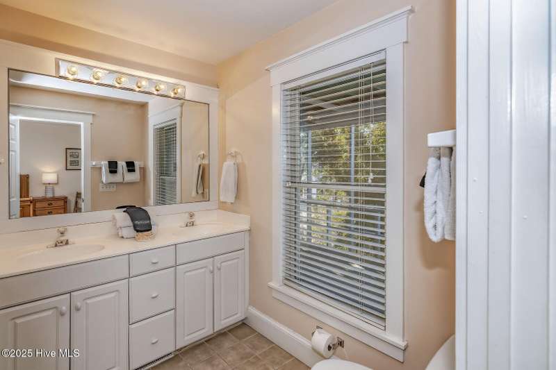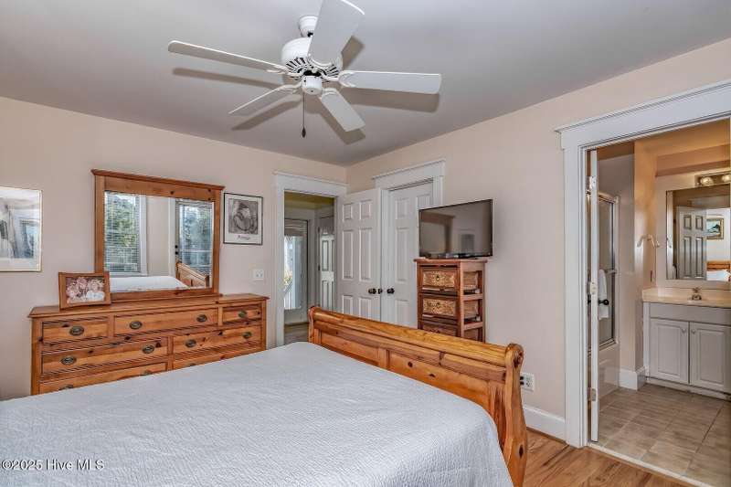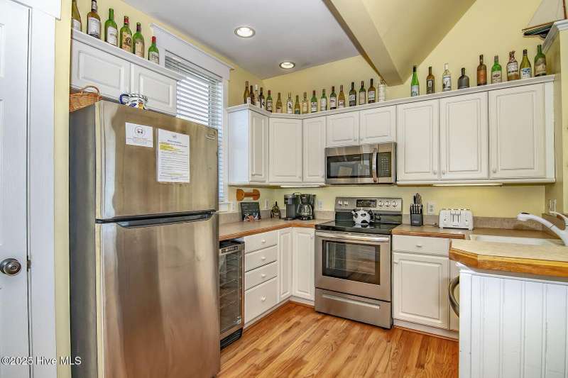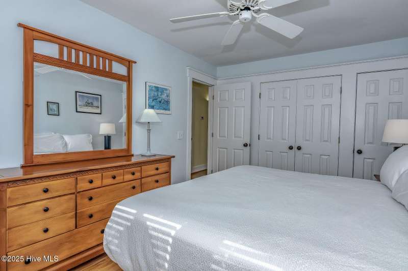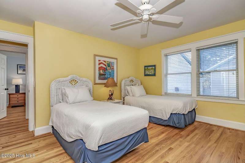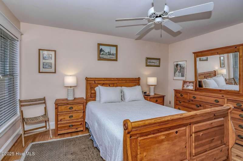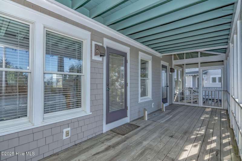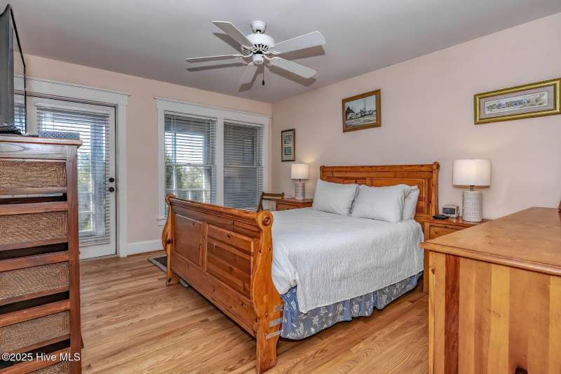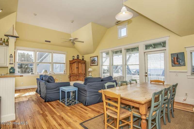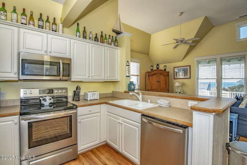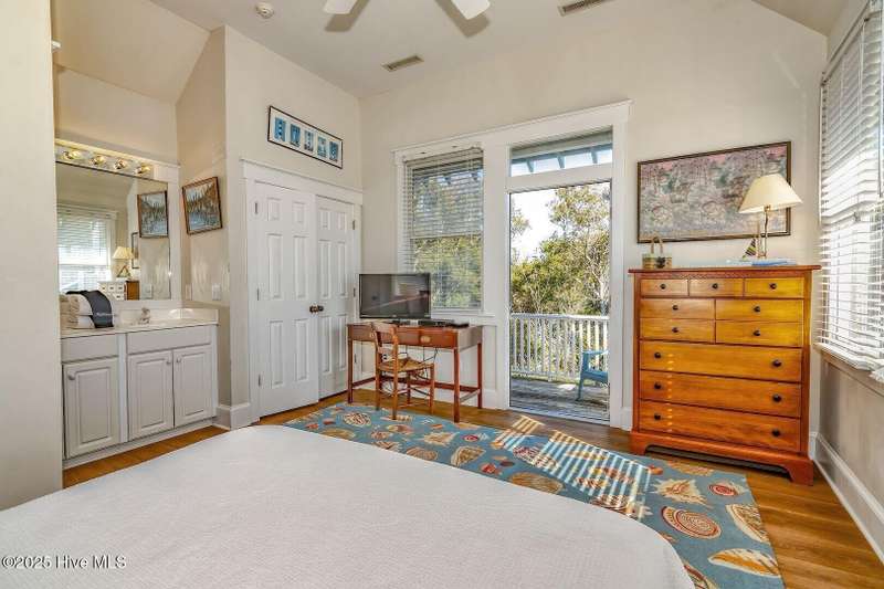 Ideally situated, perched on Bald Head's Dune Ridge to make the most of its Atlantic vistas, and tucked into a quiet cul-de-sac at the center of the Island, this four-bedroom, 3.5-bath reverse floor plan offers arbored curb appeal. From its white picket fence to its porch and through to warm hardwoods, you feel welcomed at this airy beach retreat. Its first appealing suite is a sunlit Queen with colonial touches, including knotty pine furniture, quilts, and a unique cradle rocker. This haven provides access to a generous beachside screen porch where you can relax, relishing salty breezes, the sound of waves on the shore, and glimpses of the water. Its private bath includes a tub/shower and a his/ her vanity. Beyond is a roomy, light-filled Twin bedroom with ocean views that also harbors a desk and a crib. It, too, has entree to the screen porch. Across, a sunny corner King bedroom, with three closets, shares the convenient hall bath with a tub/shower and dual vanity that is located between the rooms. A laundry completes this level. Upstairs reveals a bright, vaulted open floor plan showcasing azure seascapes through a plethora of front windows and doors. Admire the panorama from the cozy gathering space or out on the lengthy covered deck. The latter is where you'll sip your morning coffee and savor magnificent sunsets. The sun-drenched dining space is accented by chair railing and features a handsome farm table. Nearby, the kitchen also grants briny prospects and boasts a pantry and stainless appliances, including a wine cooler. For those seeking more privacy, the home's crofter houses a lovely Queen suite with its own desk, sitting area, full bath with tub/shower and a small porch backed by the Maritime Forest and offering peeks of the water. Close to the beach, clubs, the Conservancy, shops, and restaurants, this home conveys with two four-passenger golf carts. There is a Lifestyle membership available for separate purchase. Gross rental income for 2024 $42k